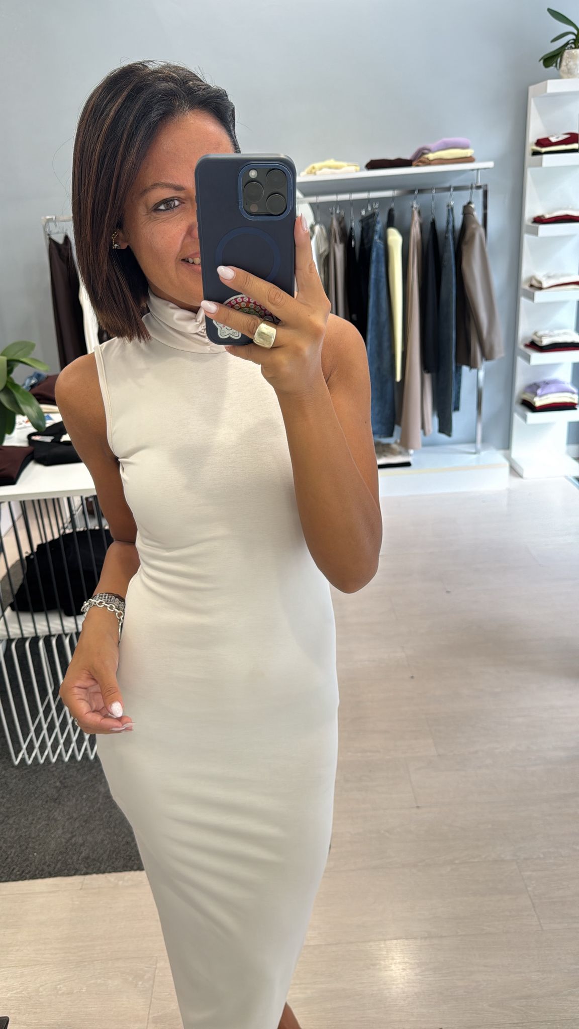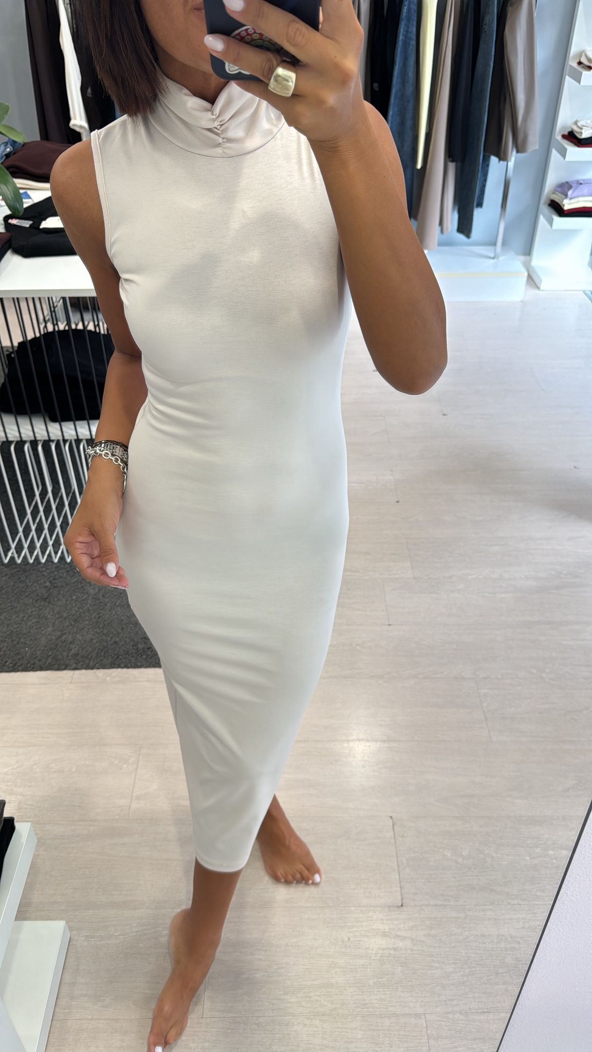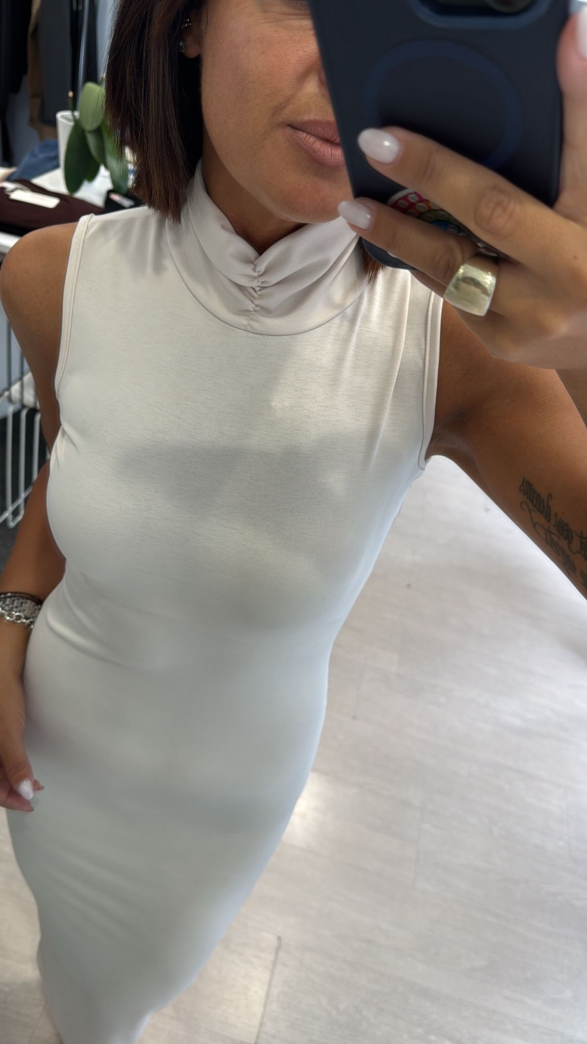 Abito modello tubino, smanicato con collo a lupetto drappeggiato, lunghezza alla caviglia