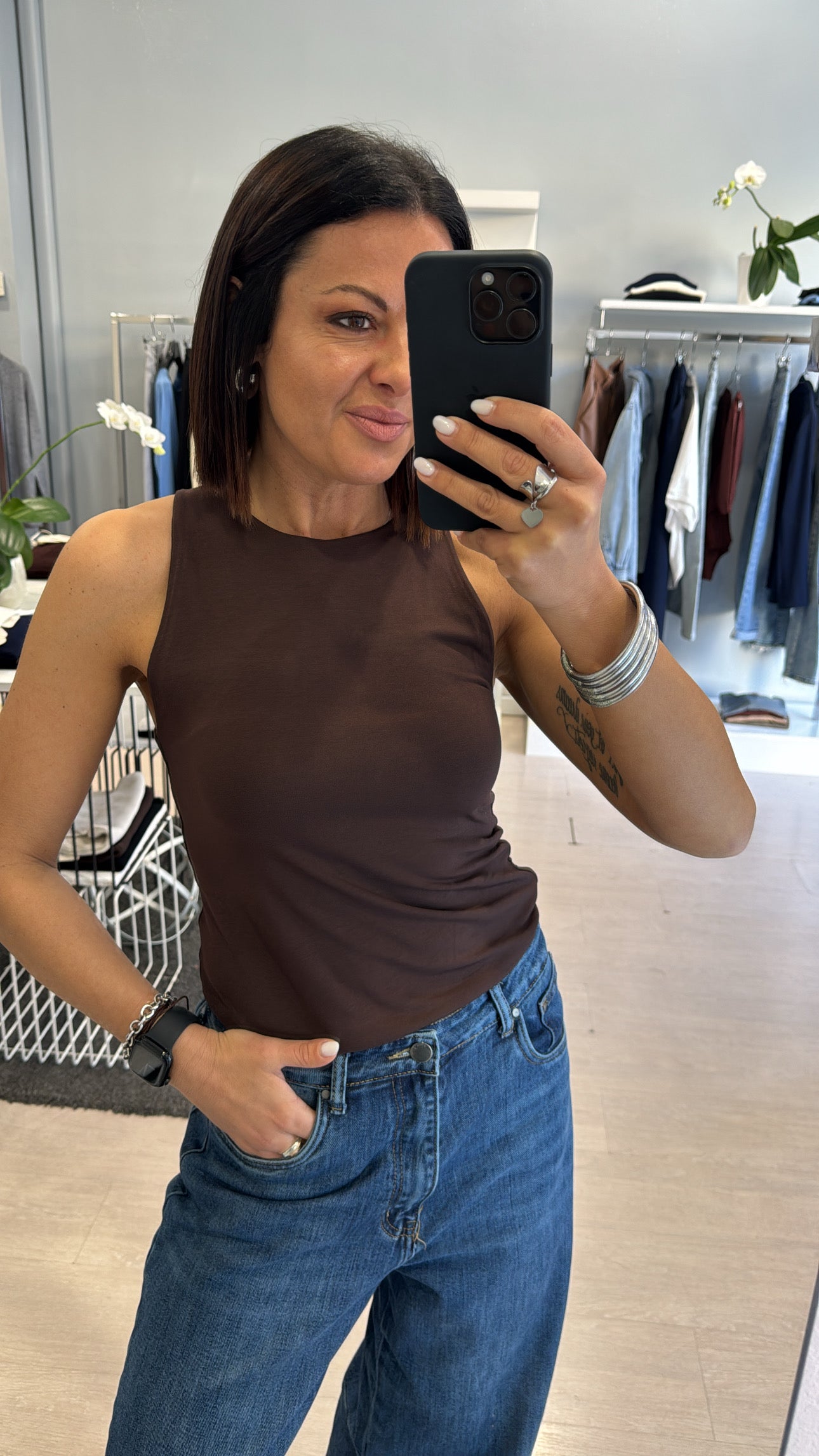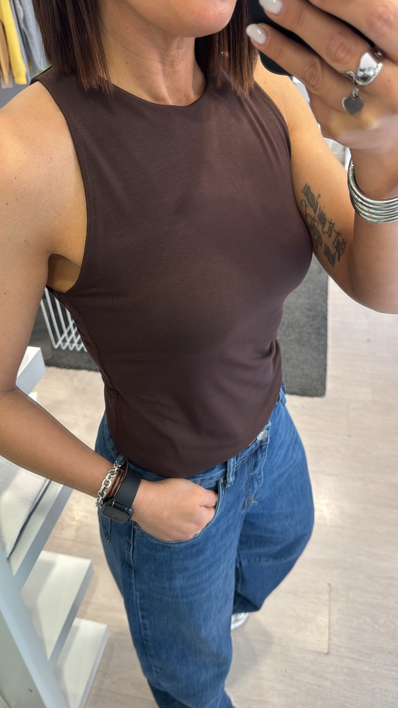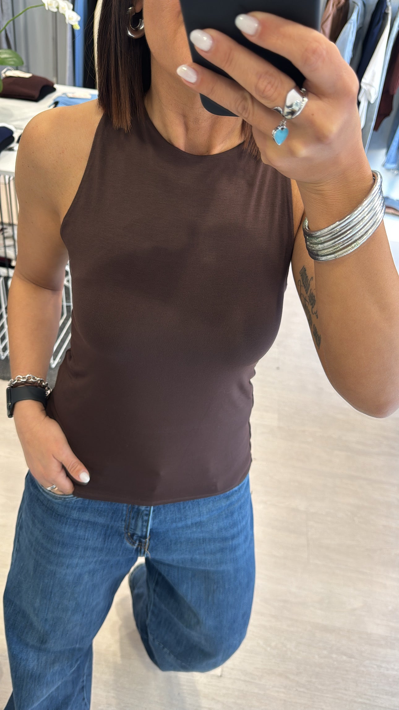 Canotta Kontatto doppiata non trasparente, scollatura all'americana, modello sfiancato, lunghezza regolare taglia unica colore: cioccolato 95%vi 5%ea MISURE DELLA VALE...