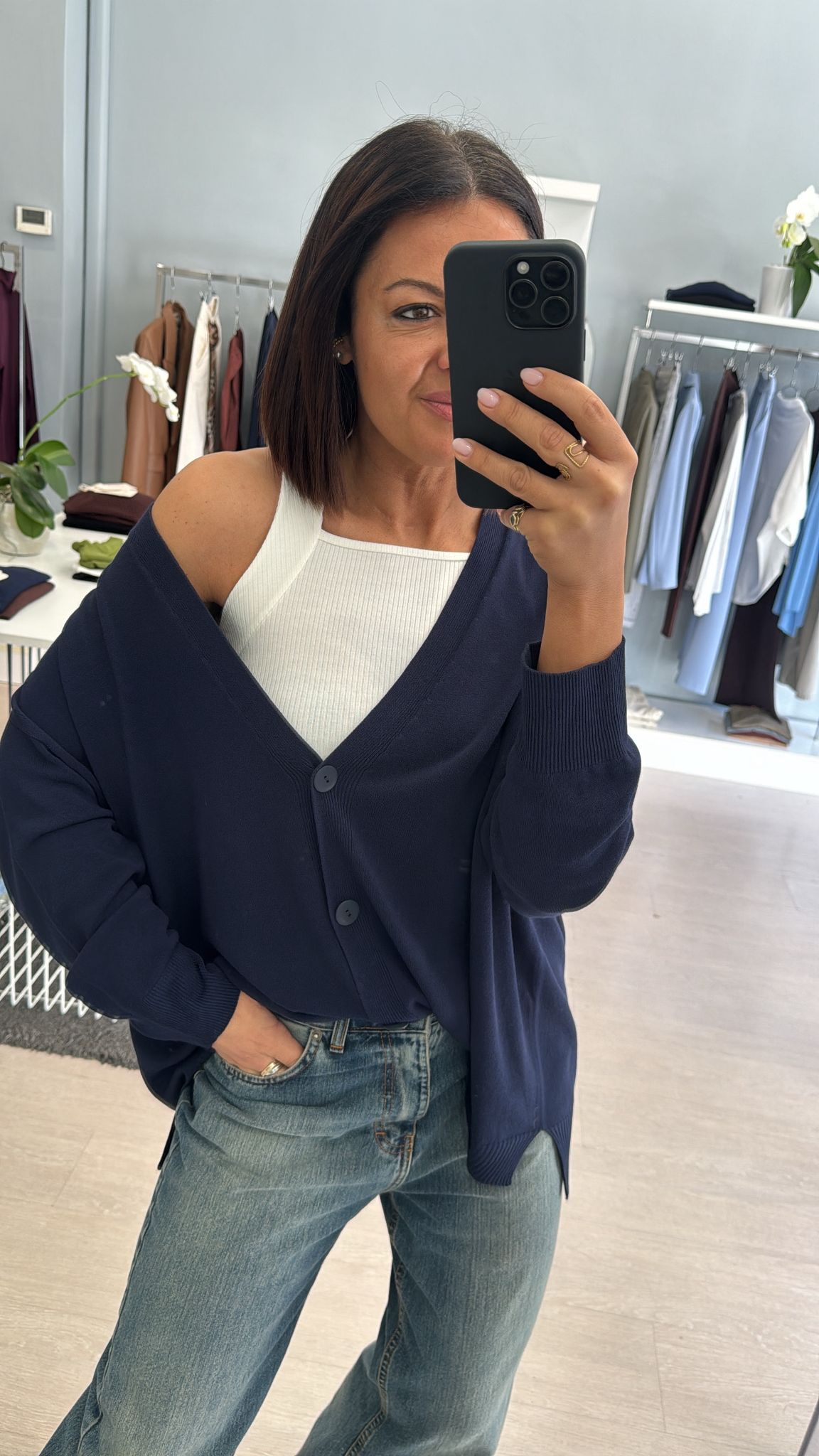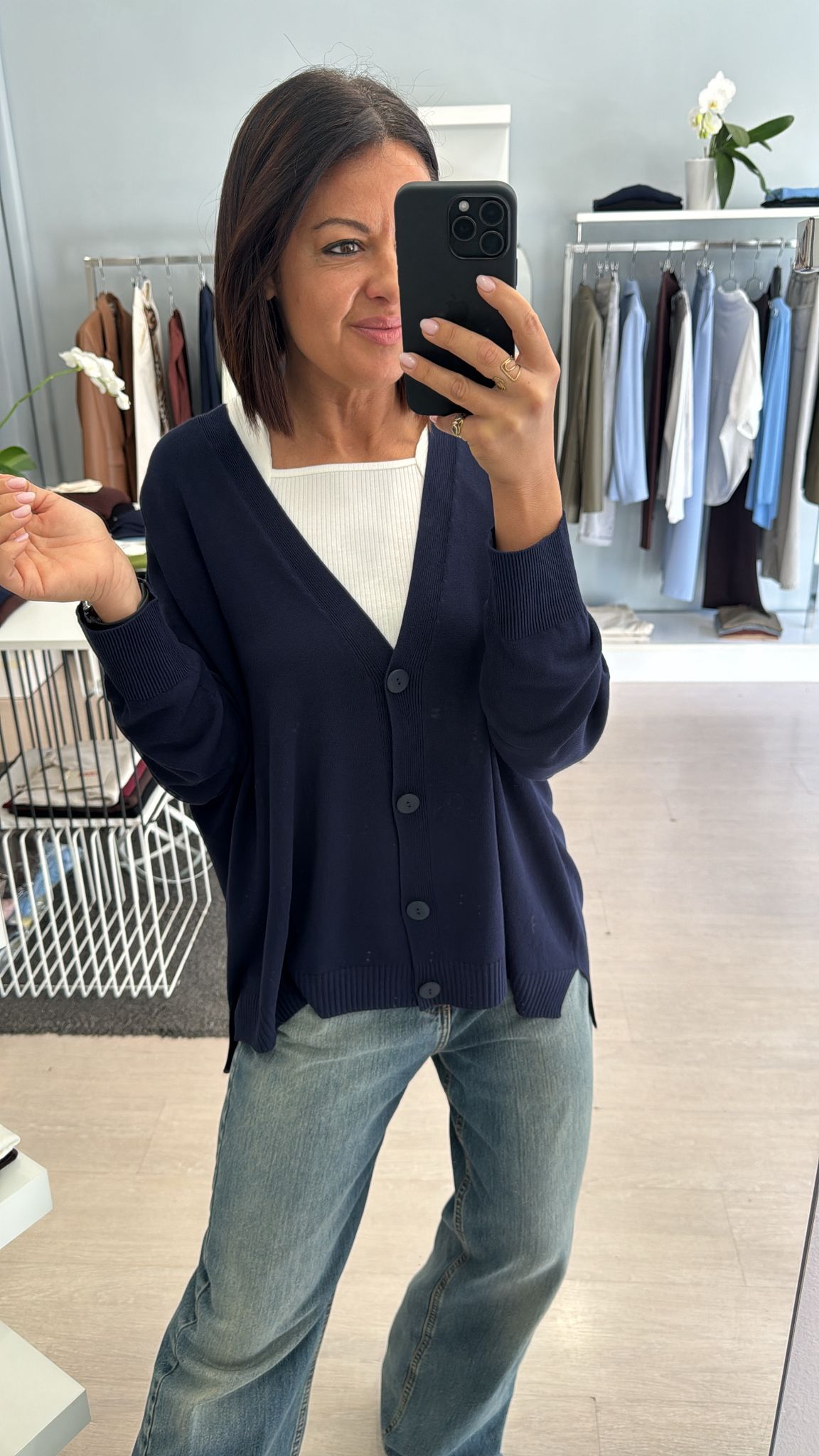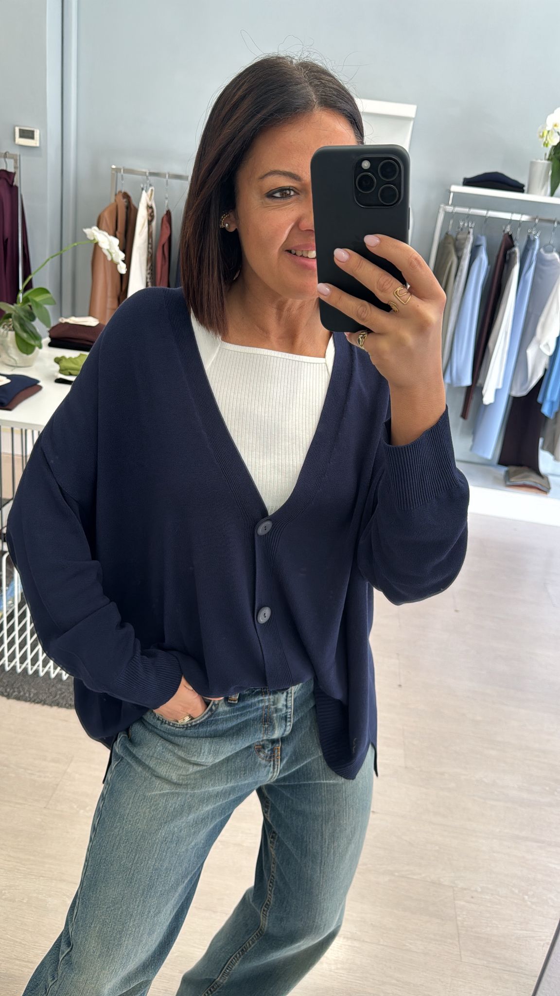 Cardigan Kontatto, modello over, lunghezza al fianco, abbottonatura centrale tono su tono, scollatura a V spacchetti sul laterale