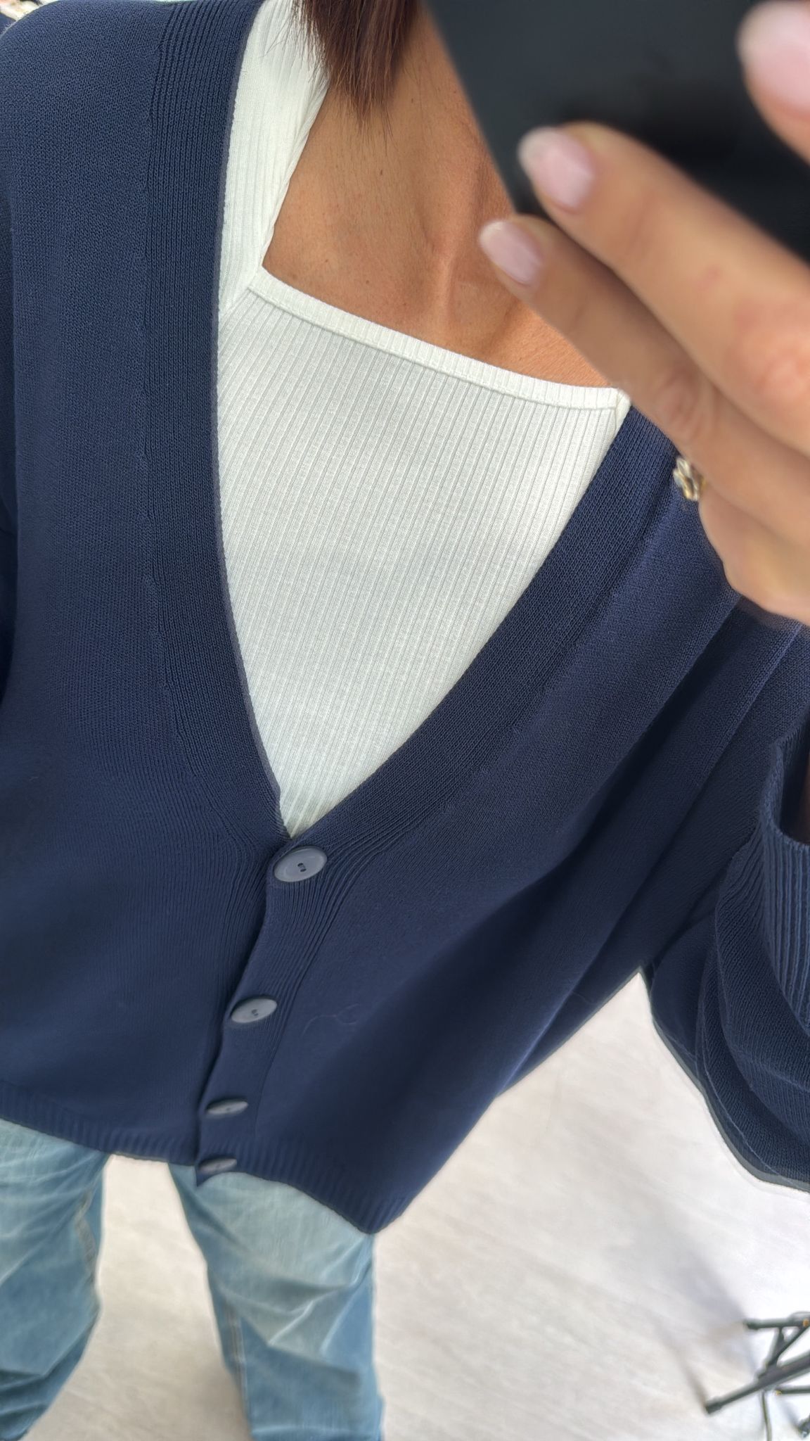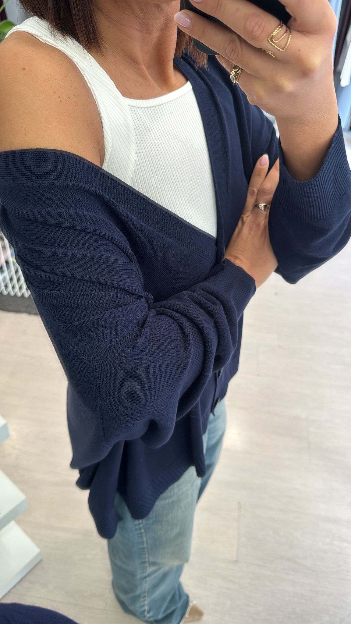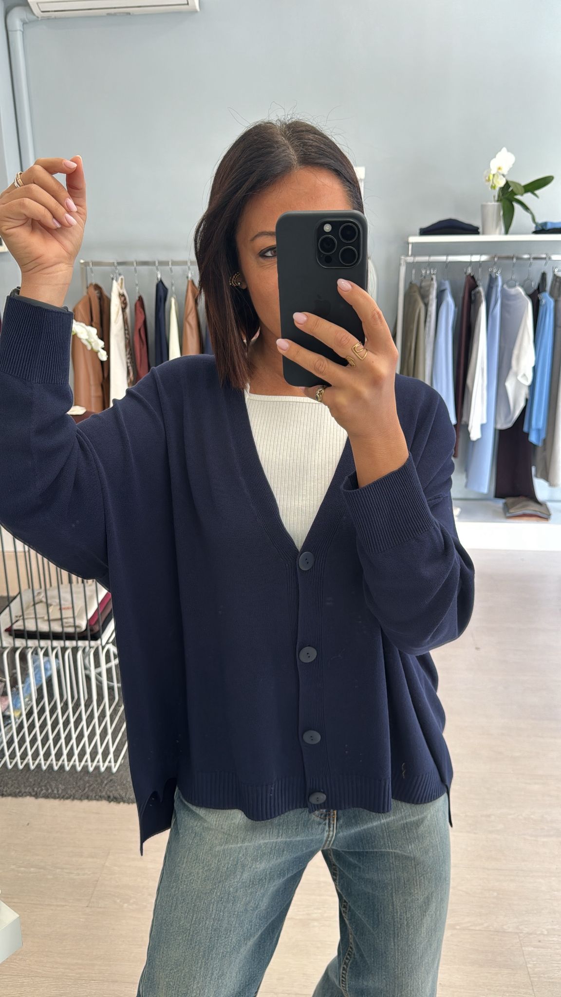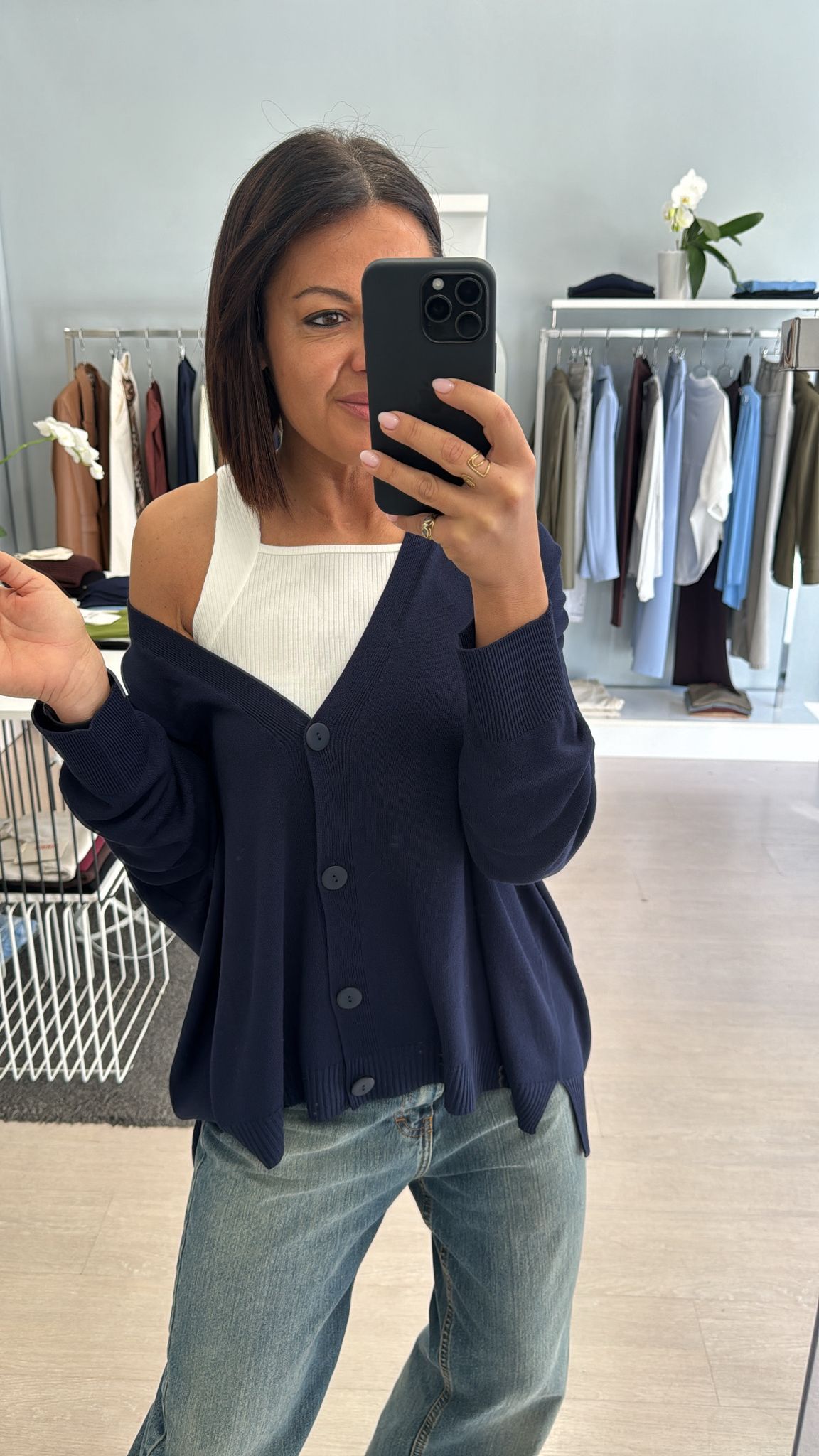 Cardigan Kontatto, modello over, lunghezza al fianco, abbottonatura centrale tono su tono, scollatura a V spacchetti sul laterale