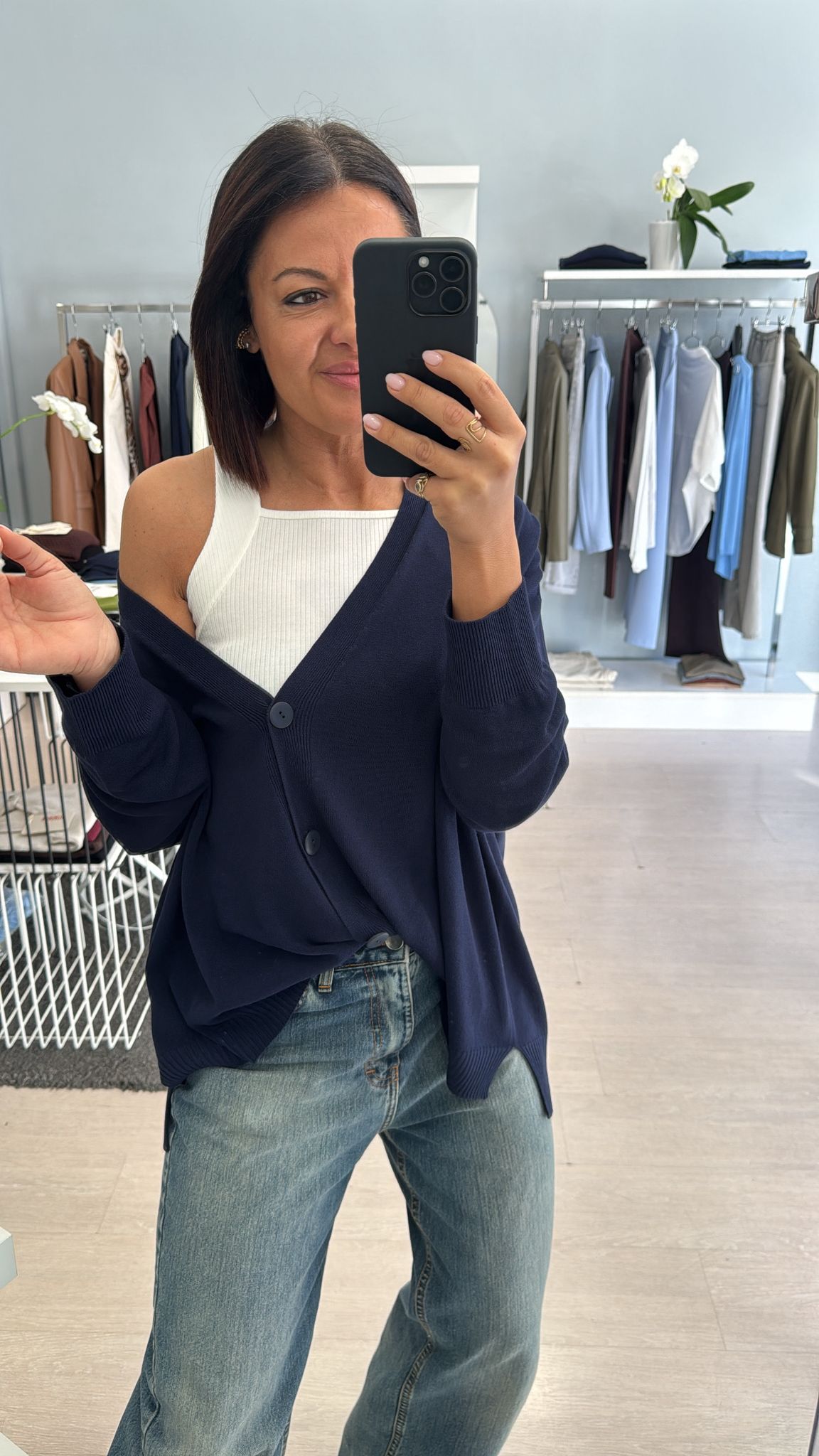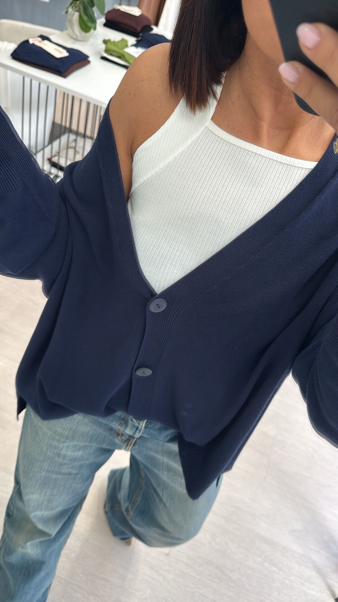 Cardigan Kontatto, modello over, lunghezza al fianco, abbottonatura centrale tono su tono, scollatura a V spacchetti sul laterale vestibilità over...
