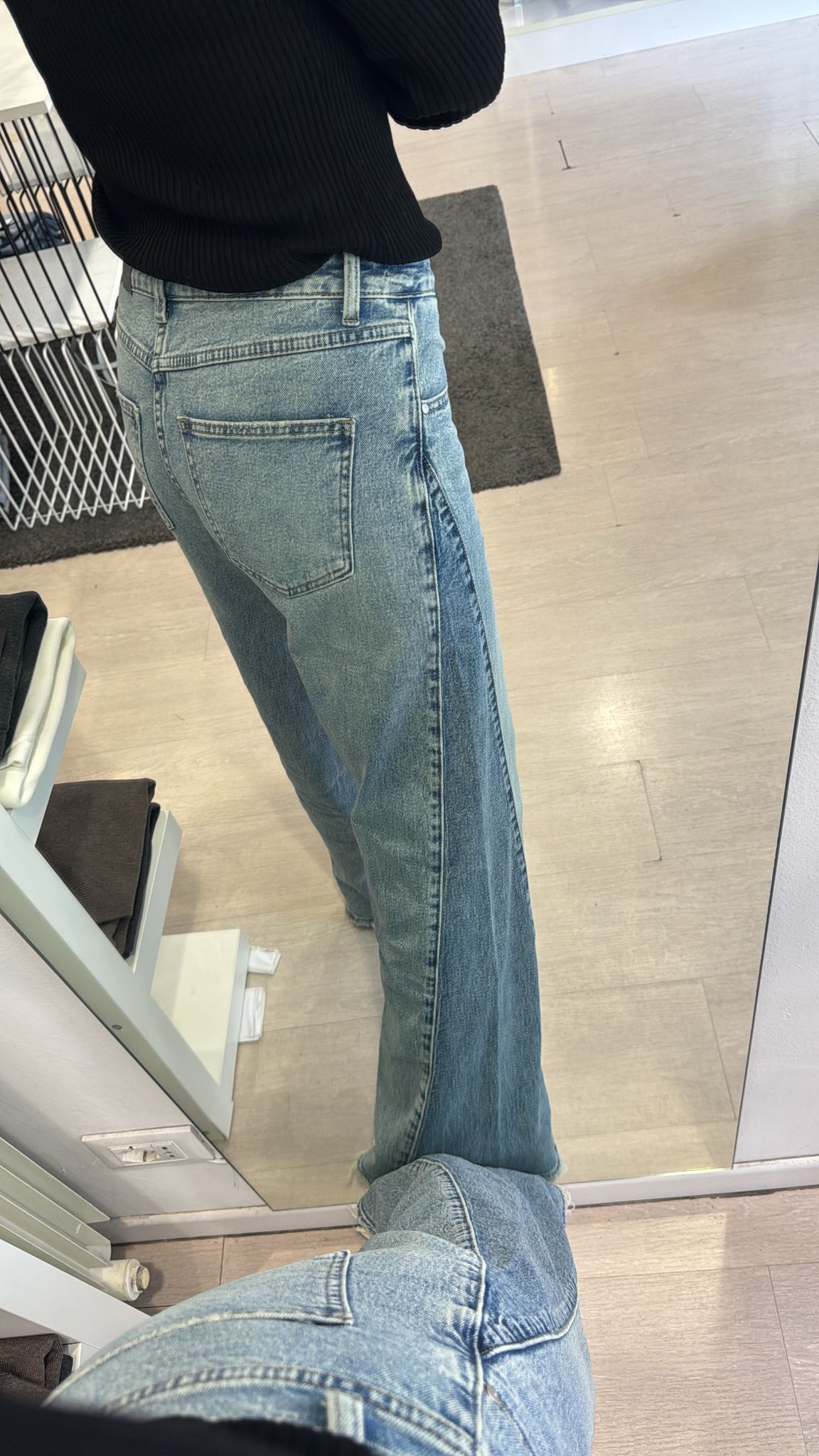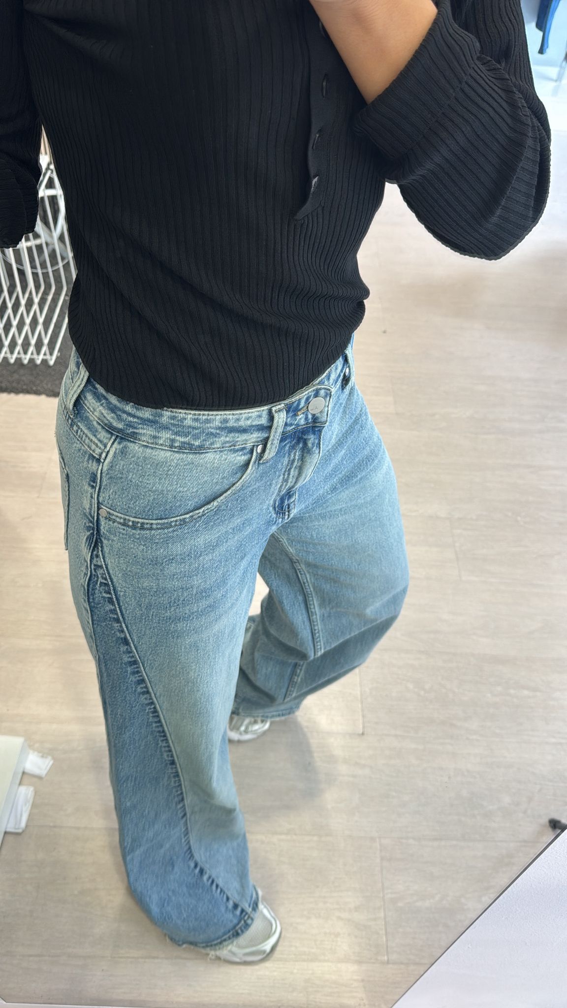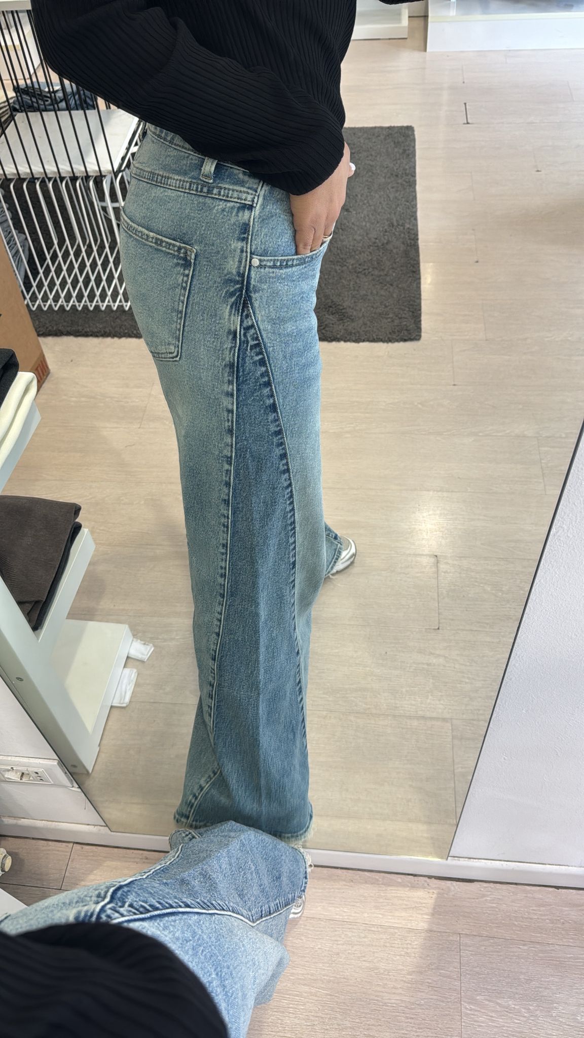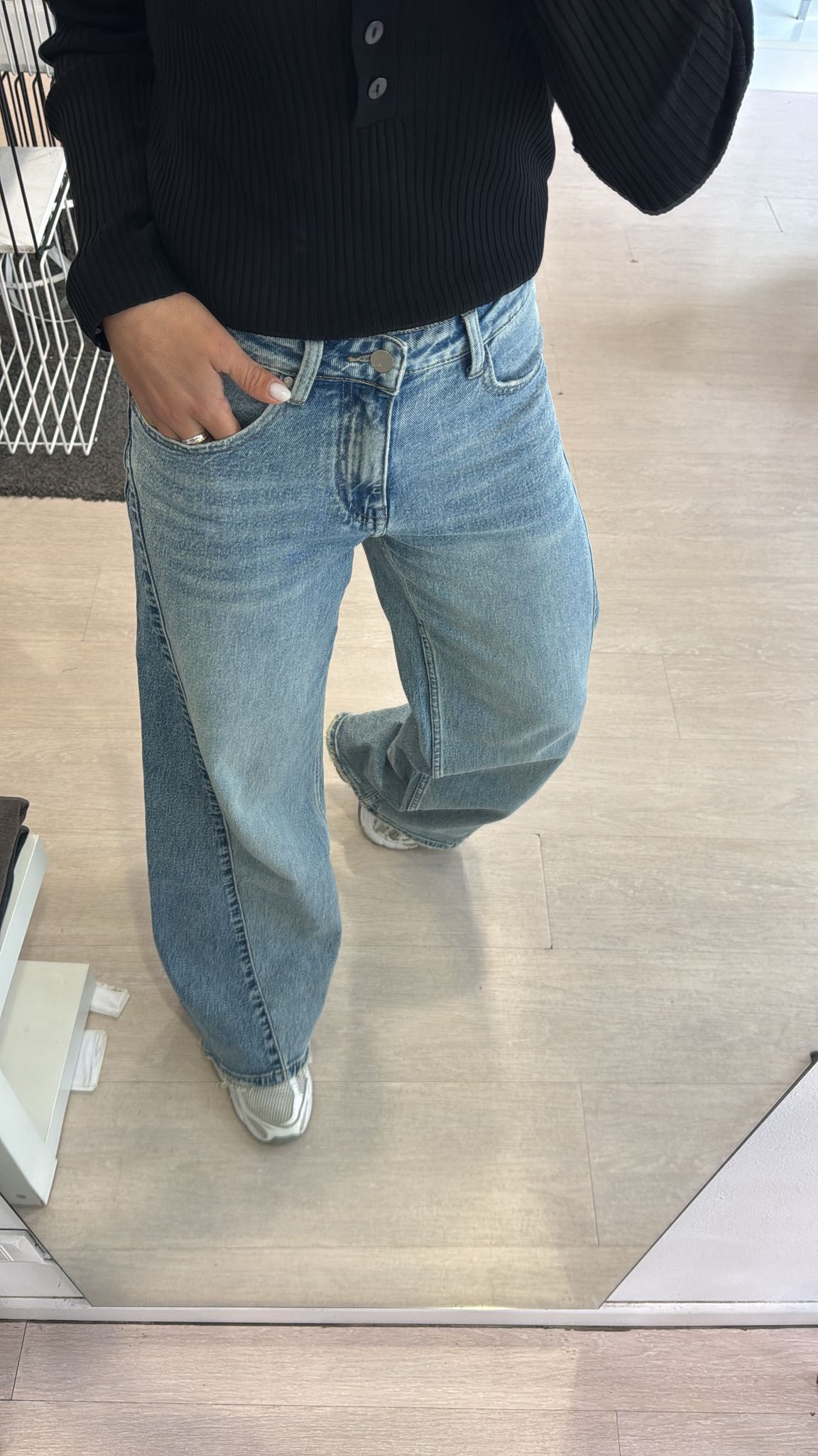 Denim modello palazzo, vita sotto l'ombelico, sfiancato su vita e sfianchi per poi allargarsi sulla gamba, denim chiaro frontale e sui lati denim medio, fondo del pantalone leggermente sfrangiato