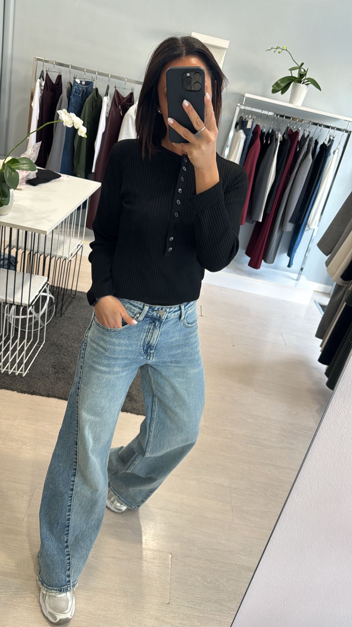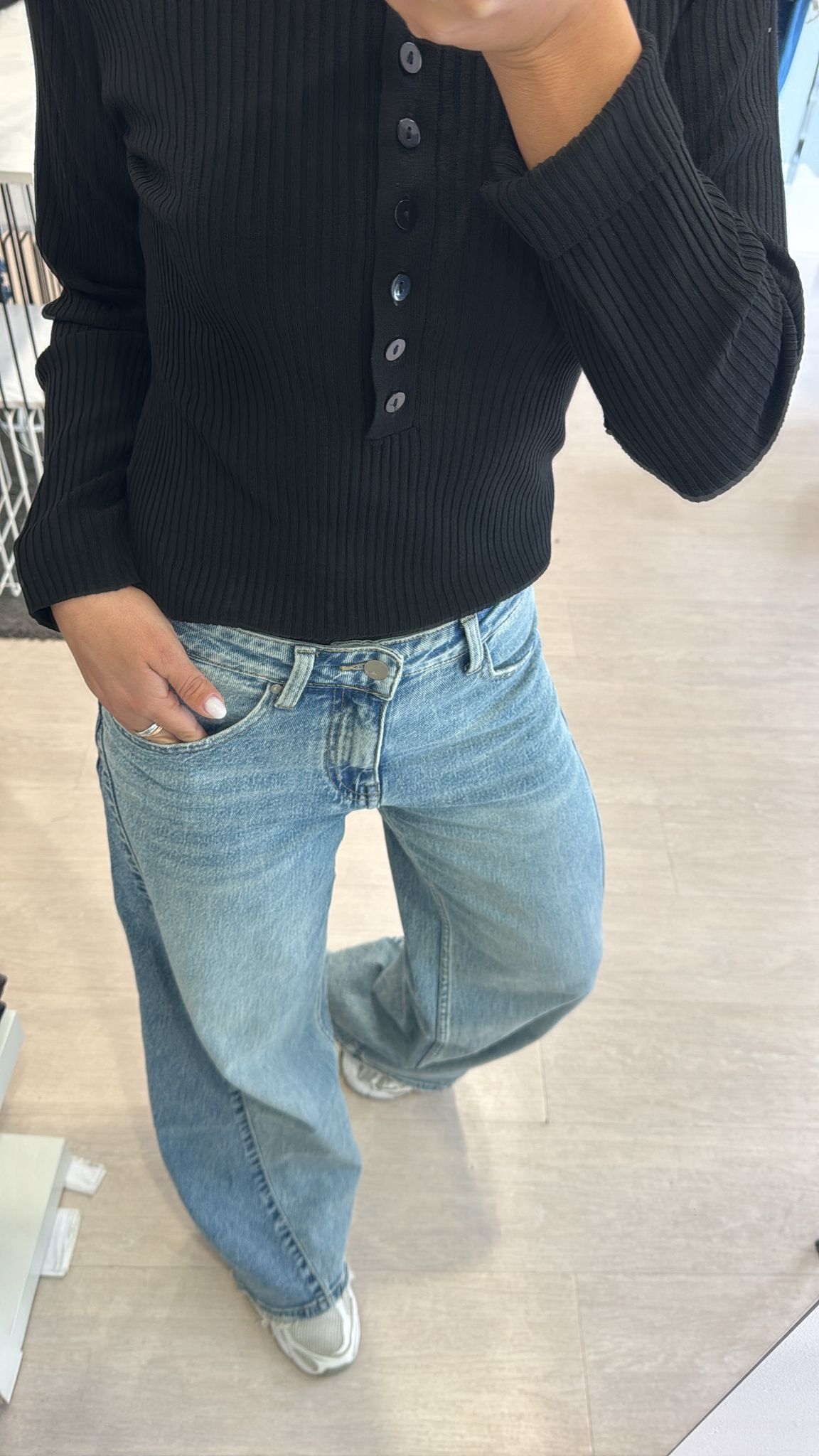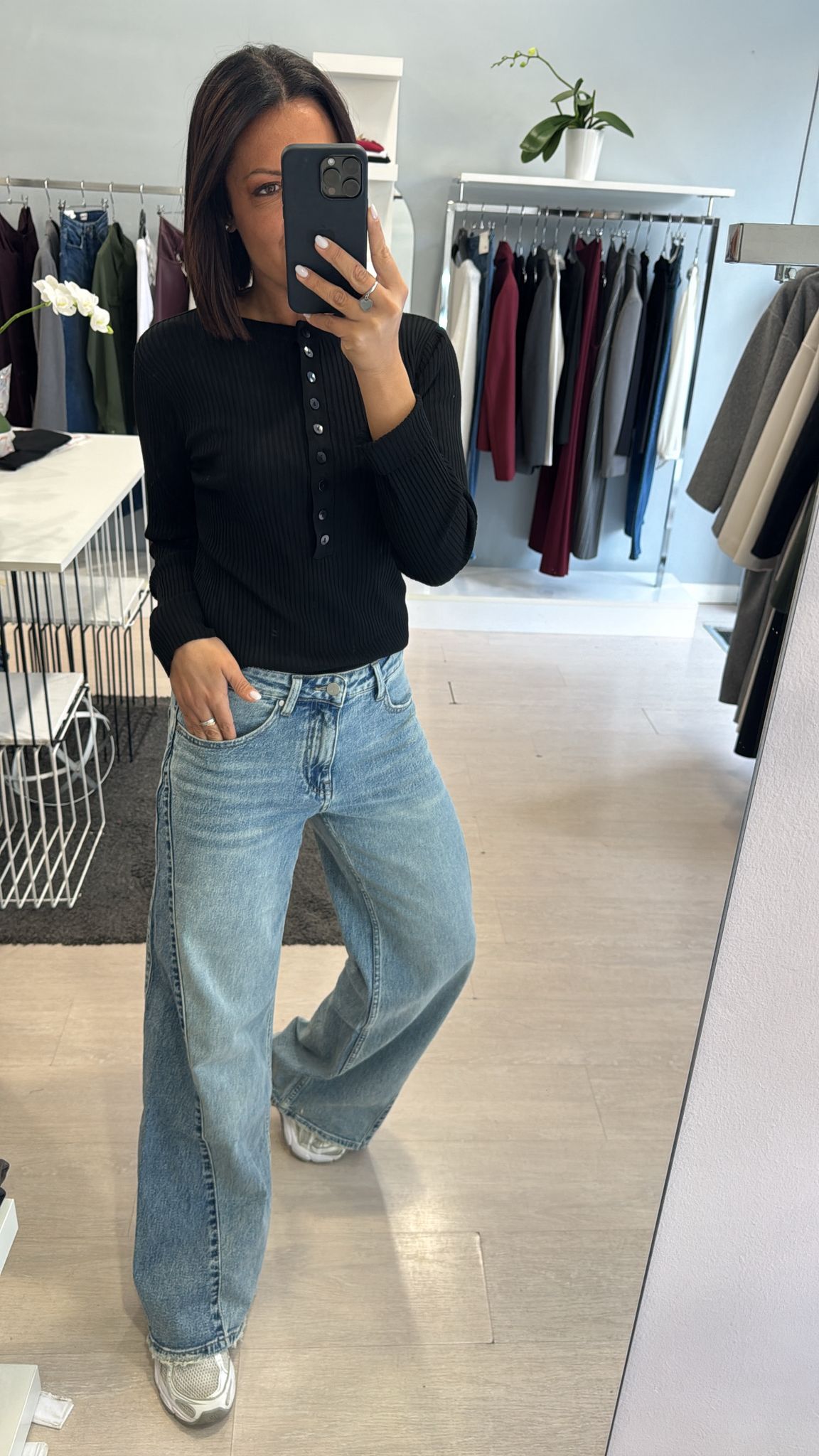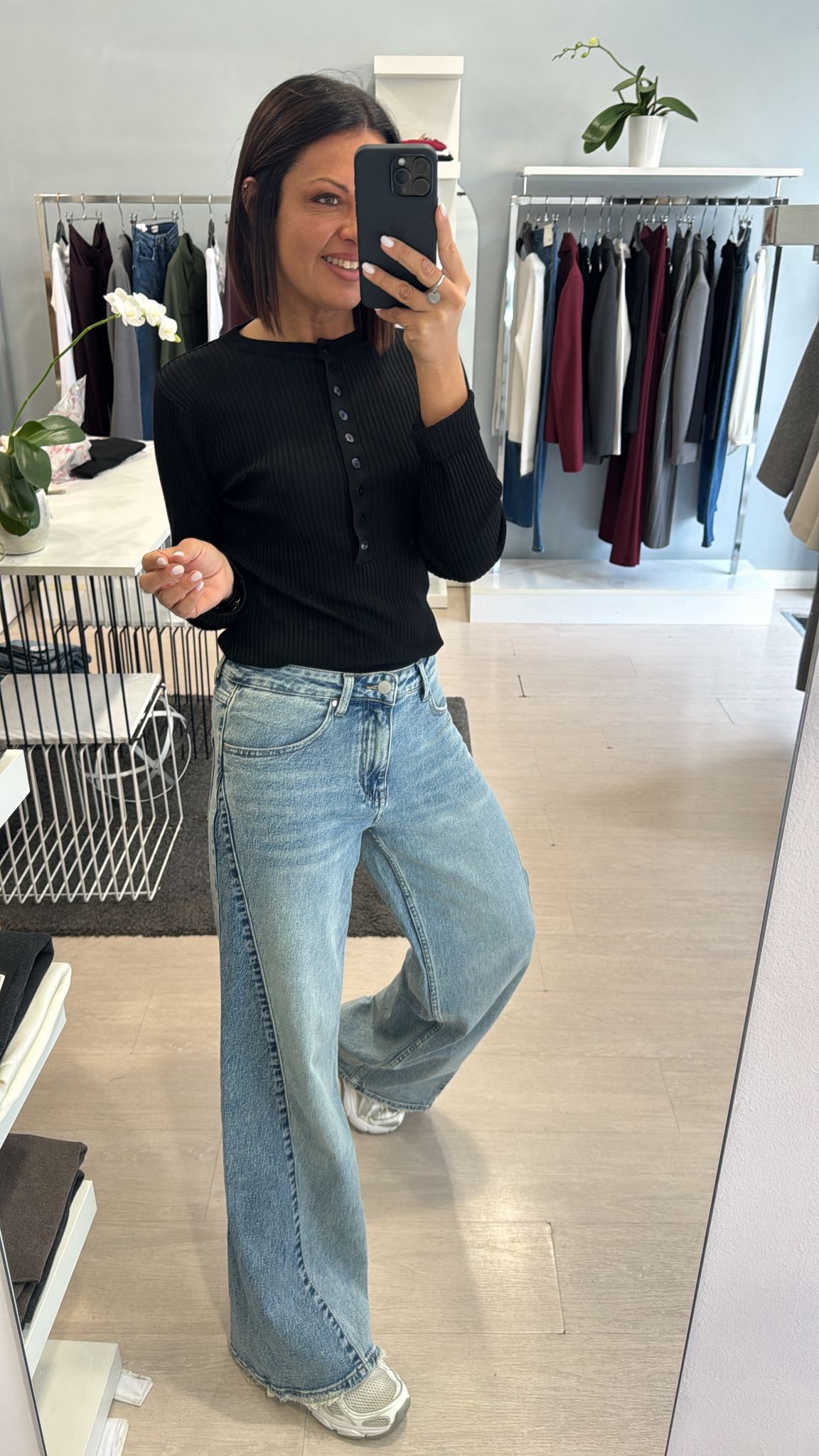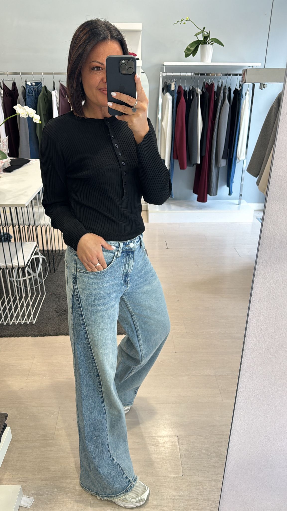 Denim modello palazzo, vita sotto l'ombelico, sfiancato su vita e sfianchi per poi allargarsi sulla gamba, denim chiaro frontale e sui lati denim medio, fondo del pantalone leggermente sfrangiato