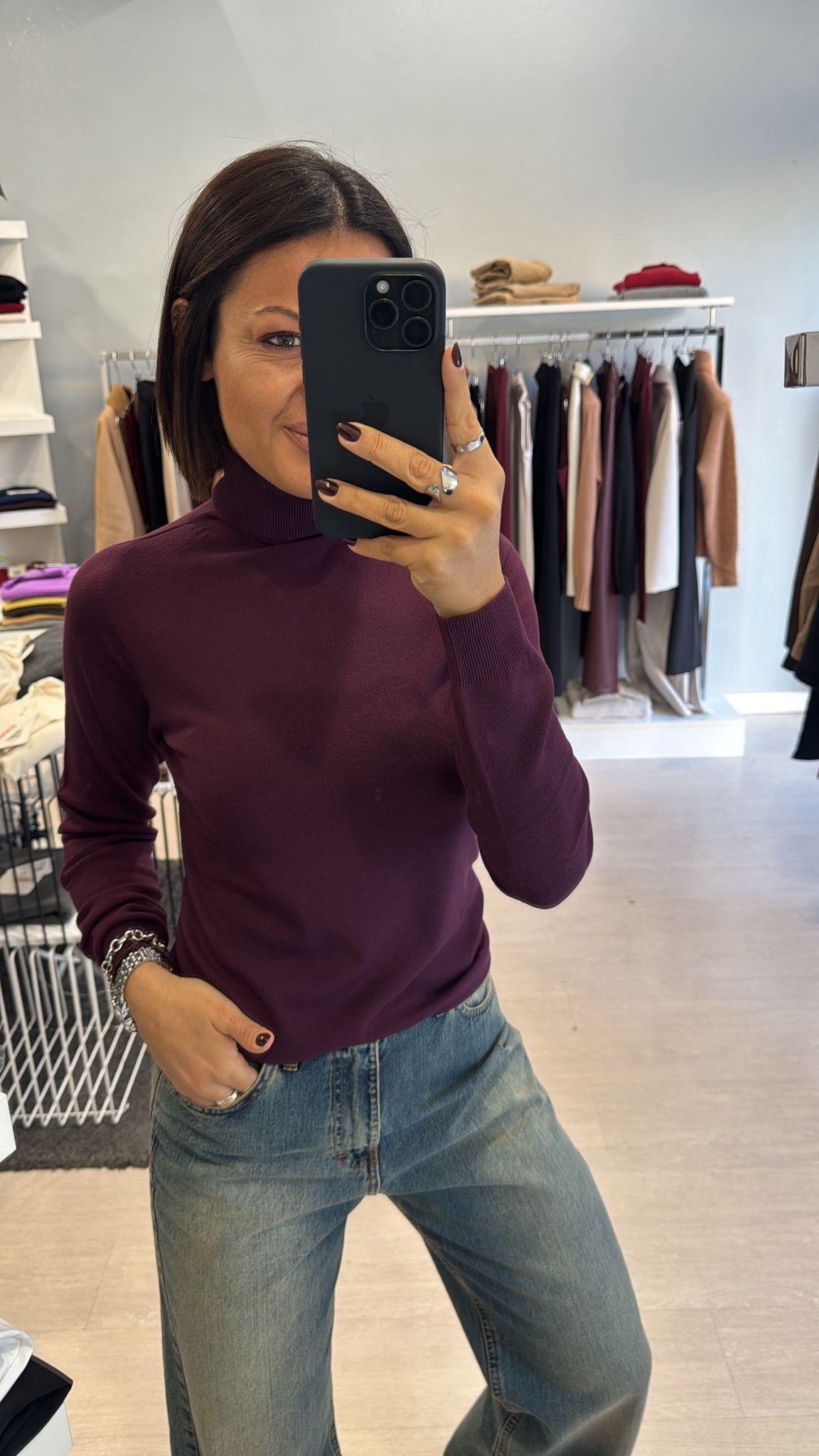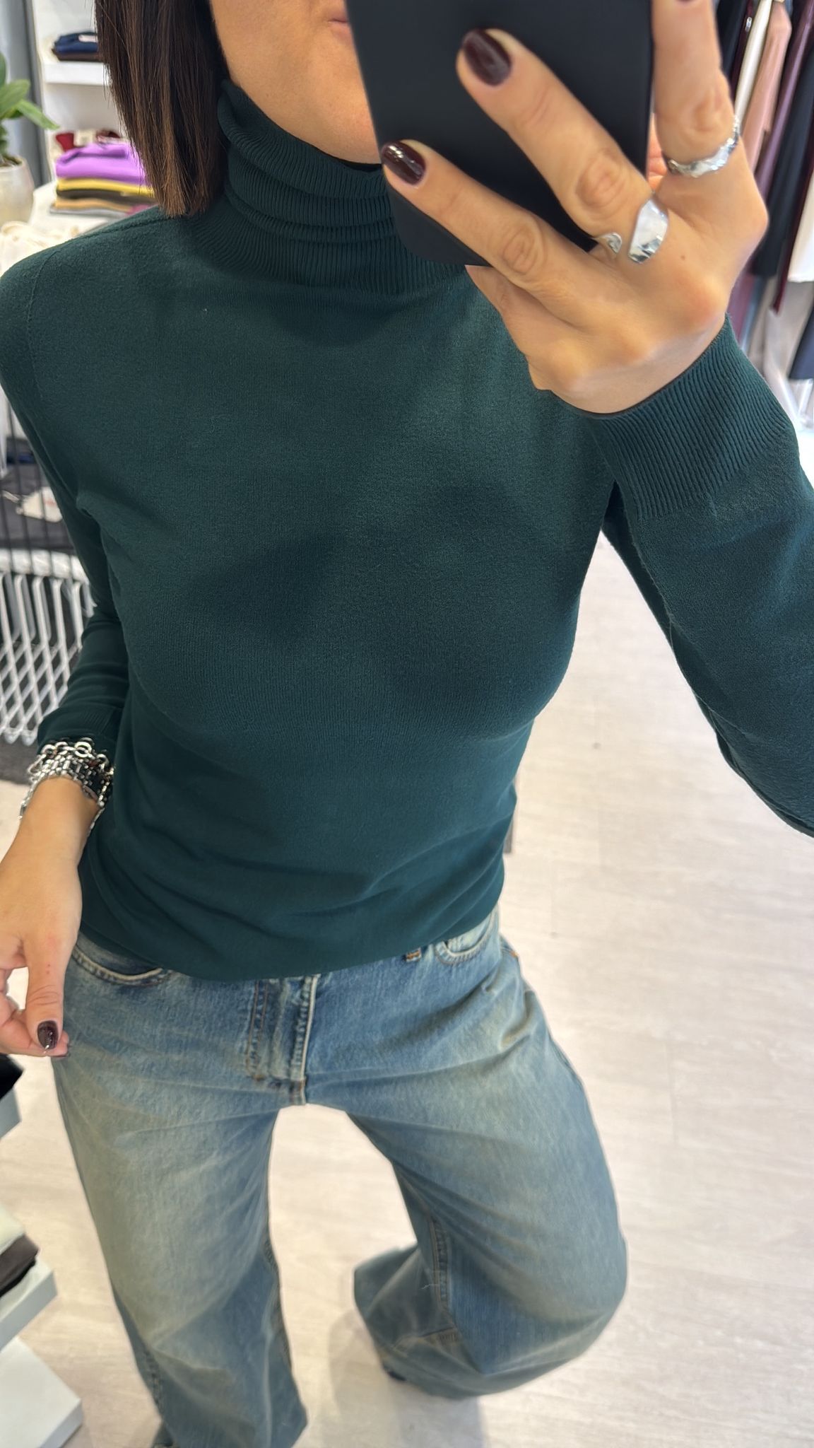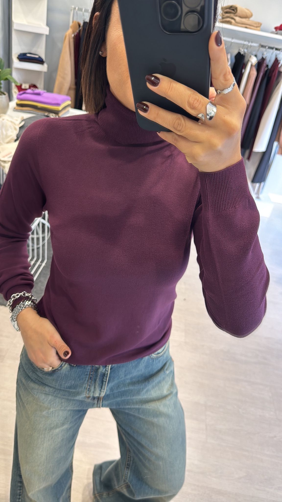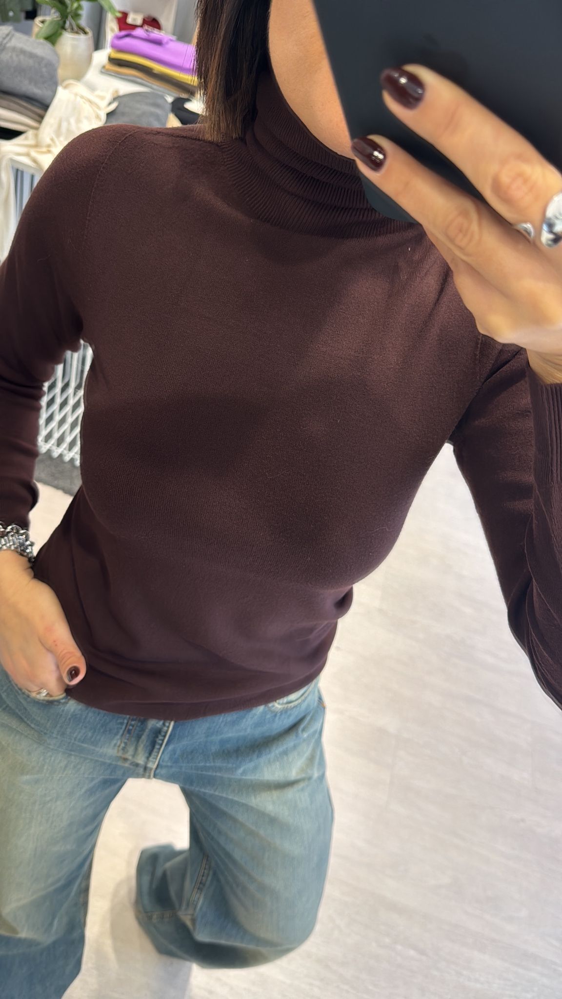 Dolcevita rasato modello basico continuativo, sfiancato ma non stretto, lunghezza regolare vestibilità regolare taglia unica colore: bianco-nero-melanzana-cioccolato-verde bosco-grigio 63%VI 37%PA...