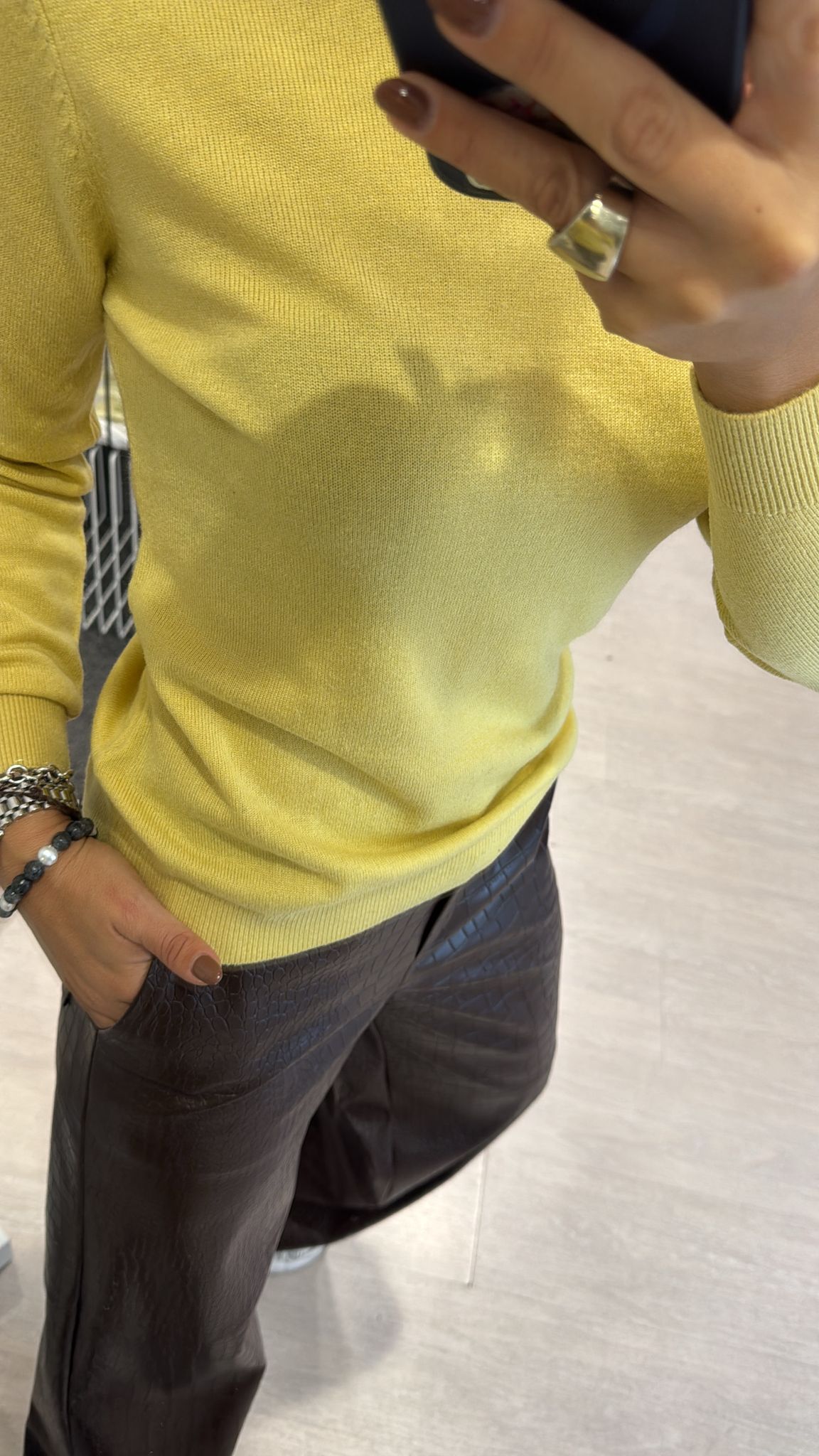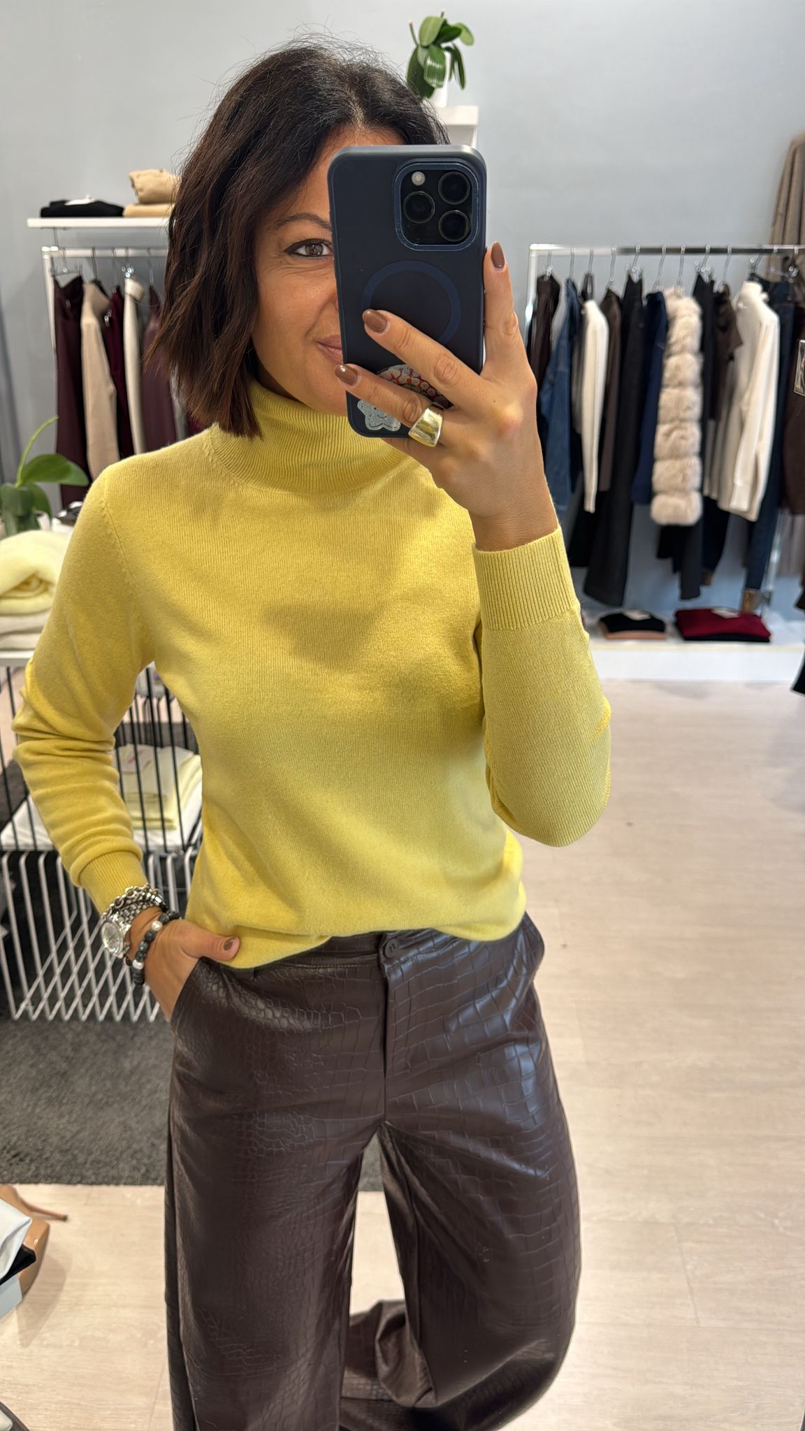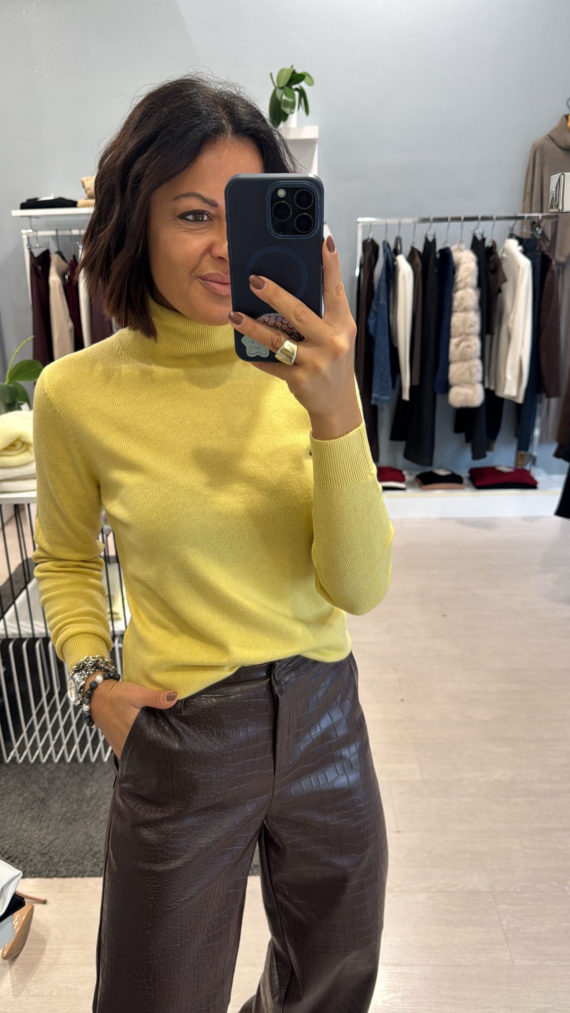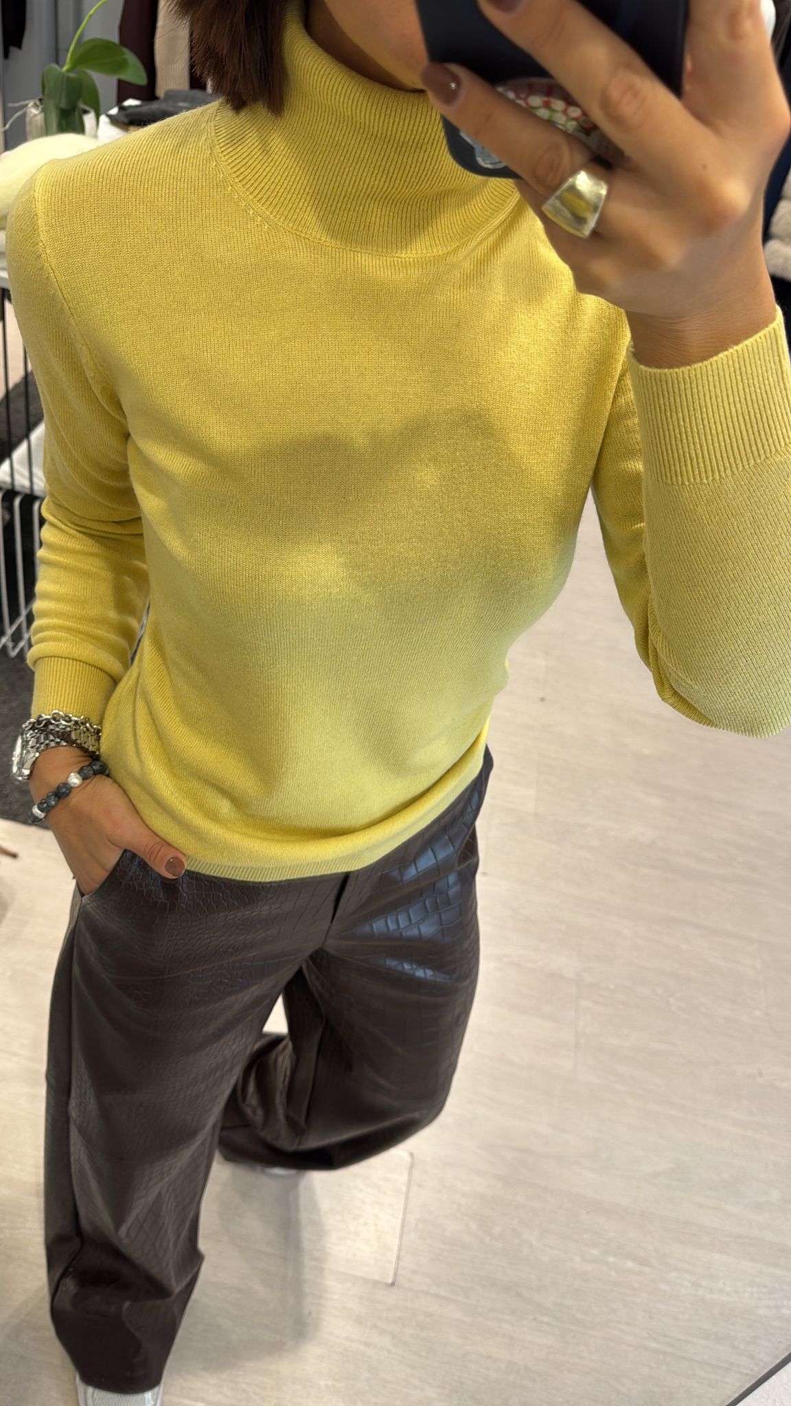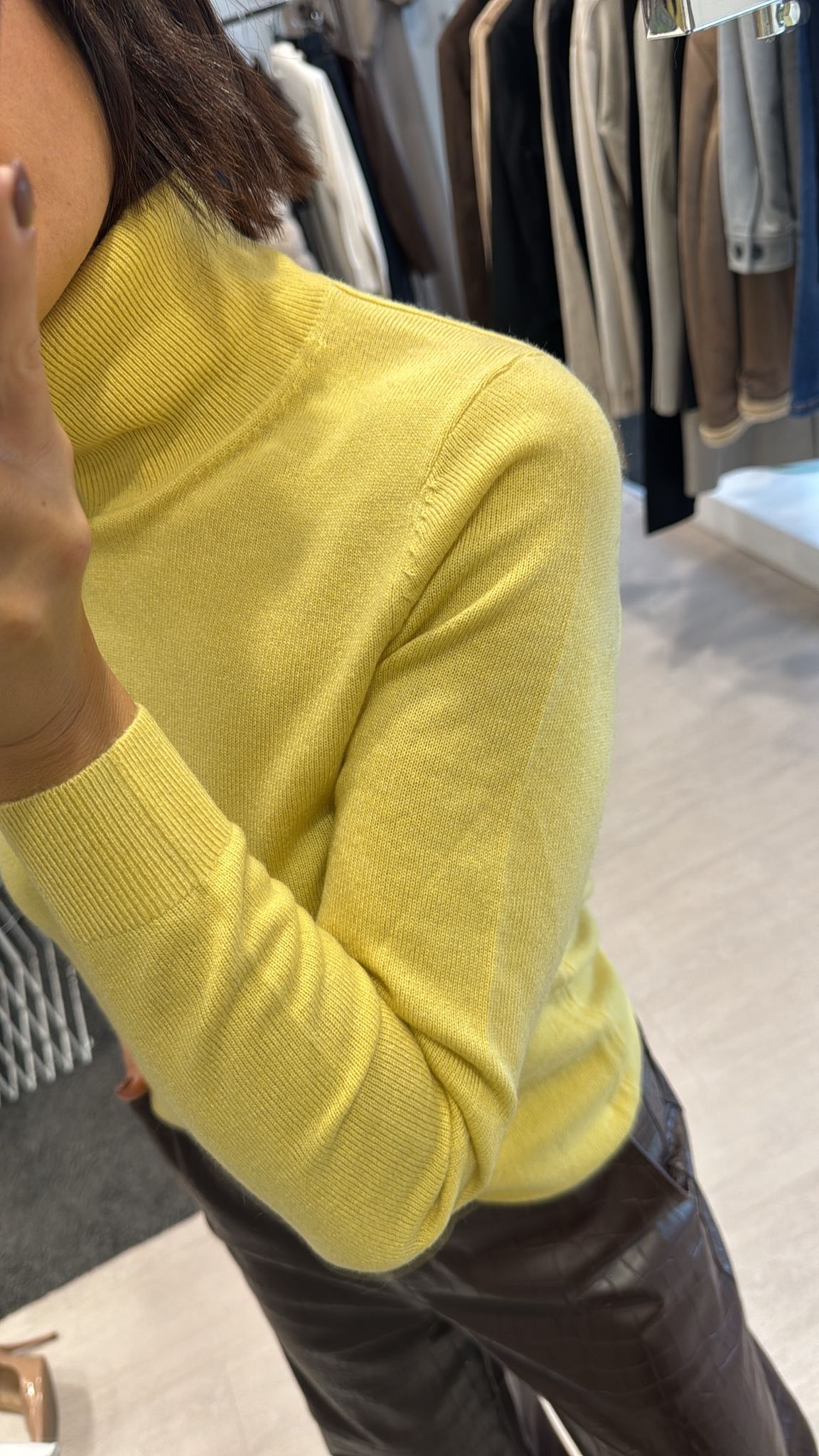 Dolcevita modello sfiancato ma non stretto, lunghezza regolare, finitura su polsi, collo e finale della maglia
