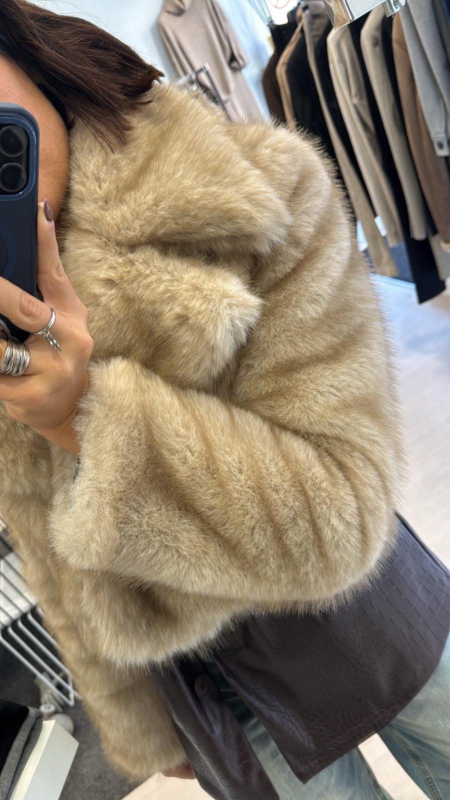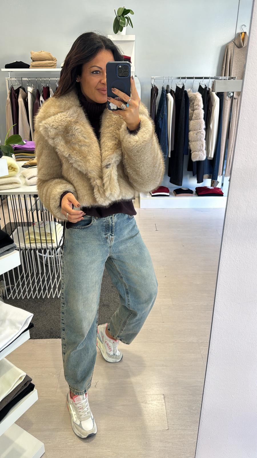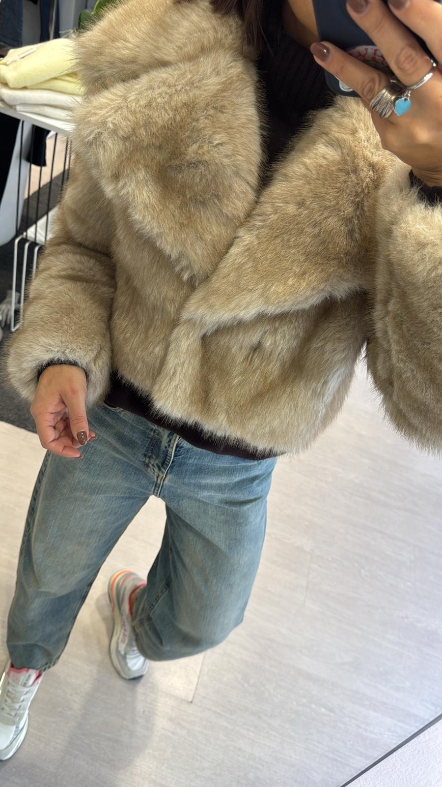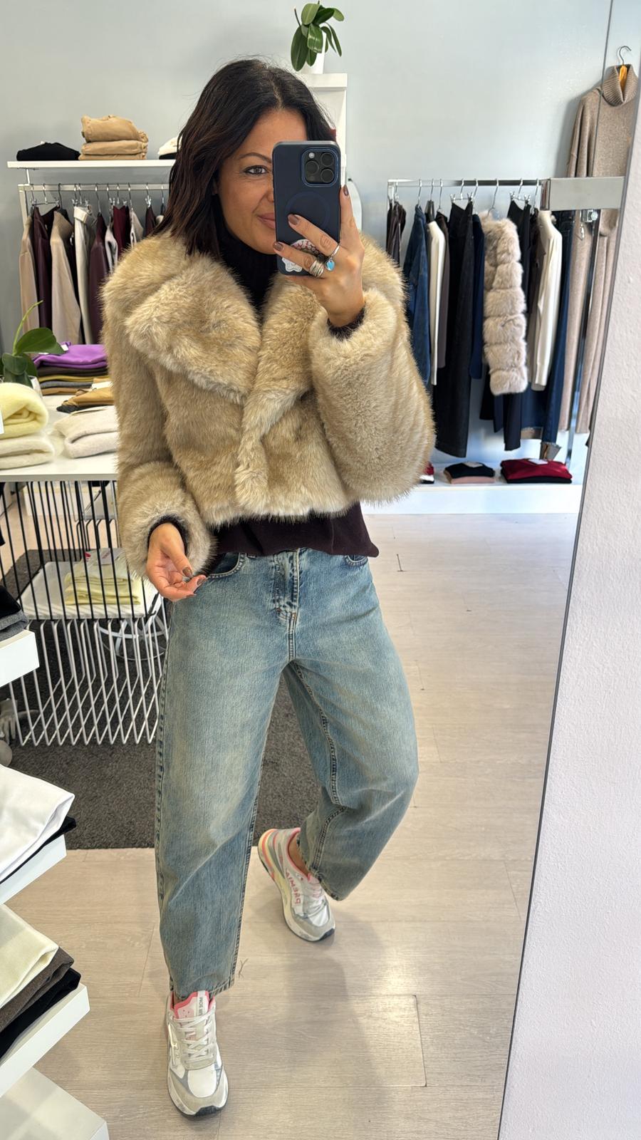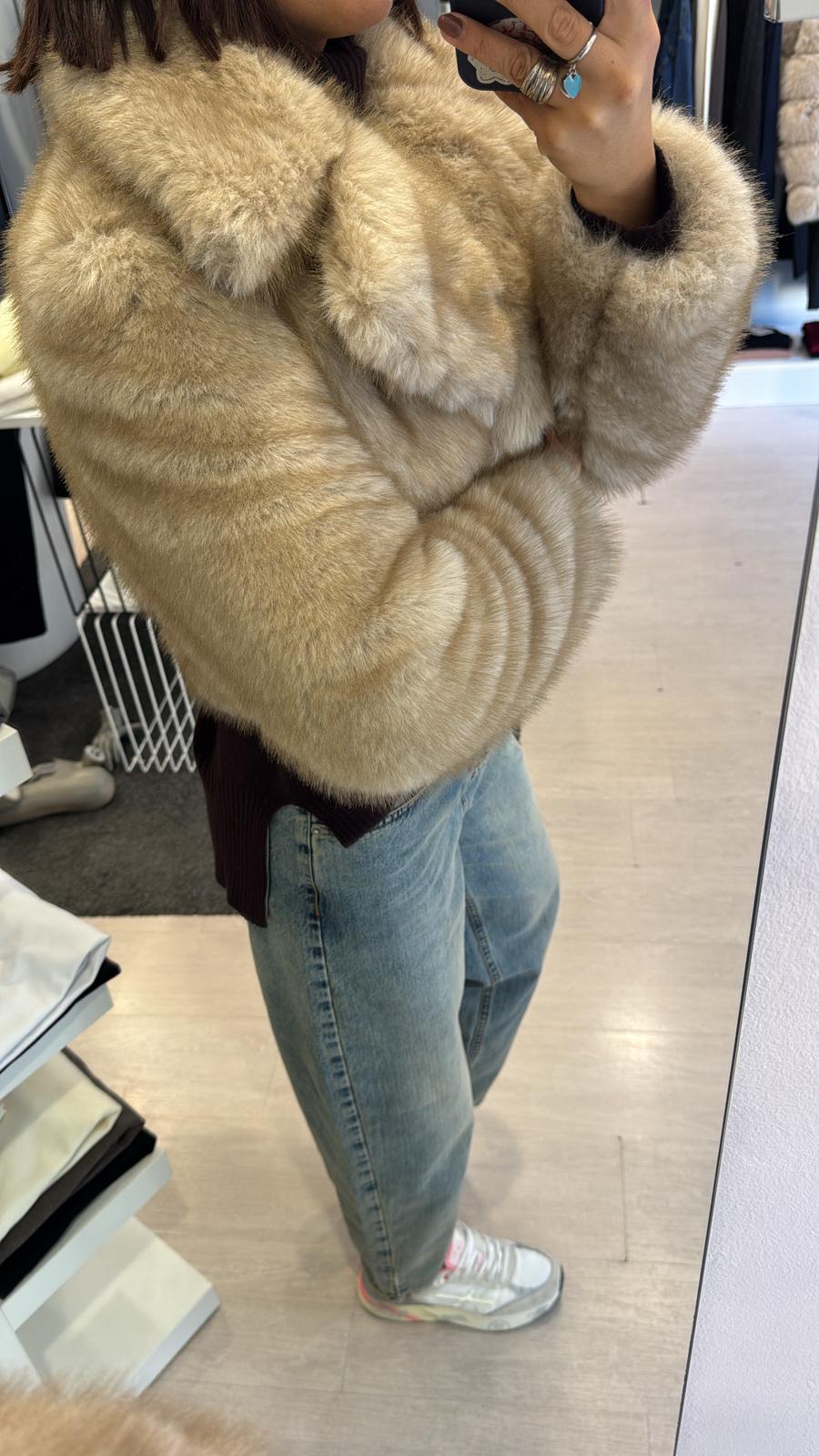 Ecopelliccia lunghezza in vita, collo voluminoso, chiusura a clip frontale, foderata internamente vestibilità regolare IN FOTO INDOSSO LA TAGLIA S...