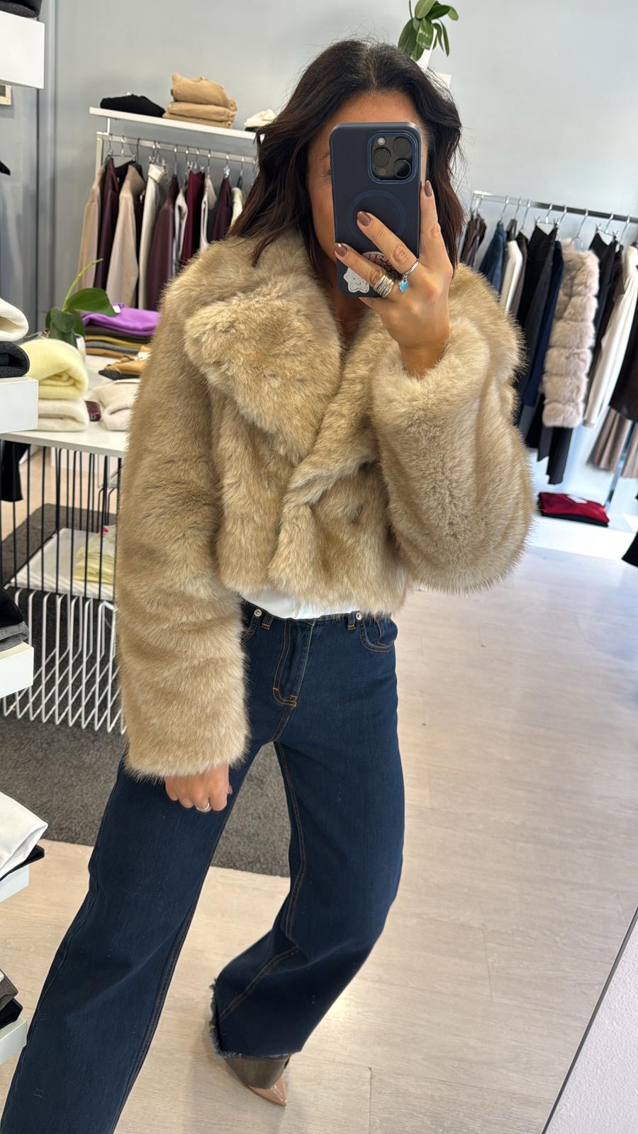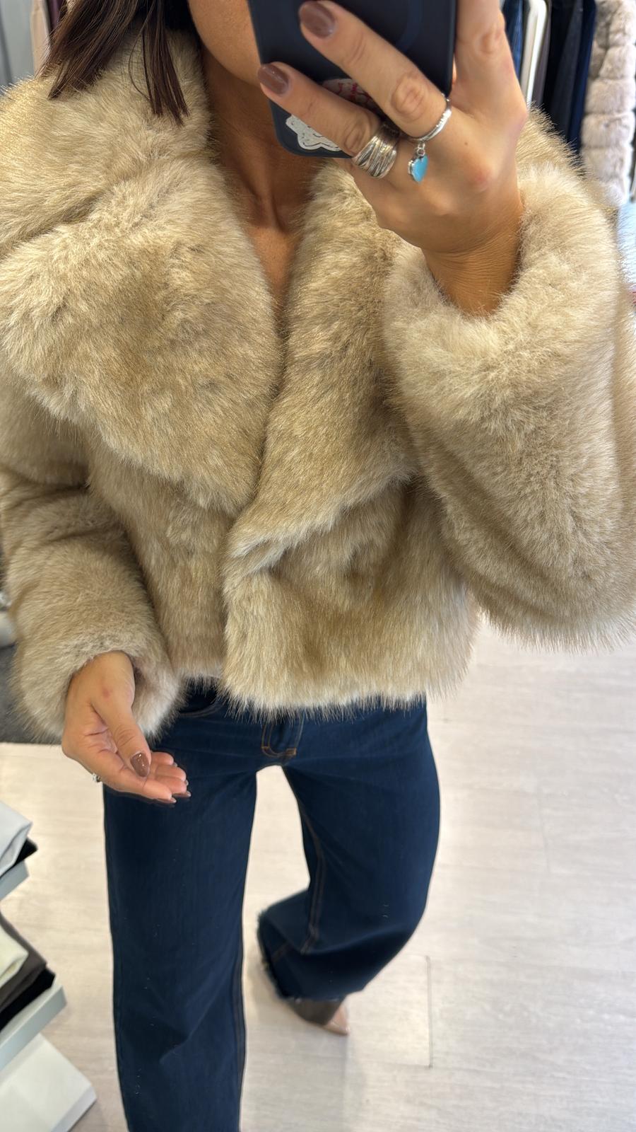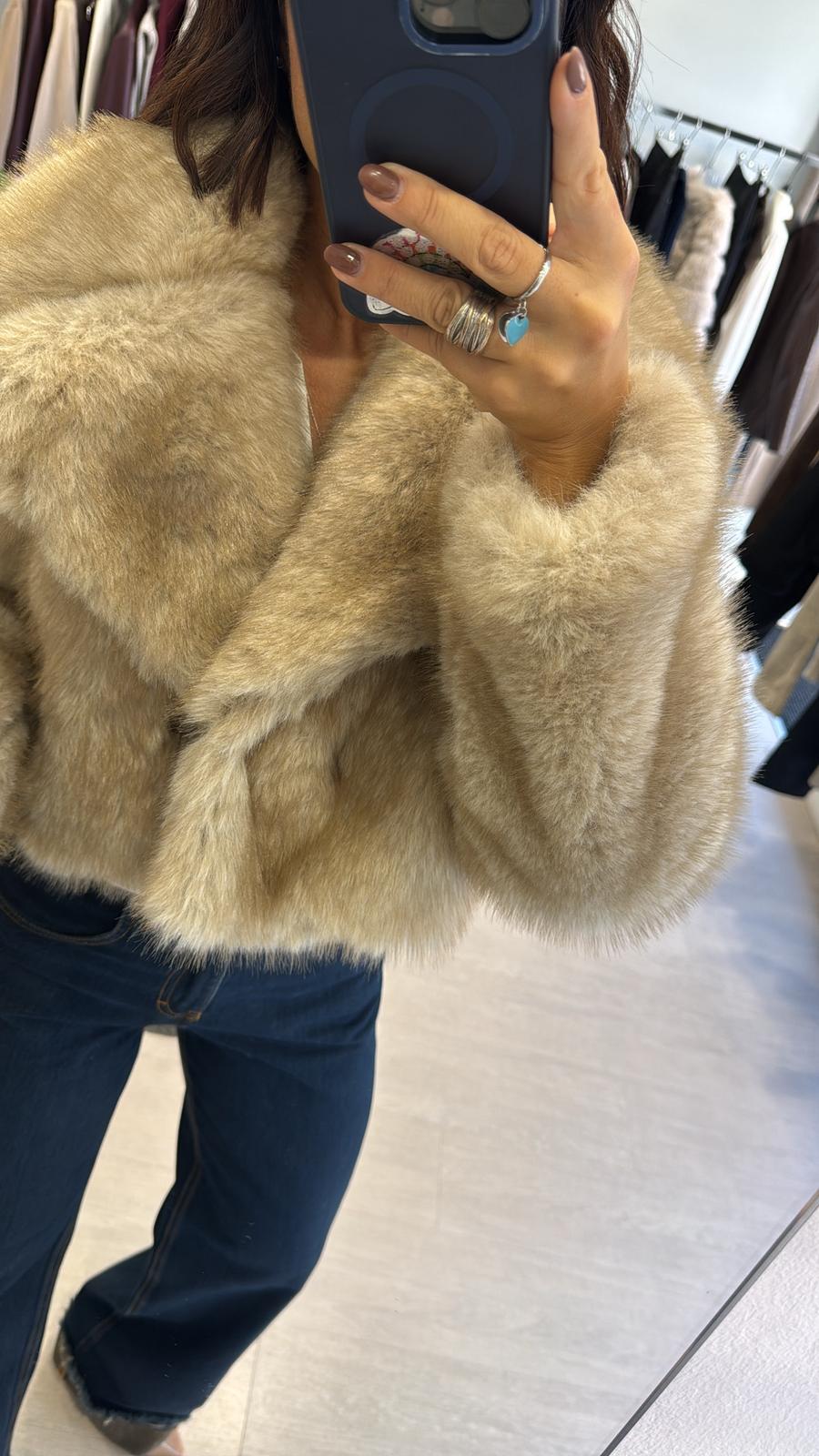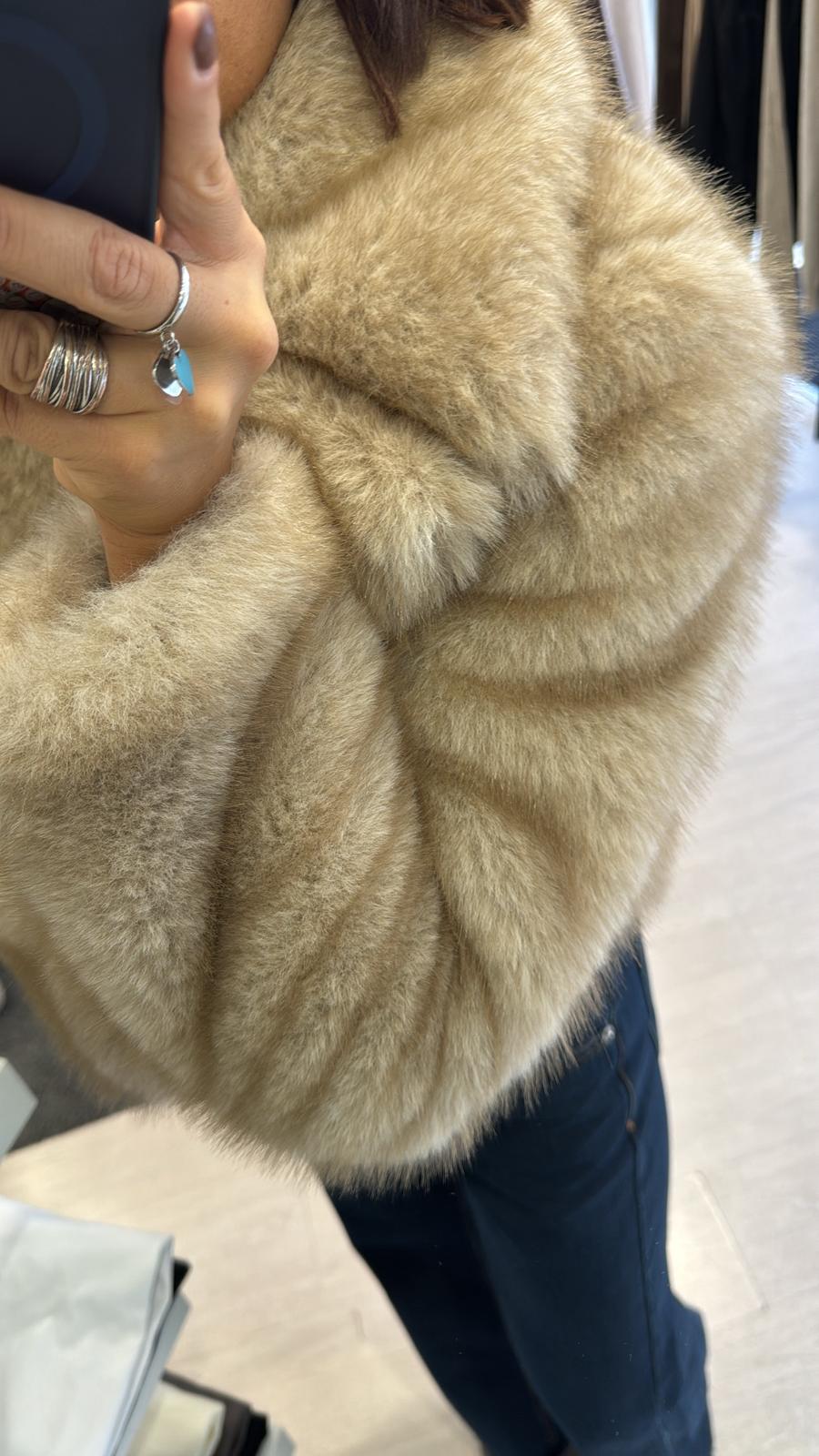 Ecopelliccia lunghezza in vita, collo voluminoso, chiusura a clip frontale, foderata internamente
