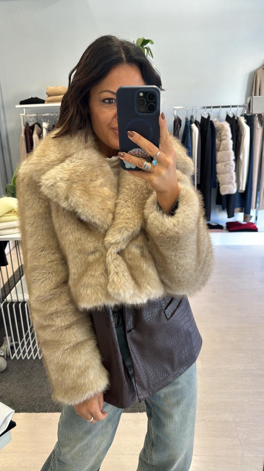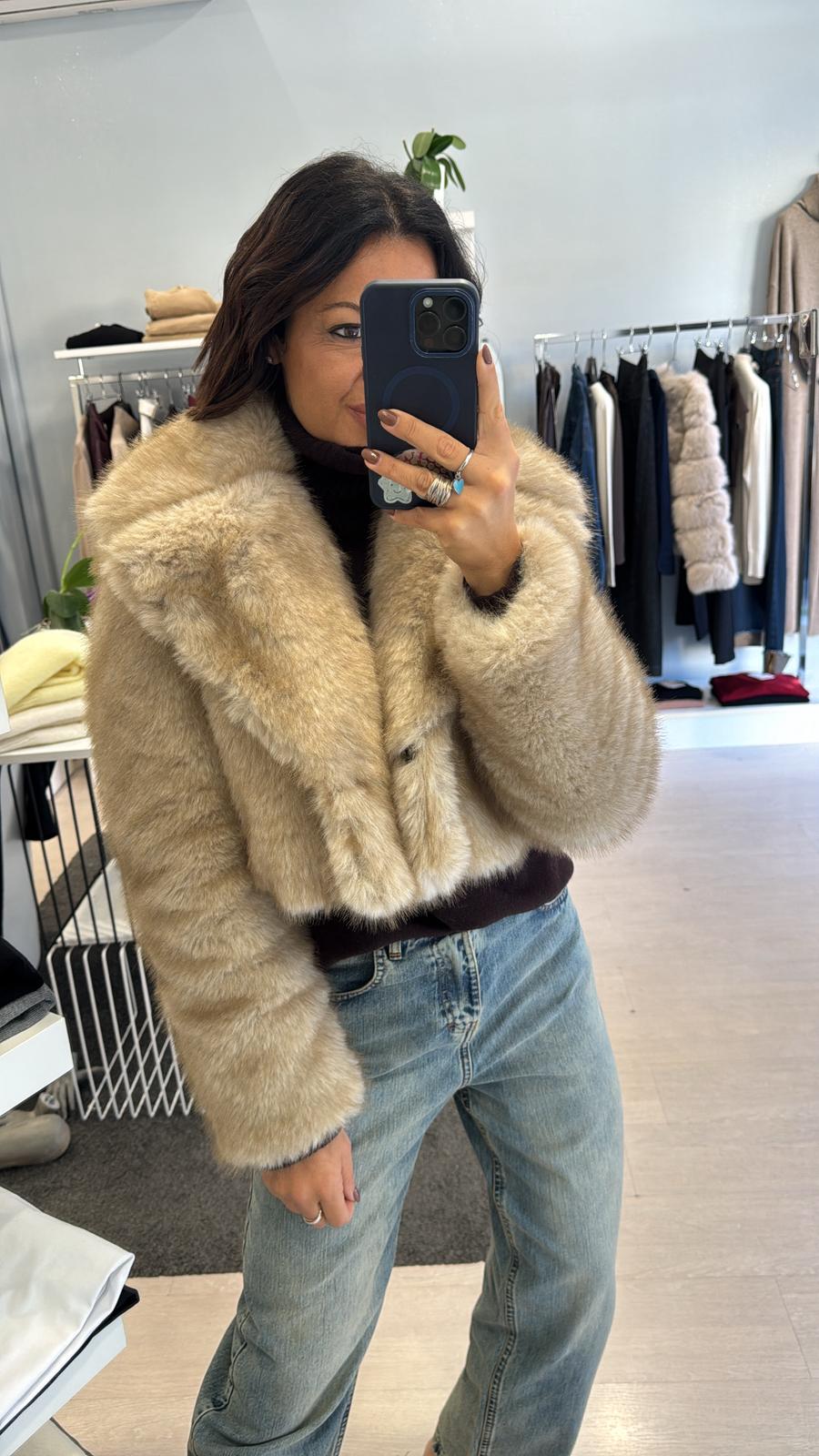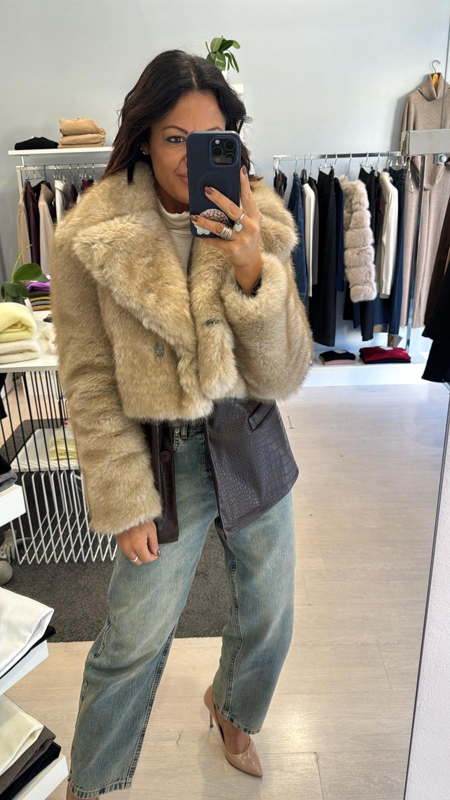 Ecopelliccia lunghezza in vita, collo voluminoso, chiusura a clip frontale, foderata internamente