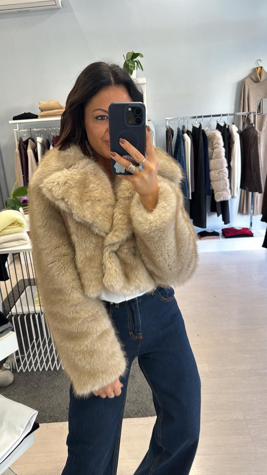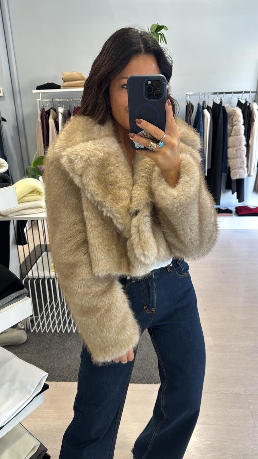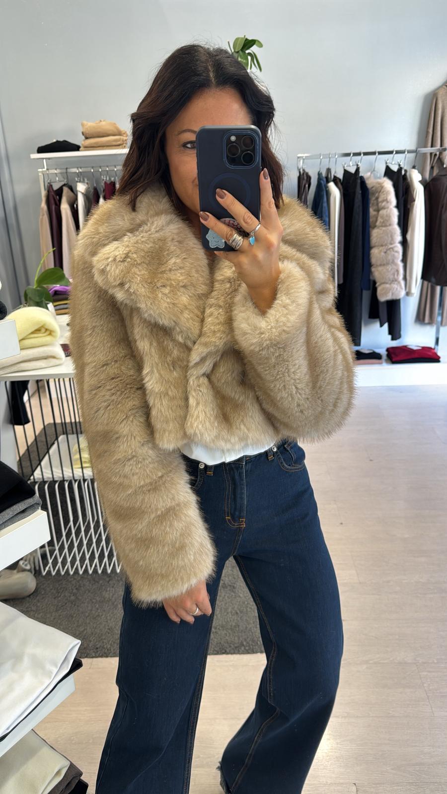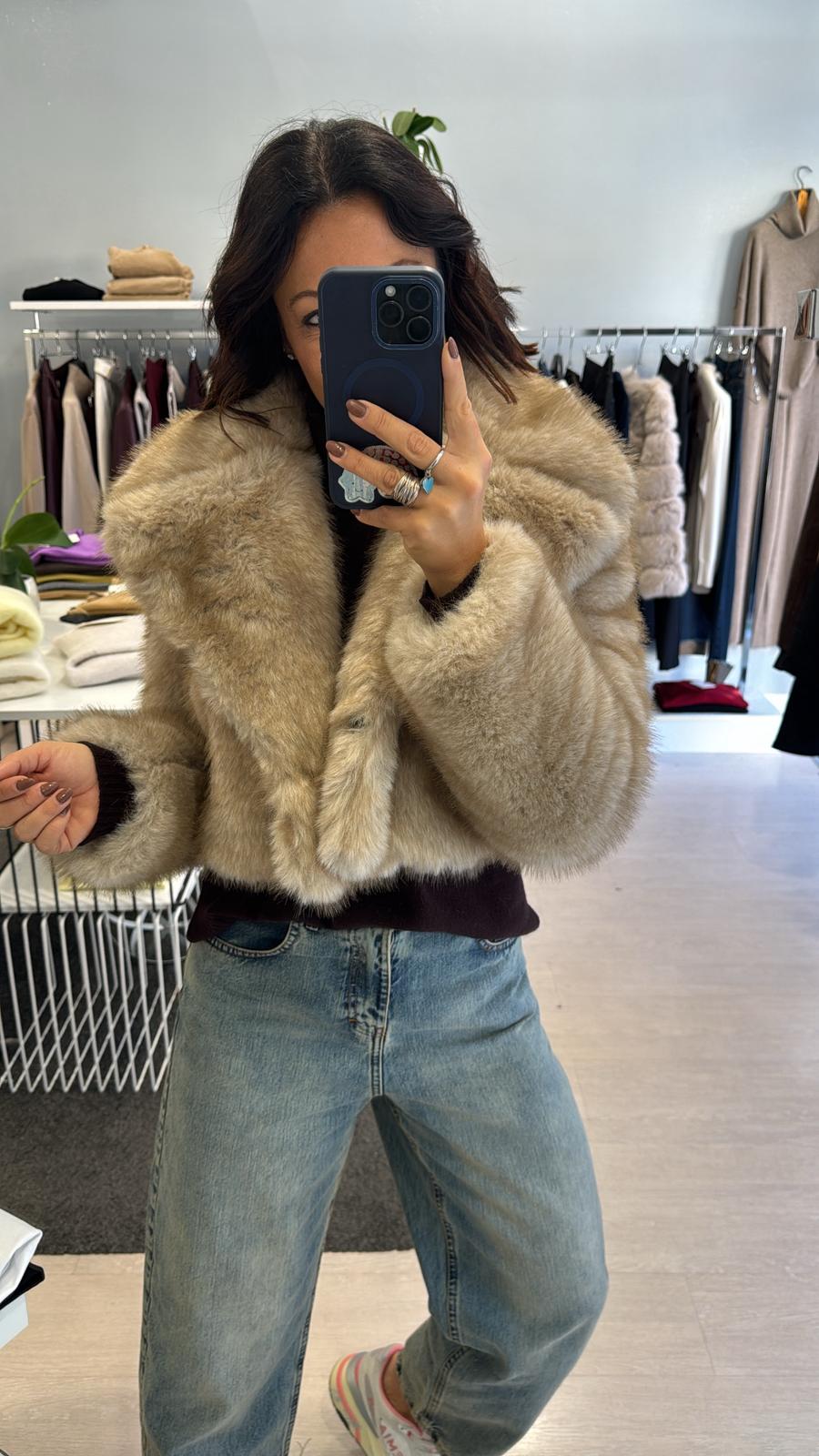 Ecopelliccia lunghezza in vita, collo voluminoso, chiusura a clip frontale, foderata internamente