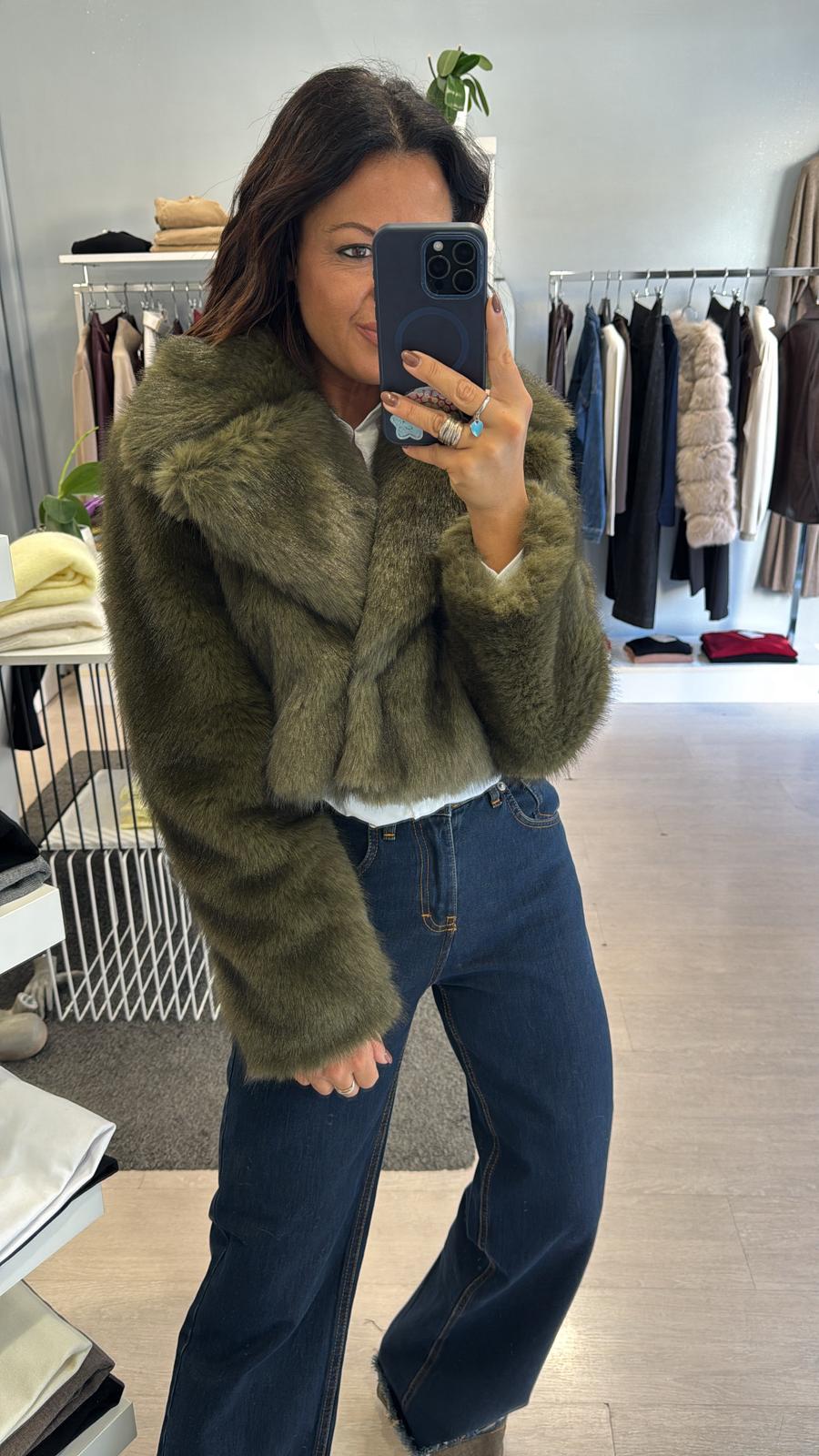 Ecopelliccia lunghezza in vita, collo voluminoso, chiusura a clip frontale, foderata internamente