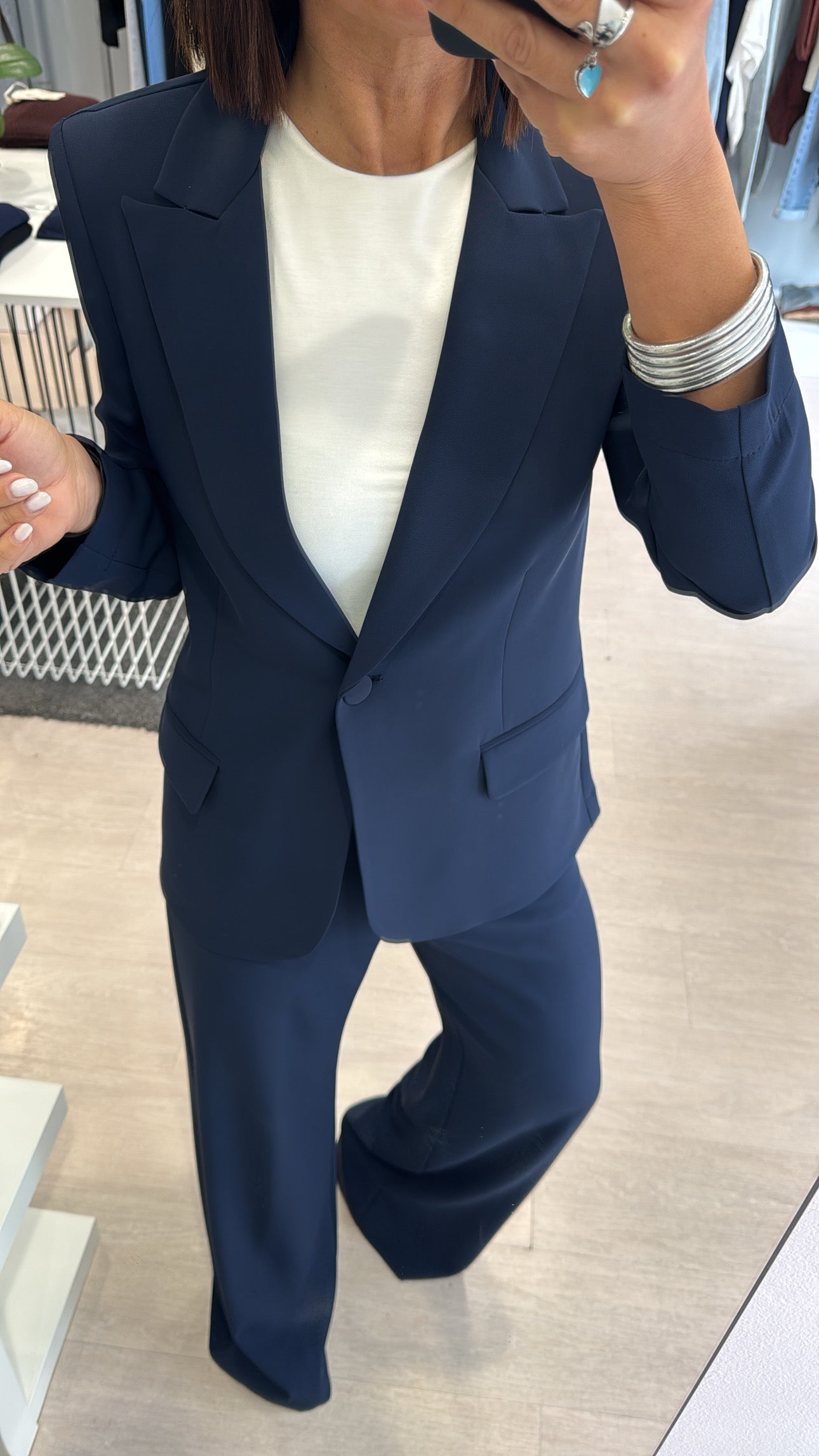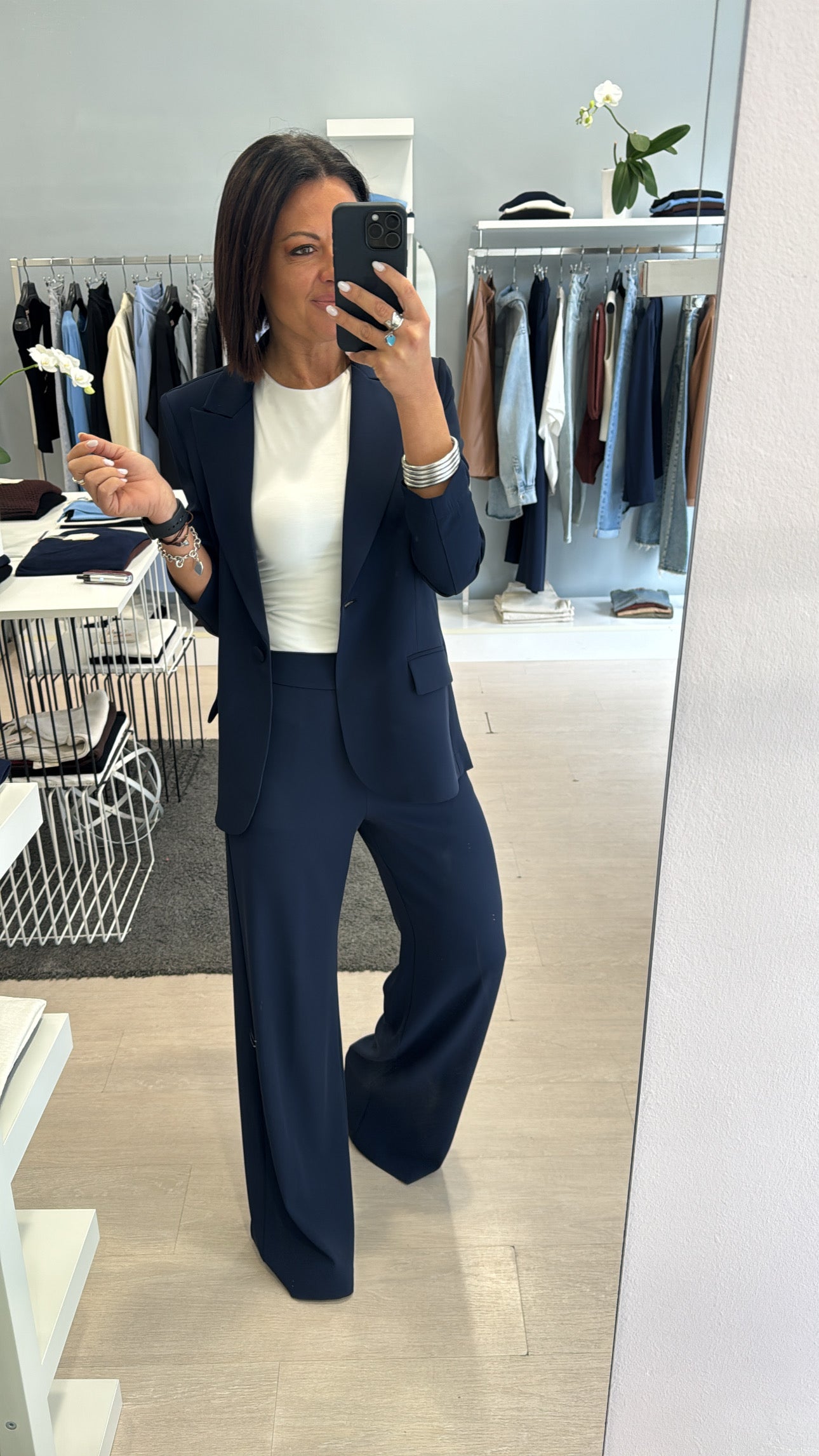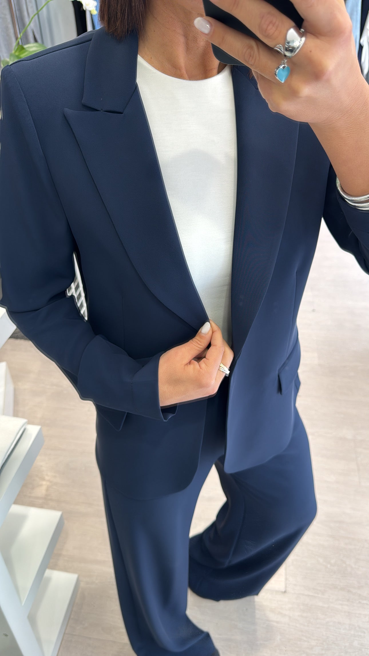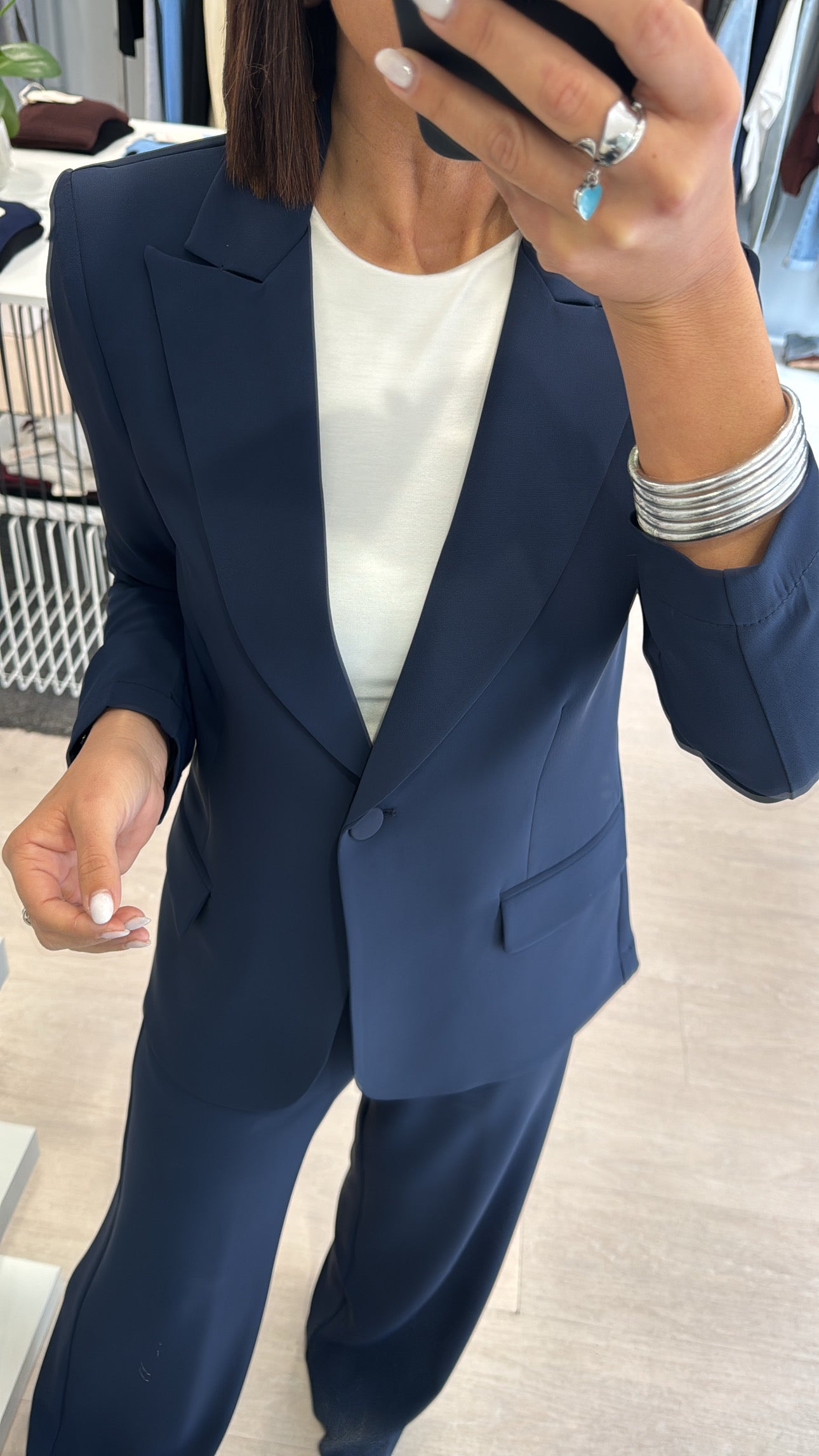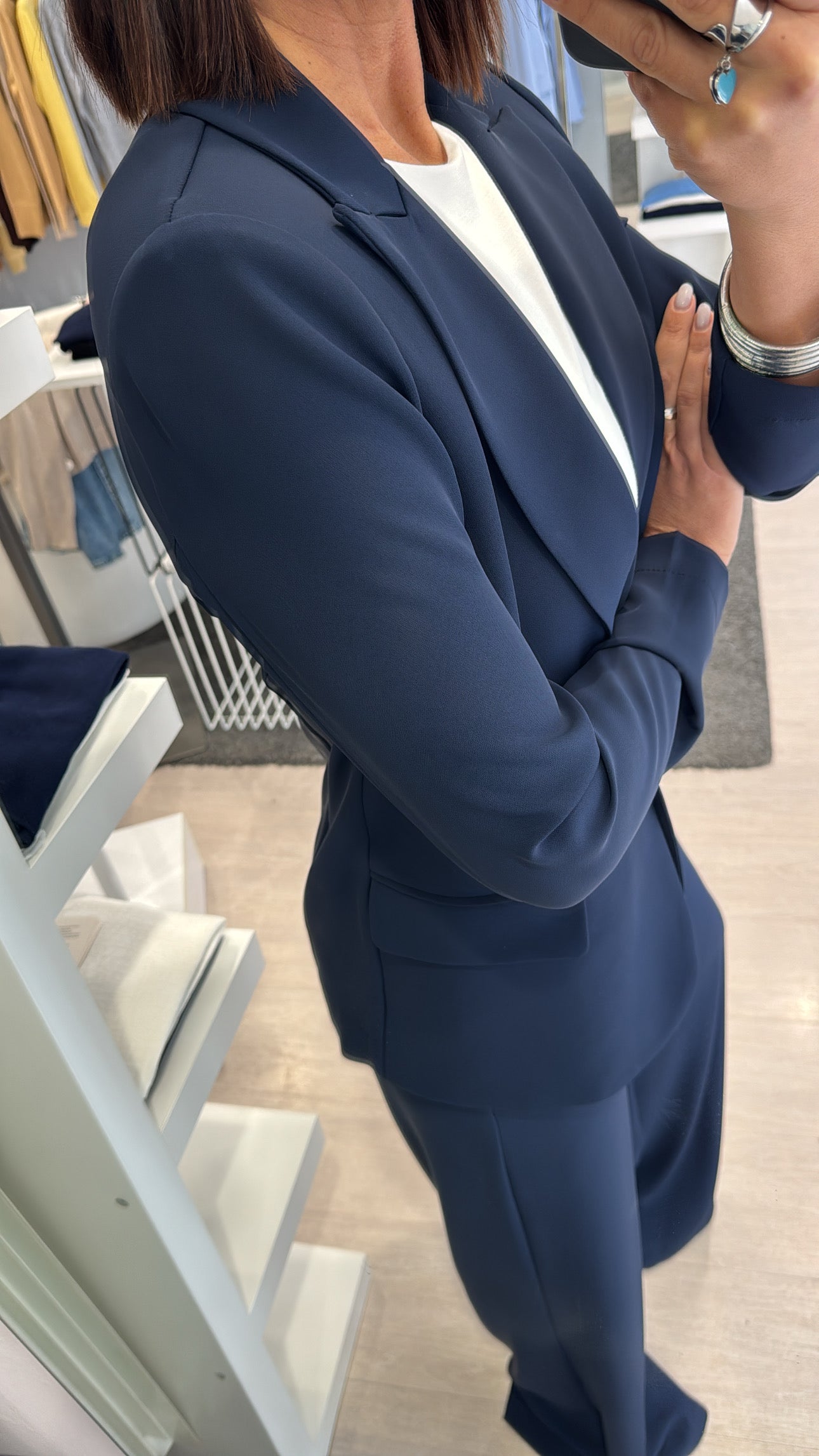 Giacca Kontatto in tessuto fluido, modello non foderato, lunghezza al fianco, chiusura ad un bottone, spalla leggermente imbottita, modello effetto dritto