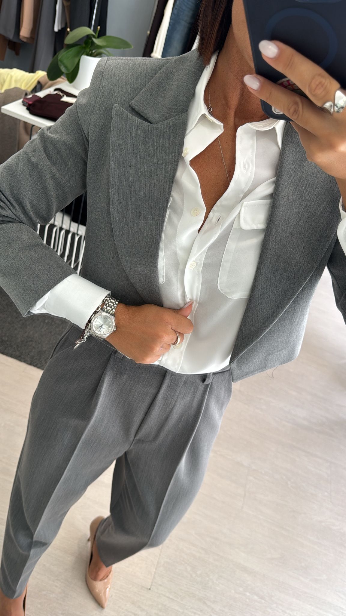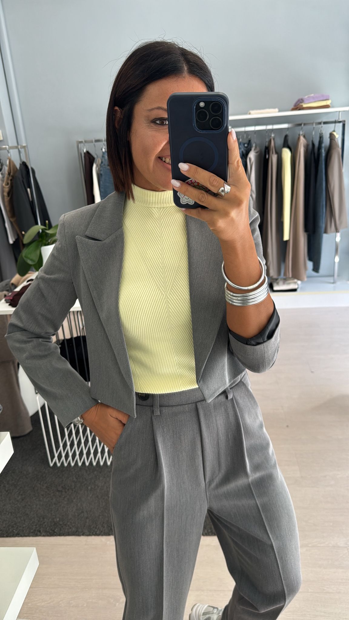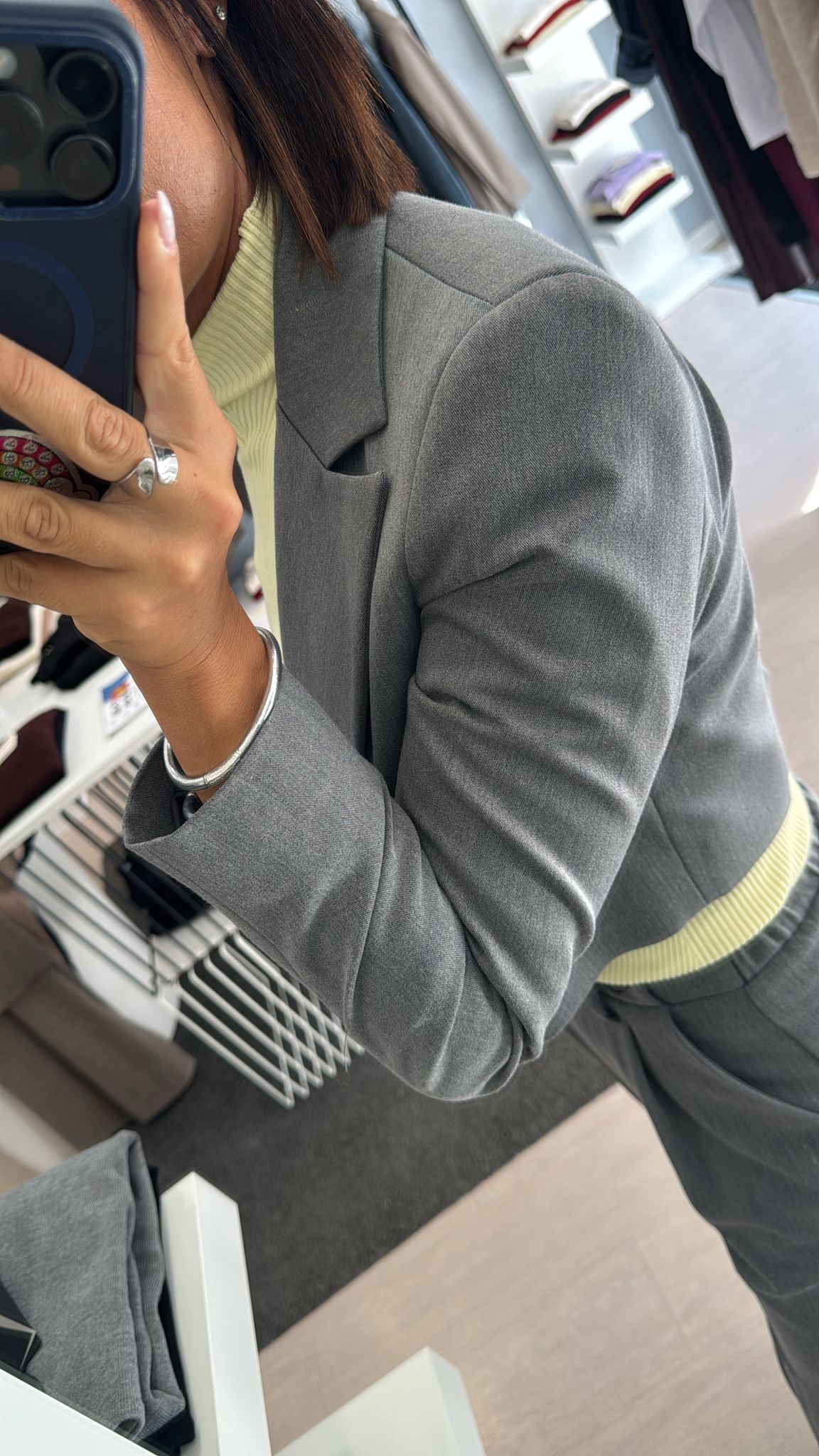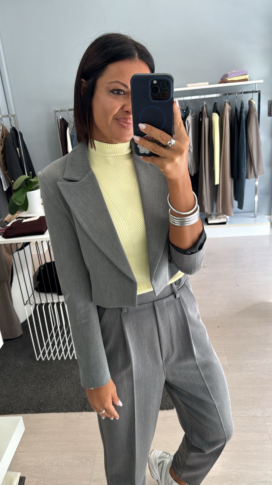 Giacca modello crop, lunghezza in vita, spalla regolare, modello foderato senza chiusura FA COMPLETO CON IL PANTALONE GRIGIO vestibilità regolare...