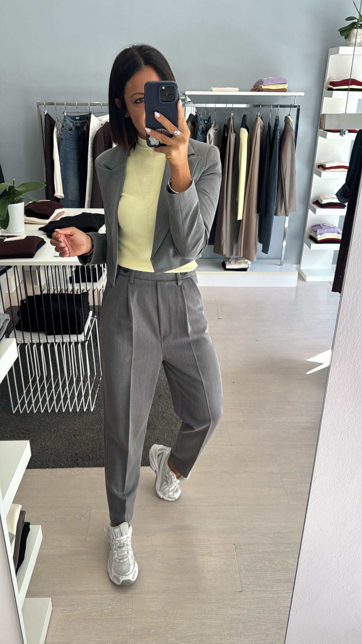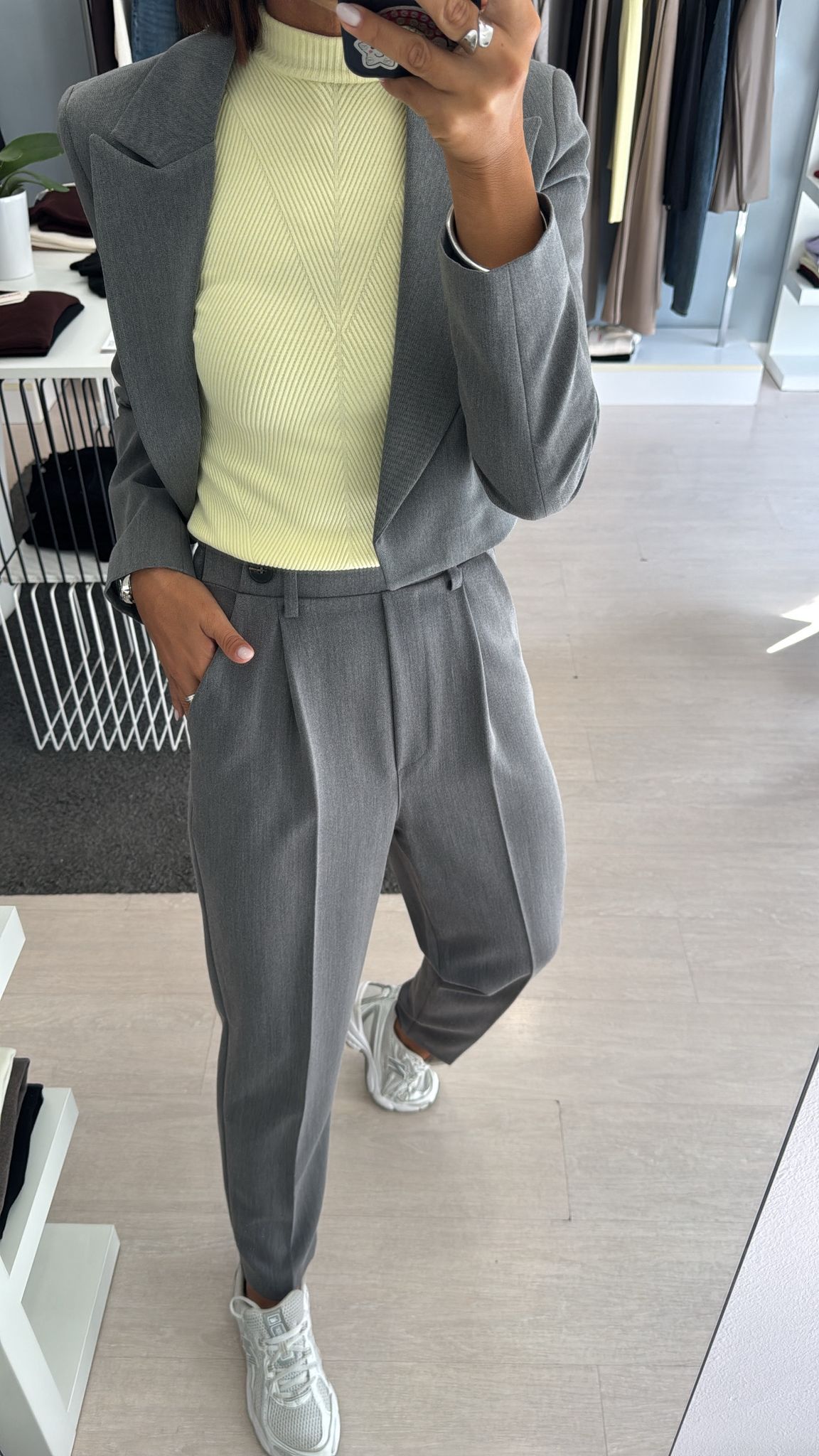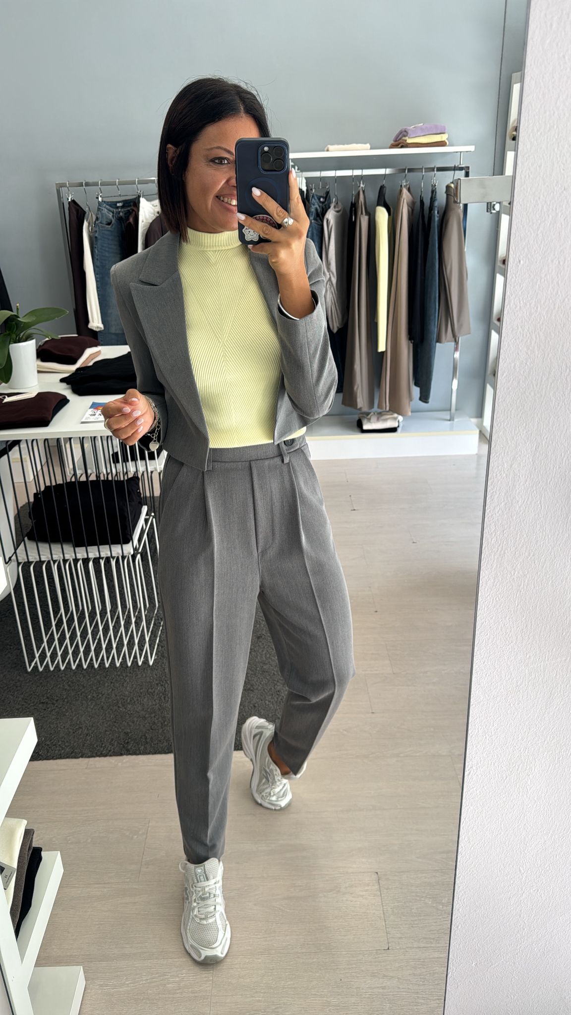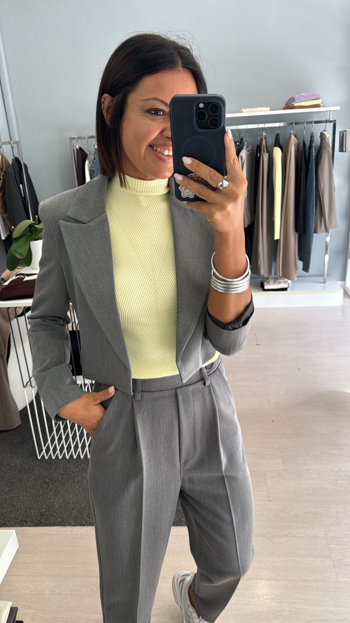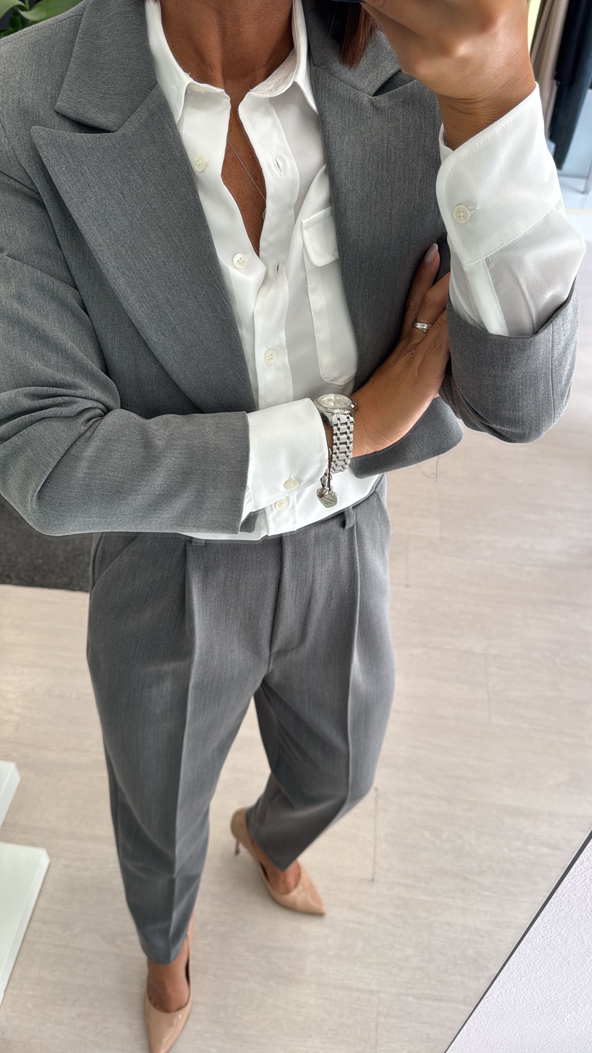 Giacca modello crop, lunghezza in vita, spalla regolare, modello foderato senza chiusura FA COMPLETO CON IL PANTALONE GRIGIO vestibilità regolare...