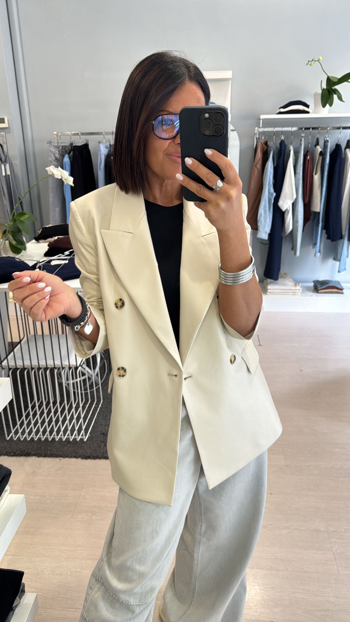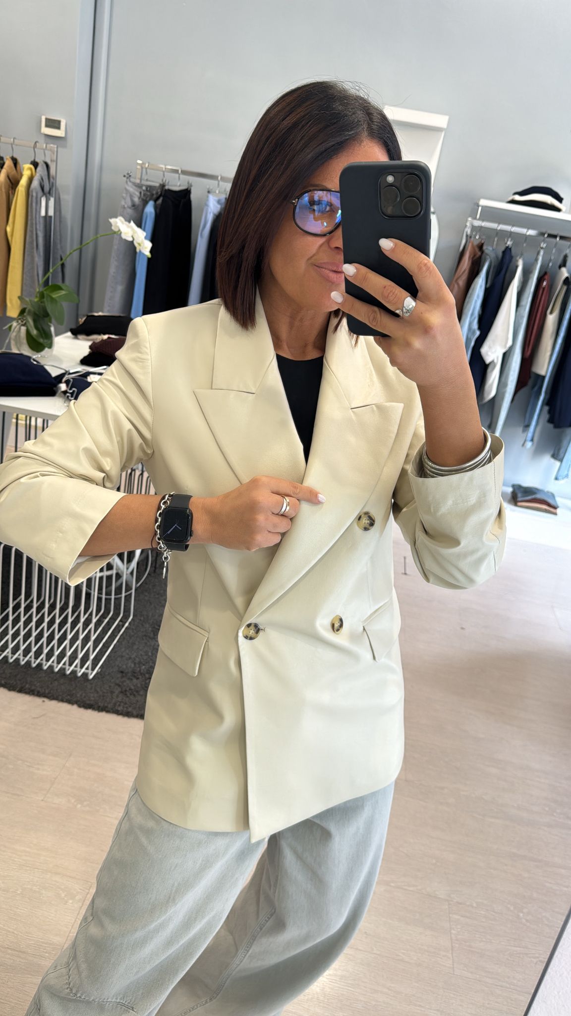 Giacca Kontatto in ecopelle, modello doppiopetto, spalla leggermente imbottita, modello dritto con una leggera sfiancatura, lunghezza al fianco, bottoni a contrasto, modello foderato