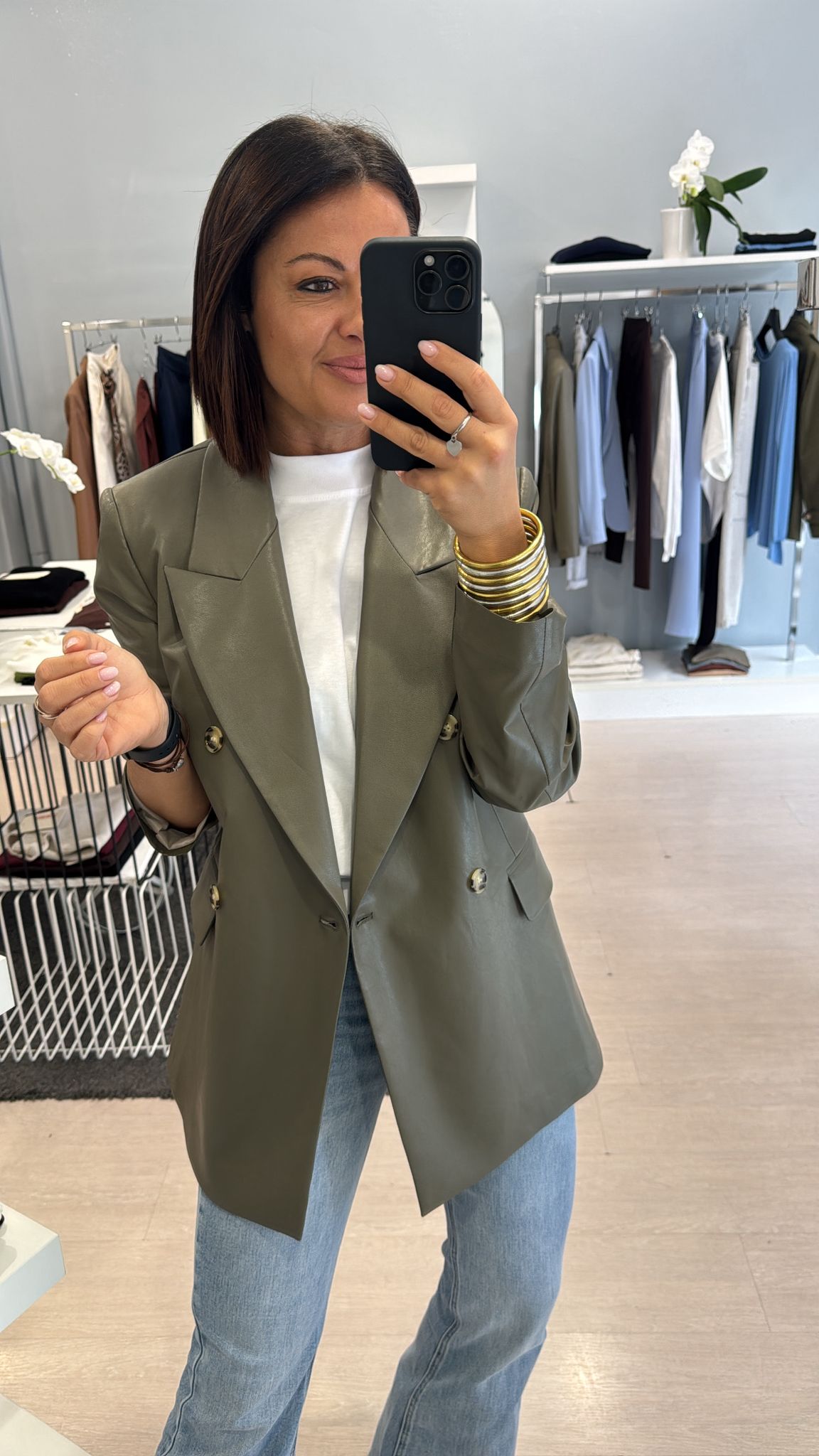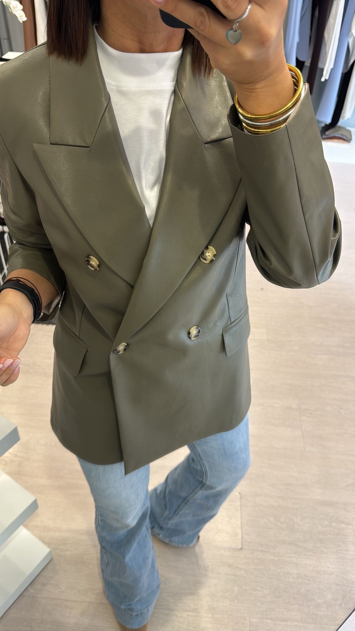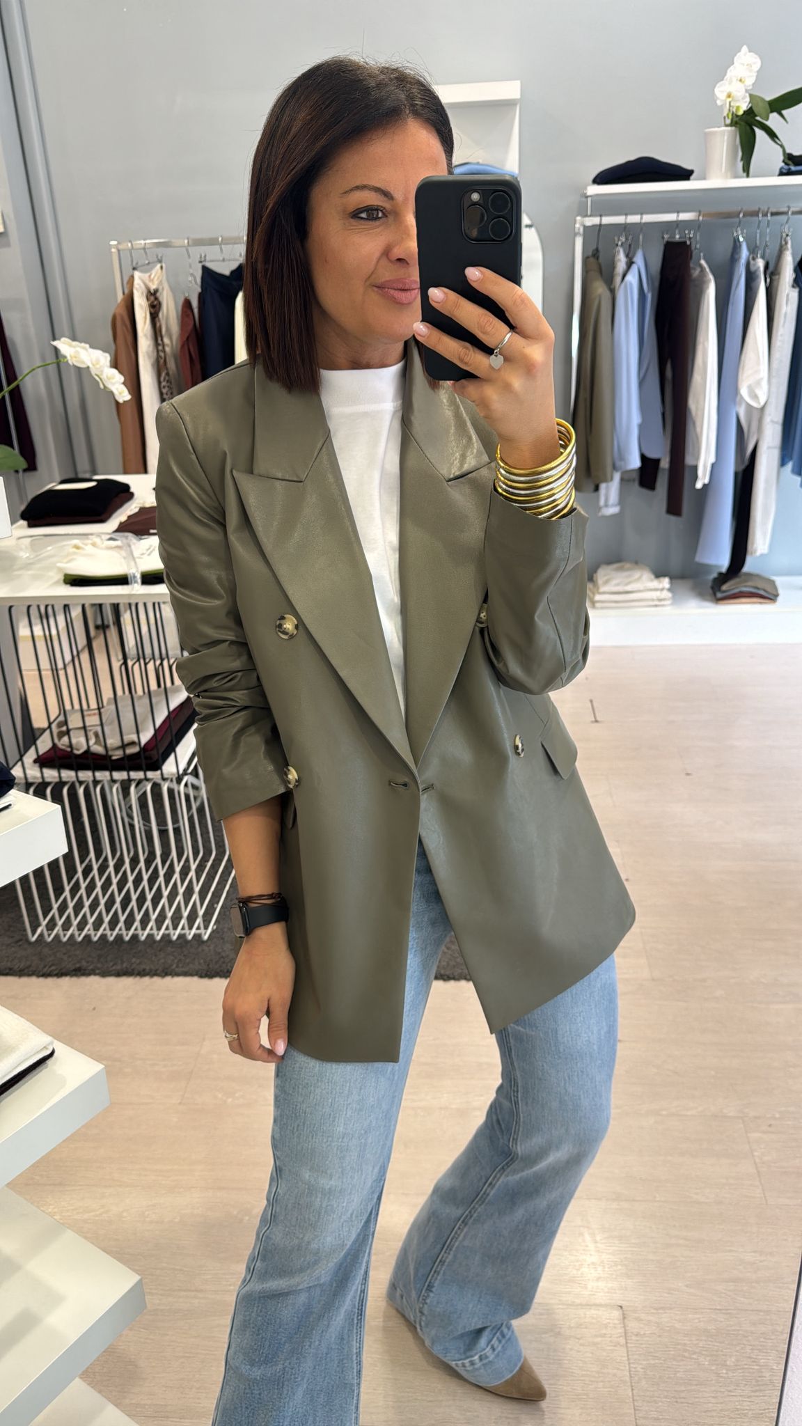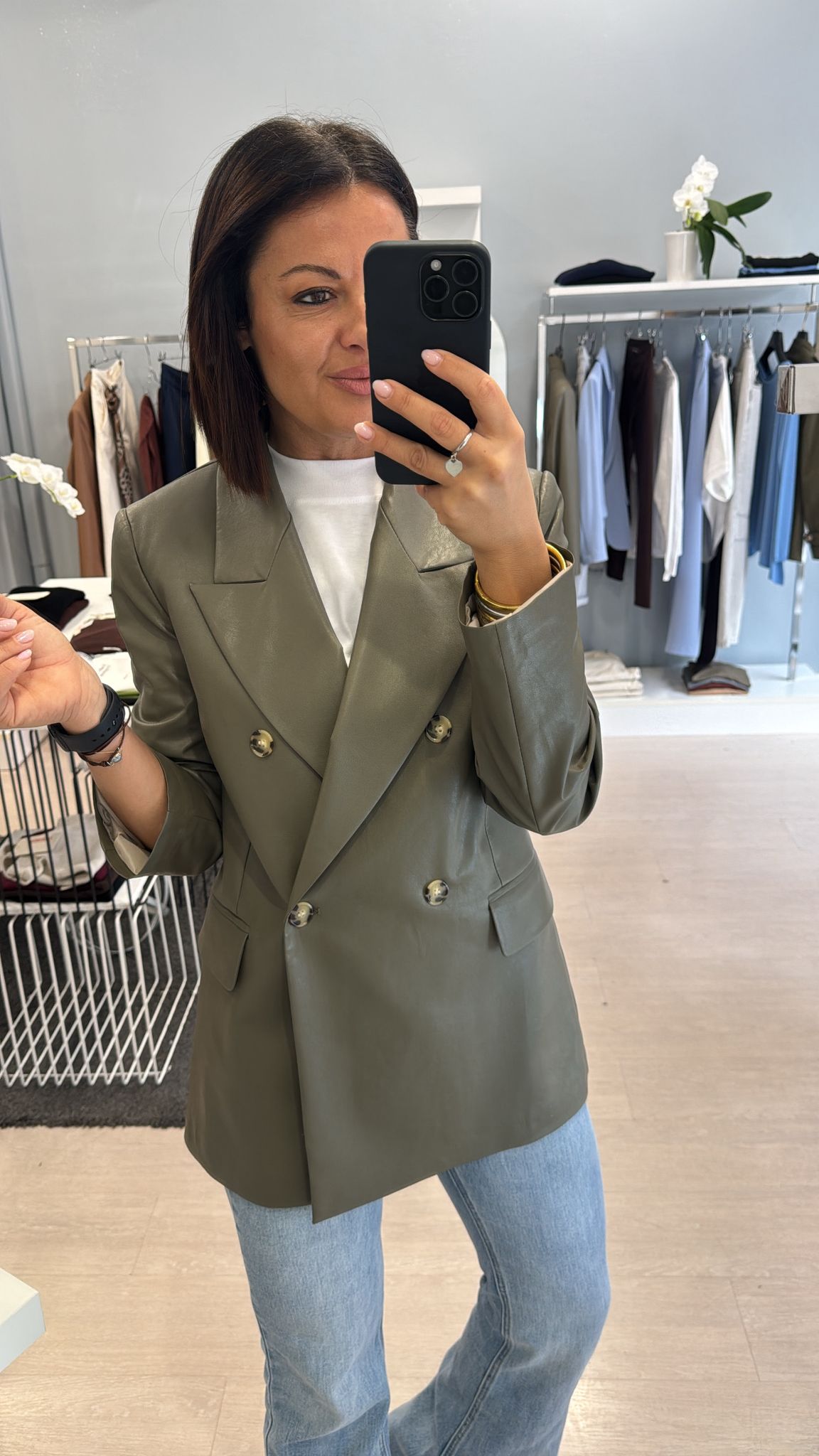 Giacca Kontatto in ecopelle, modello doppiopetto, spalla leggermente imbottita, modello dritto con una leggera sfiancatura, lunghezza al fianco, bottoni a contrasto, modello foderato