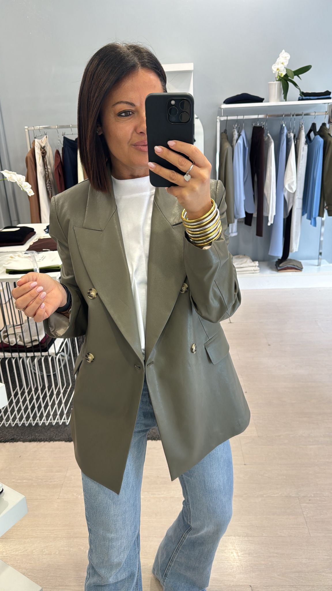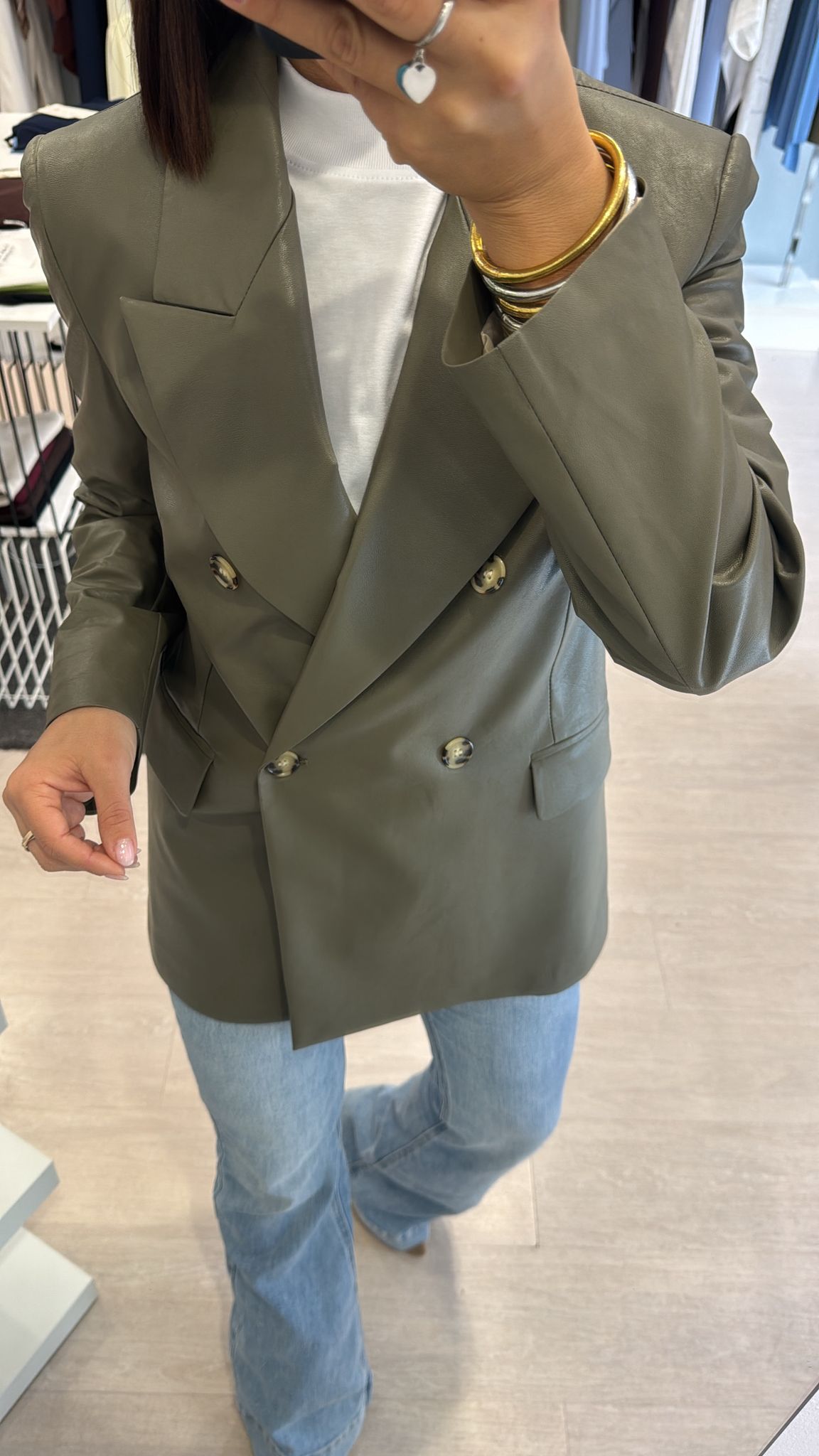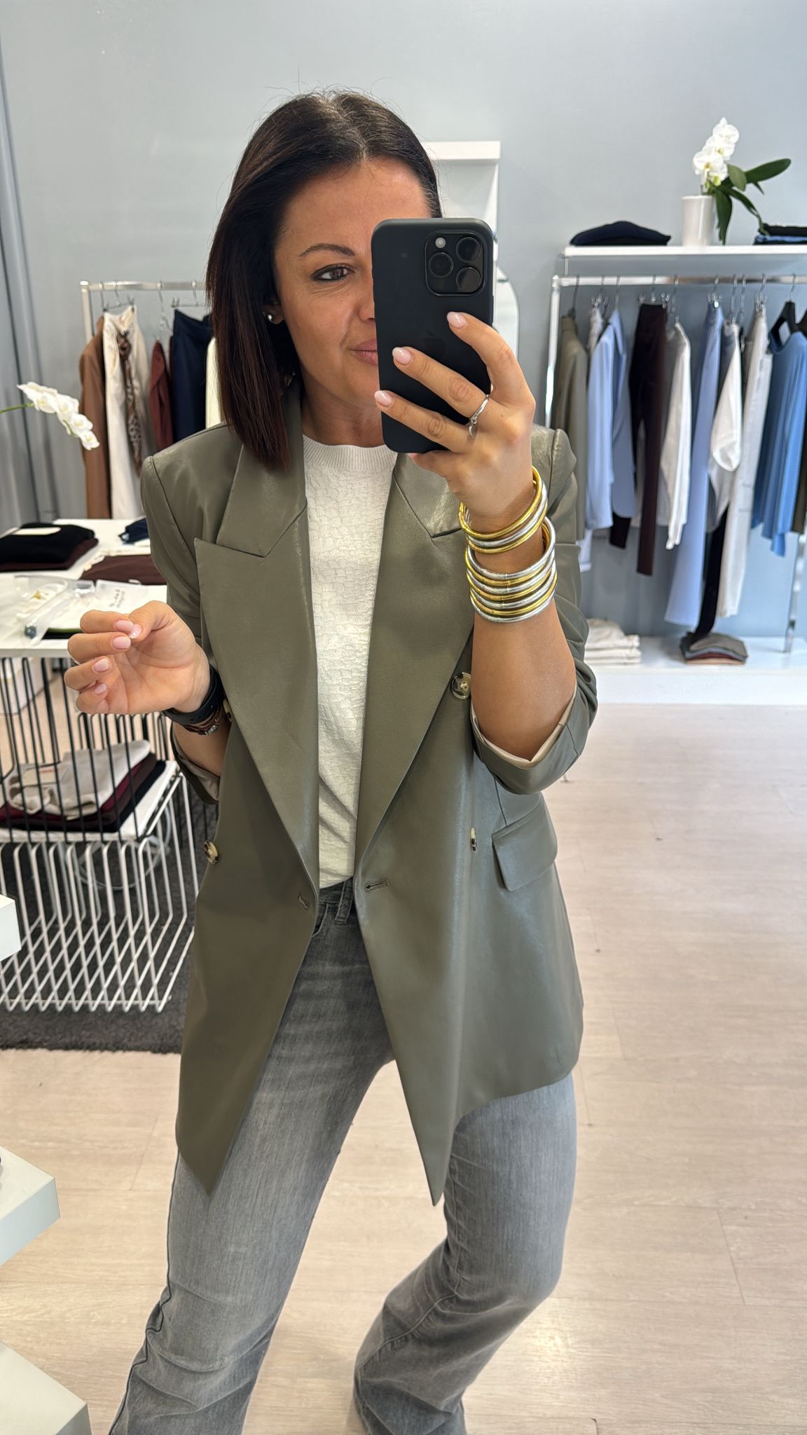 Giacca Kontatto in ecopelle, modello doppiopetto, spalla leggermente imbottita, modello dritto con una leggera sfiancatura, lunghezza al fianco, bottoni a contrasto, modello foderato