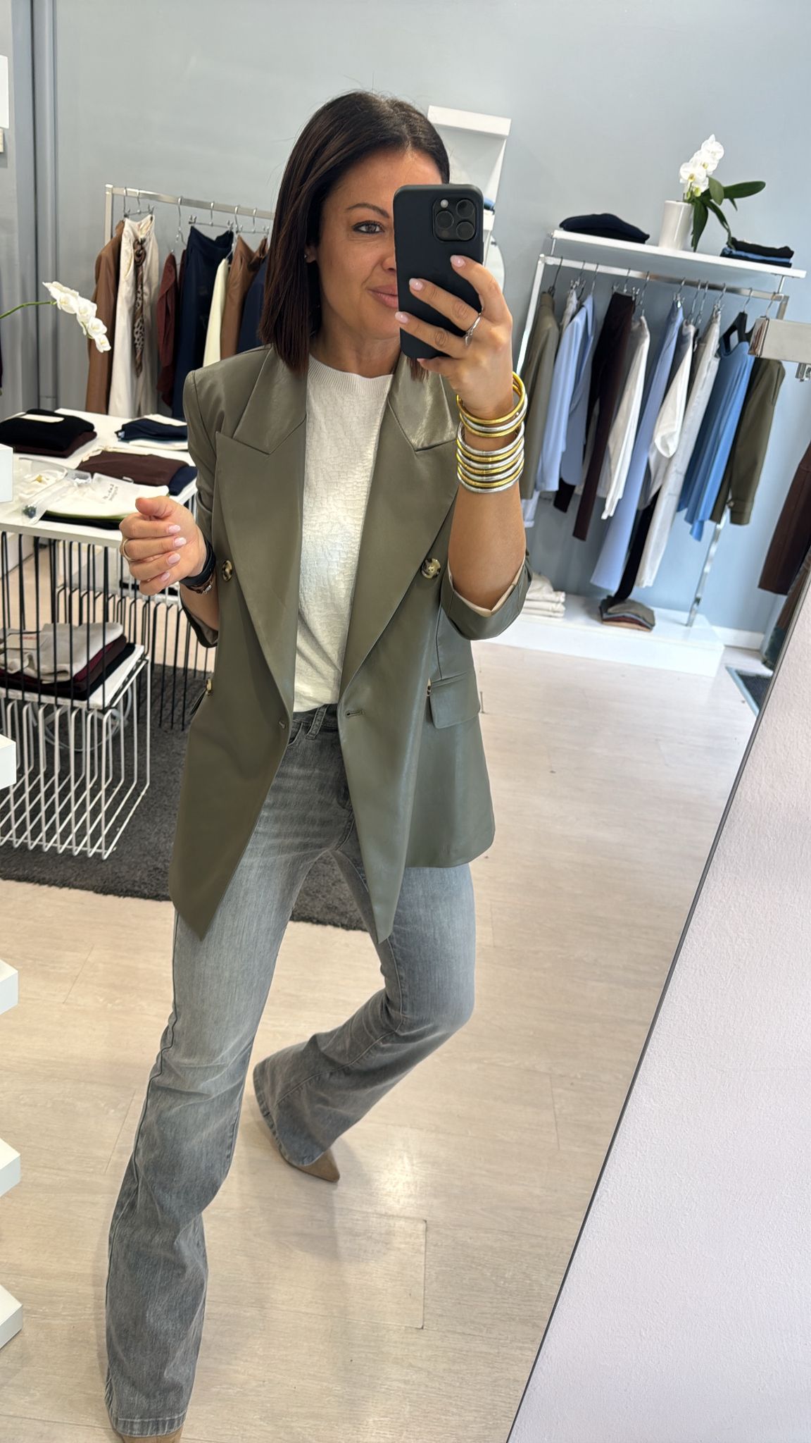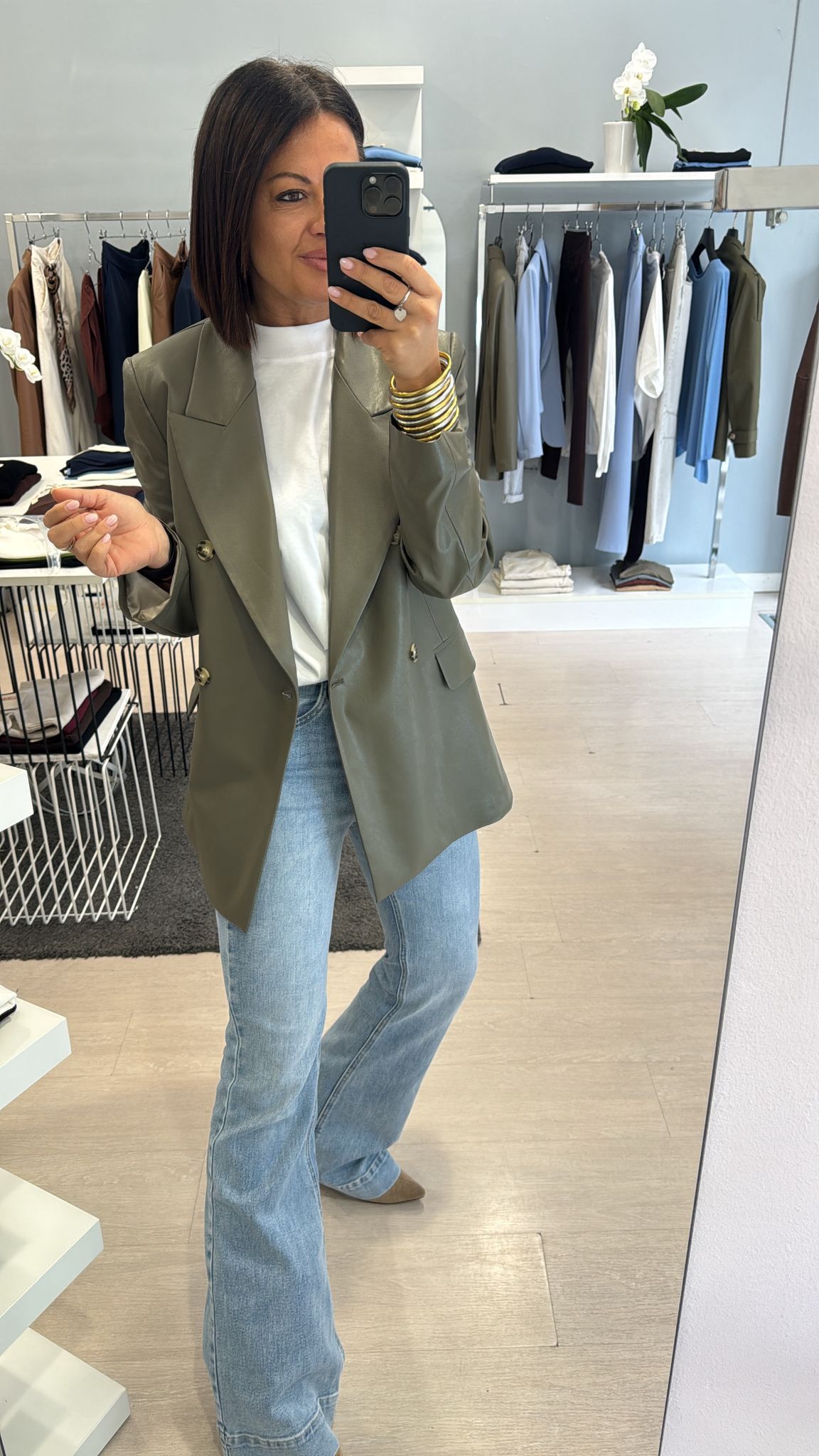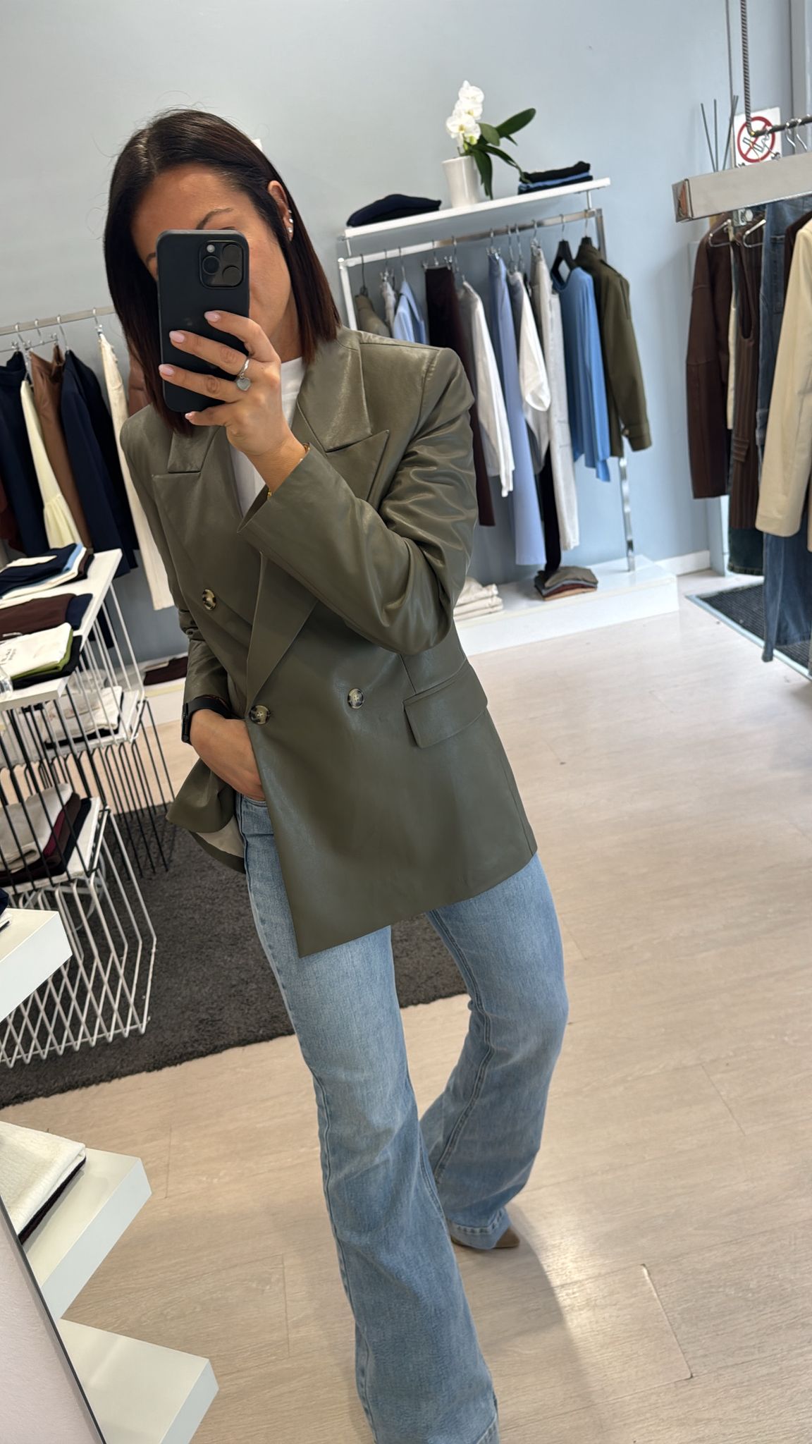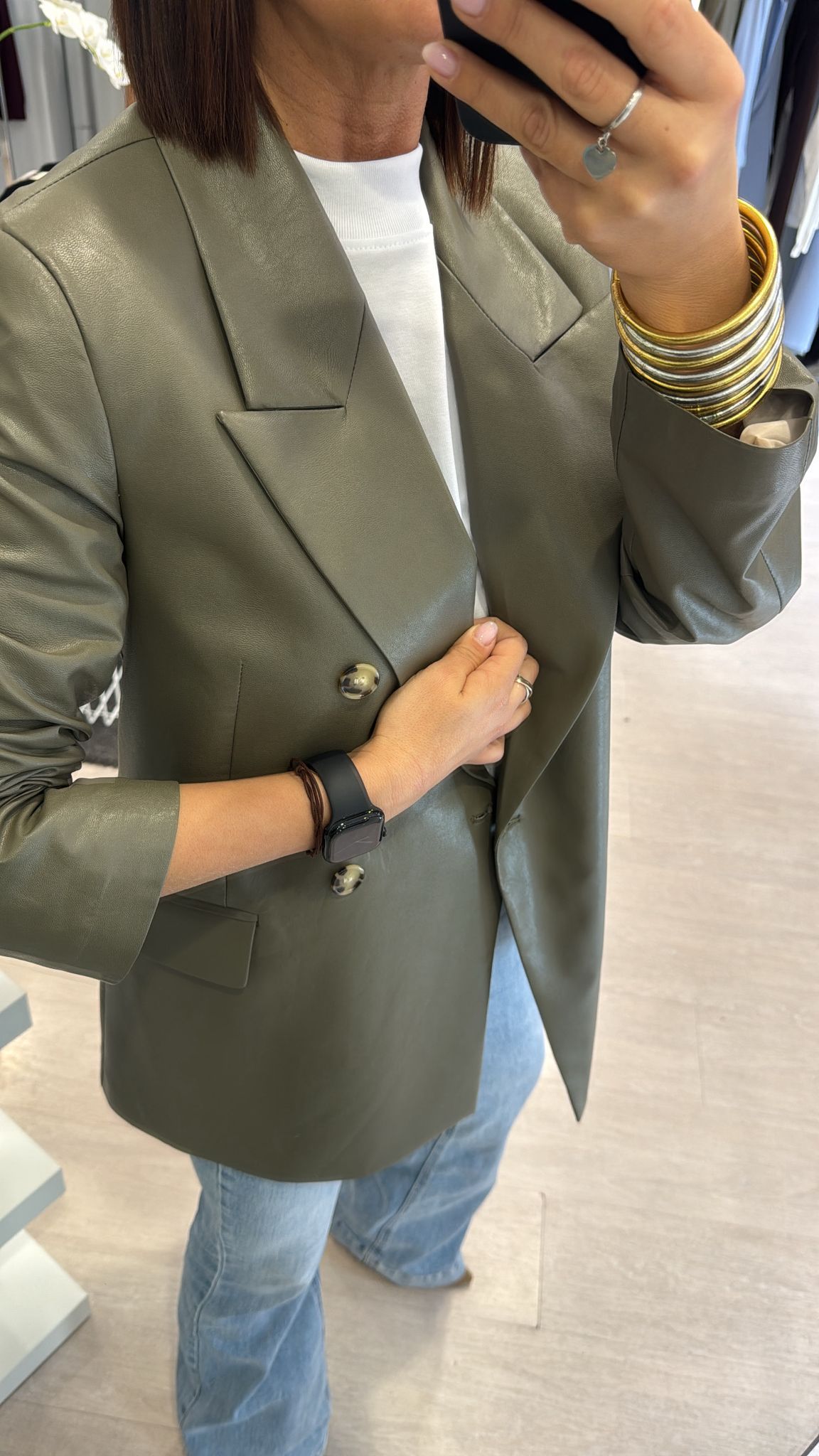 Giacca Kontatto in ecopelle, modello doppiopetto, spalla leggermente imbottita, modello dritto con una leggera sfiancatura, lunghezza al fianco, bottoni a contrasto, modello foderato