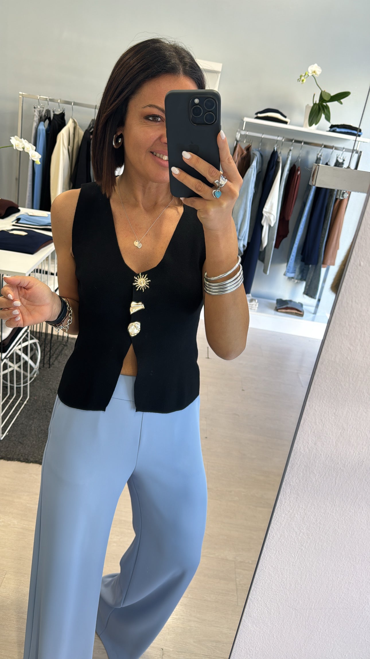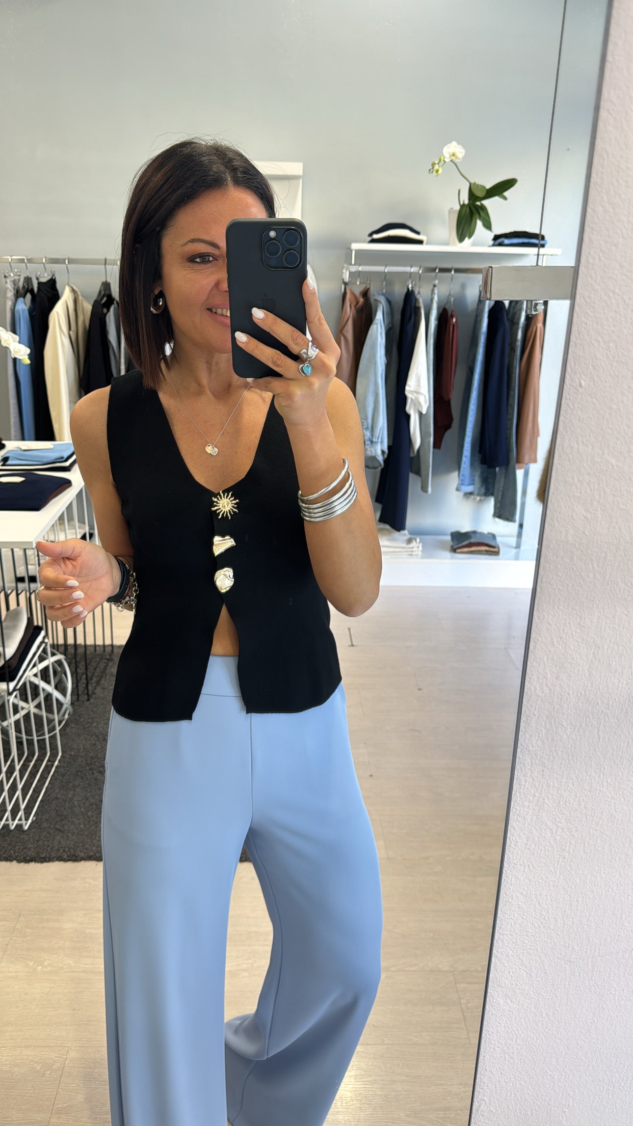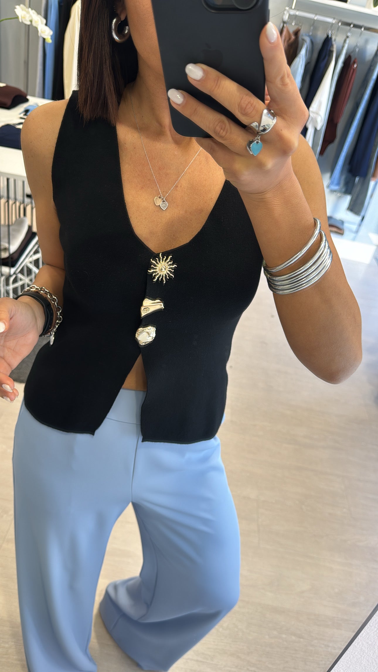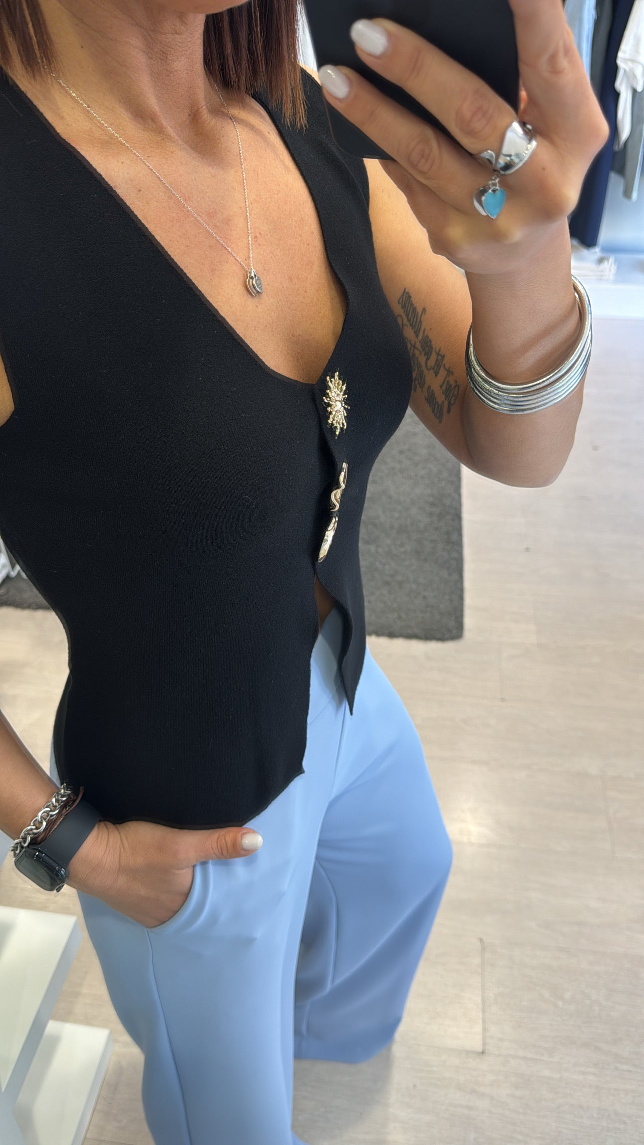 Gilet Kontatto scollato a V chiuso frontalmente da bottoni gioiello, lunghezza in vita con piccola apertura frontale, modello sfiancato