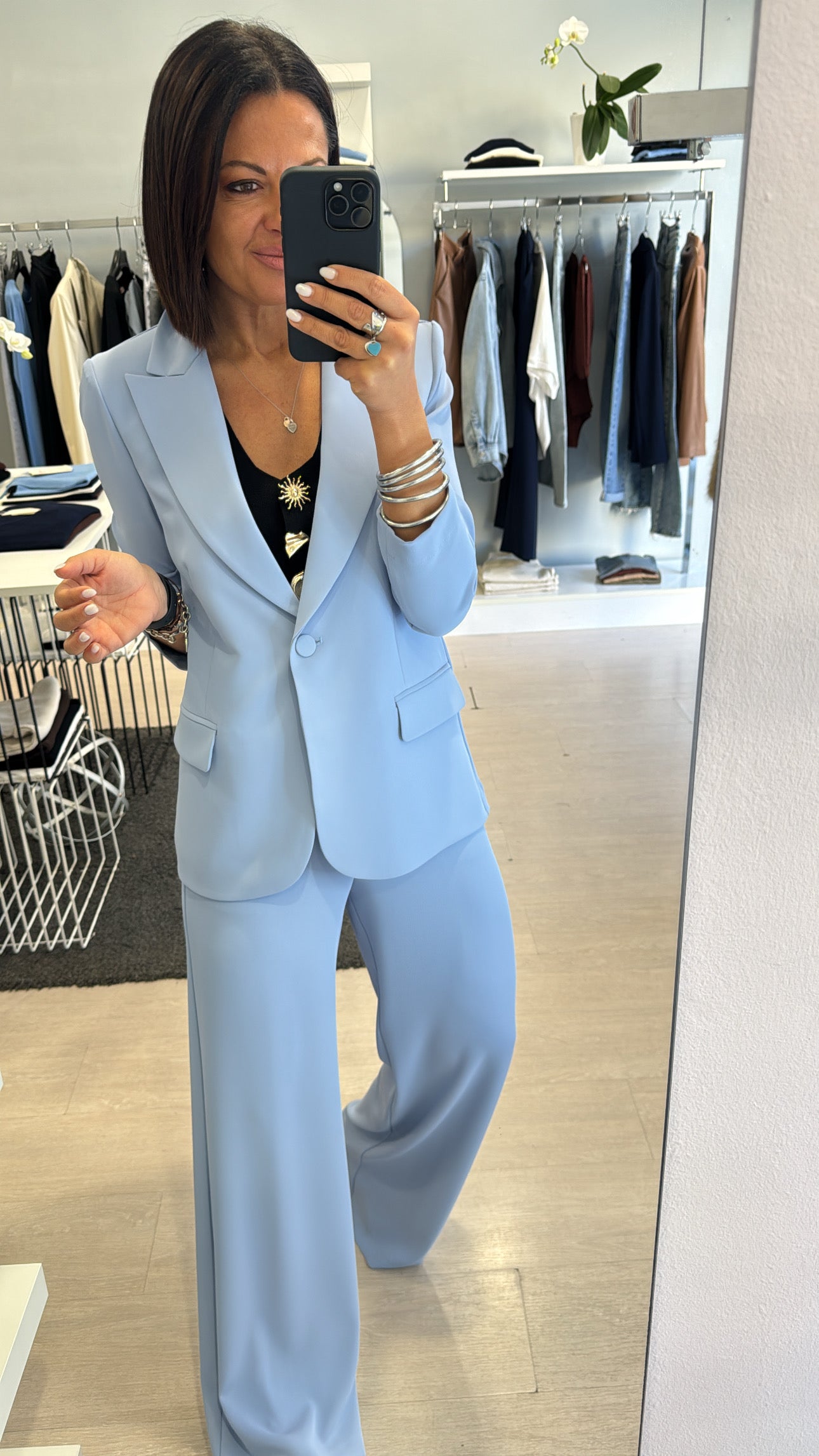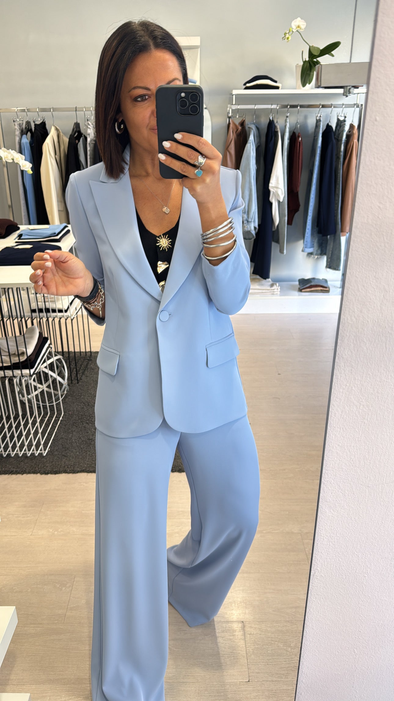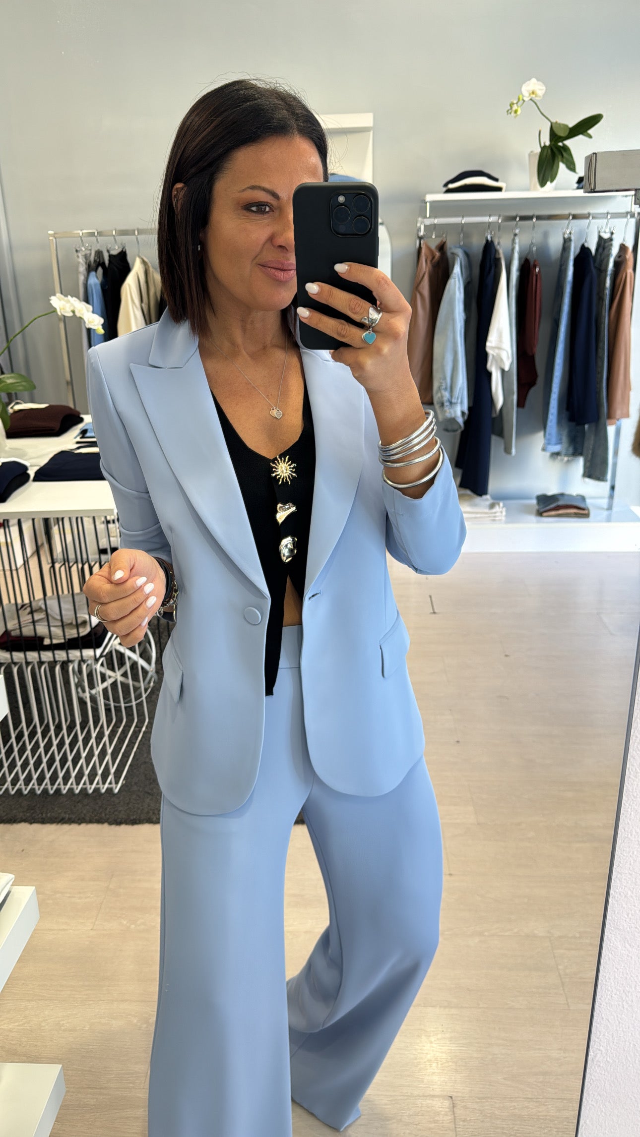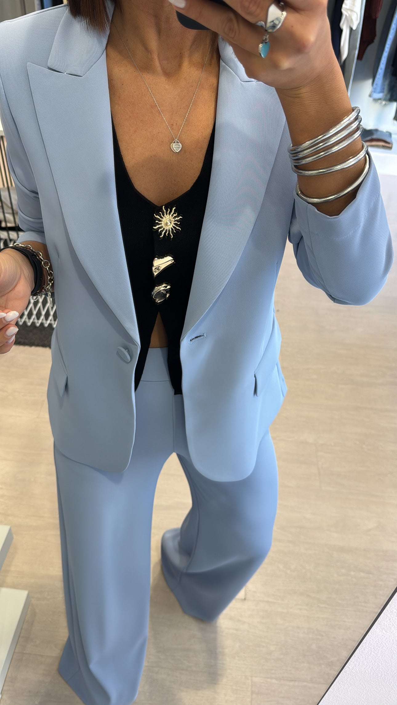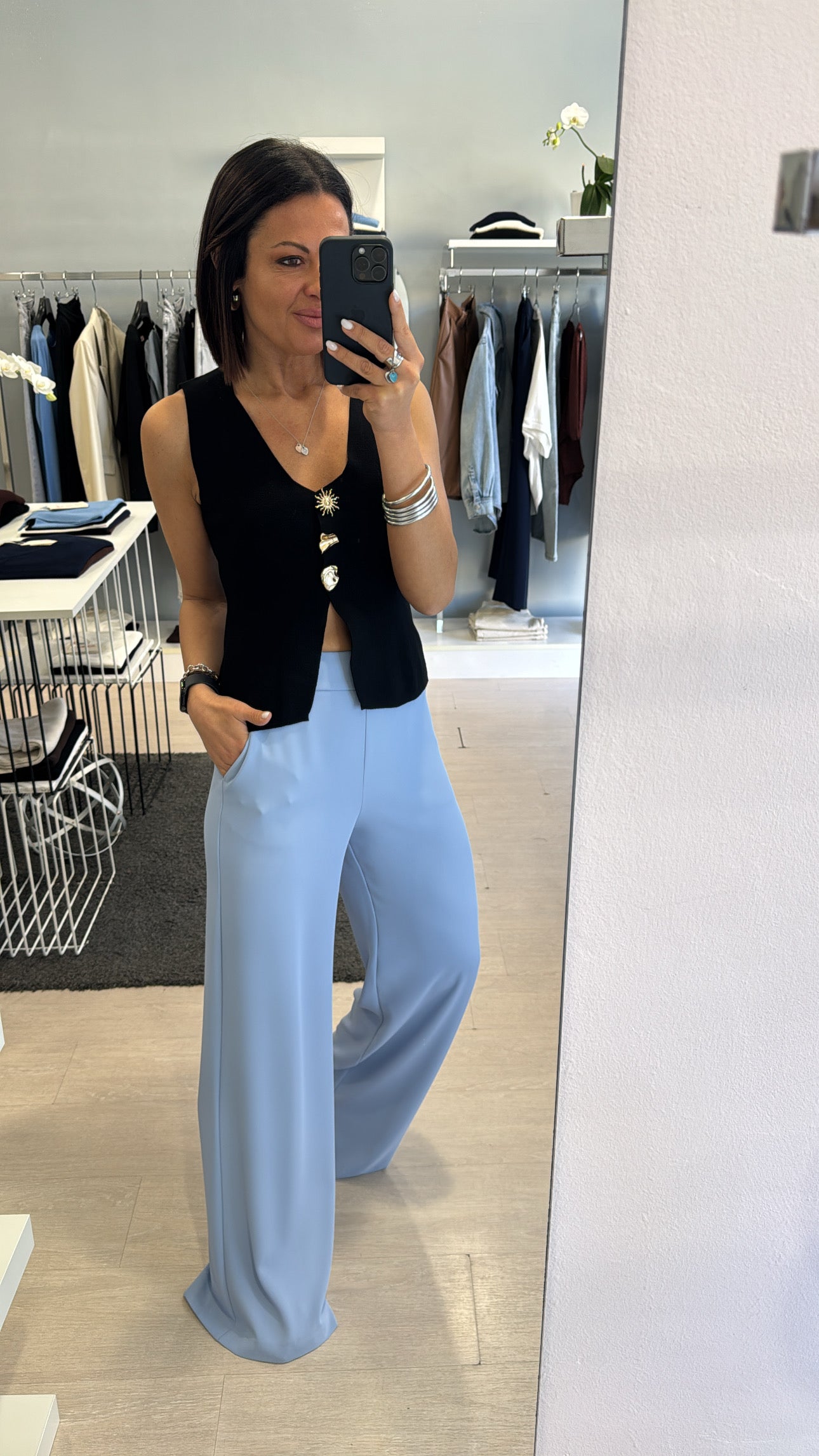 Gilet Kontatto scollato a V chiuso frontalmente da bottoni gioiello, lunghezza in vita con piccola apertura frontale, modello sfiancato