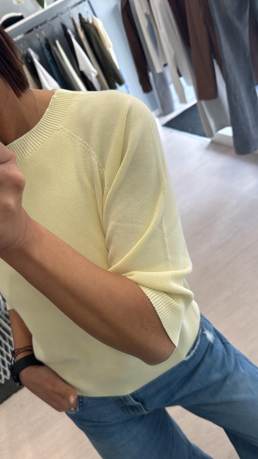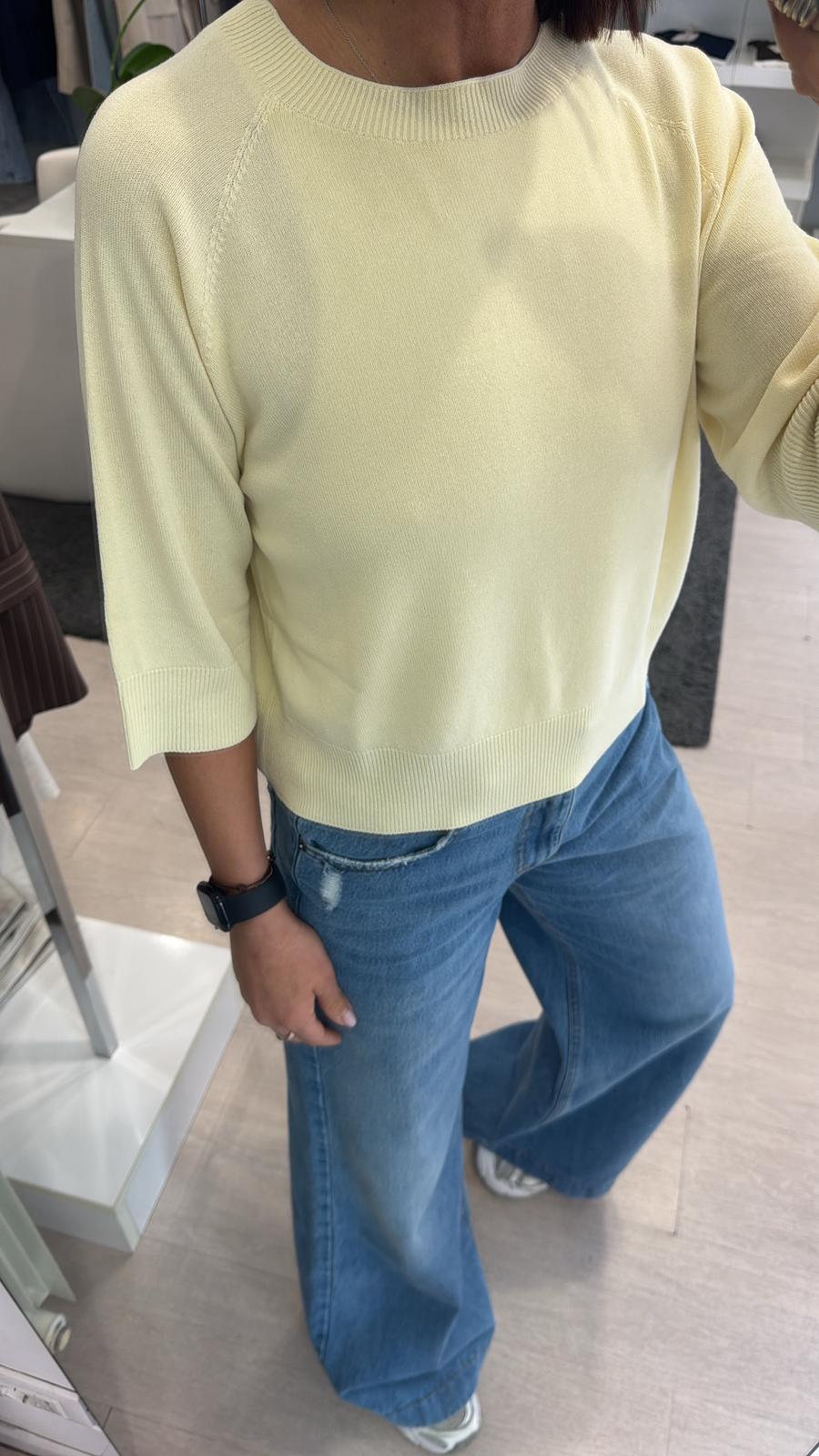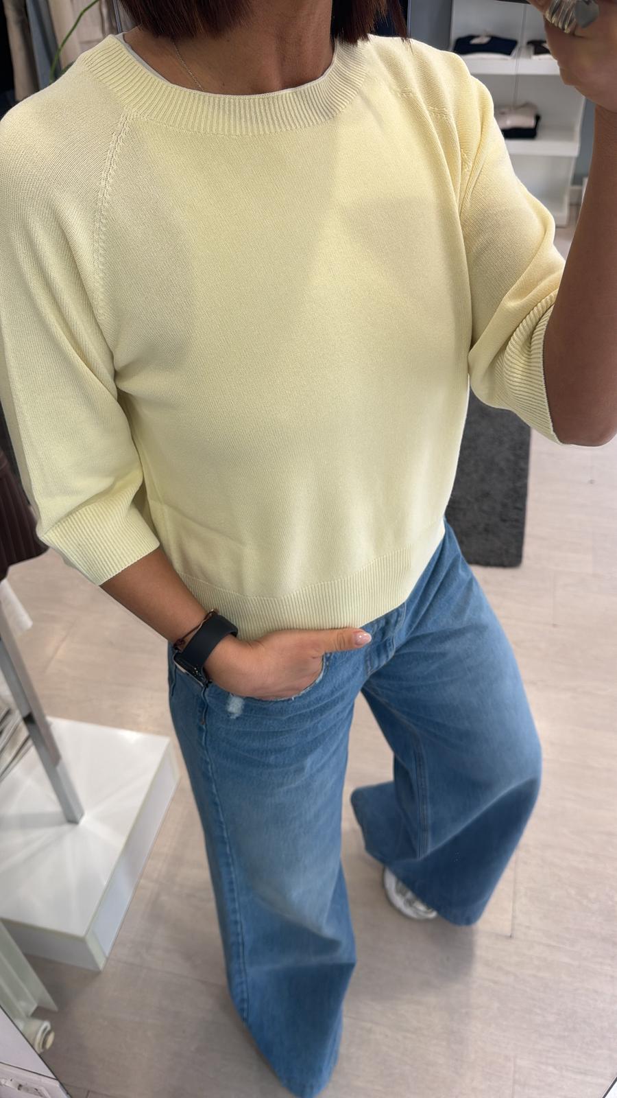 Maglia Kontatto, modello girocollo effetto morbido, manica 3/4 lunghezza regolare • vestibilità regolare taglia unica • colore giallo pastello• 87%...