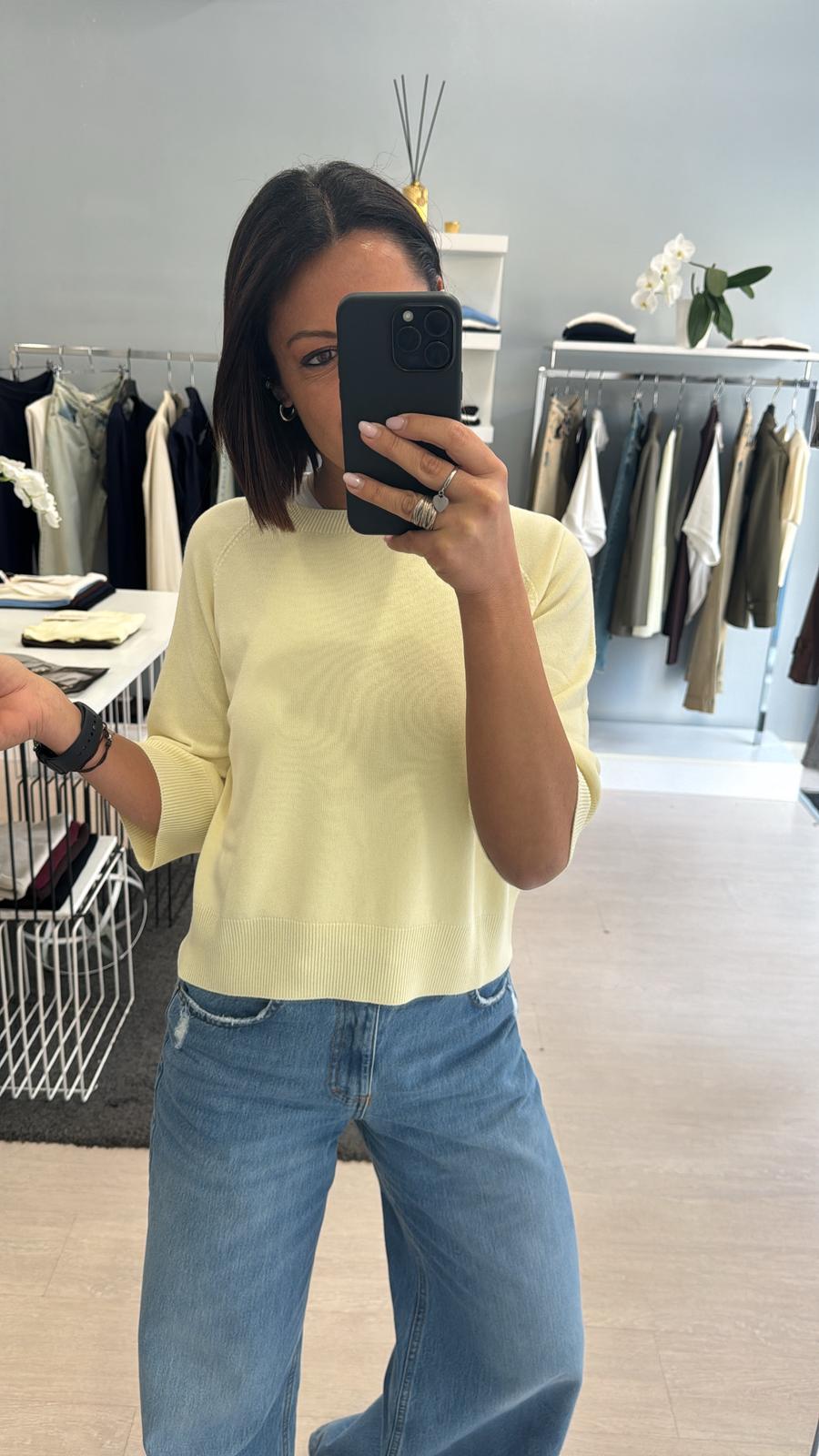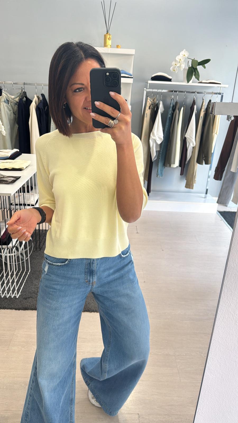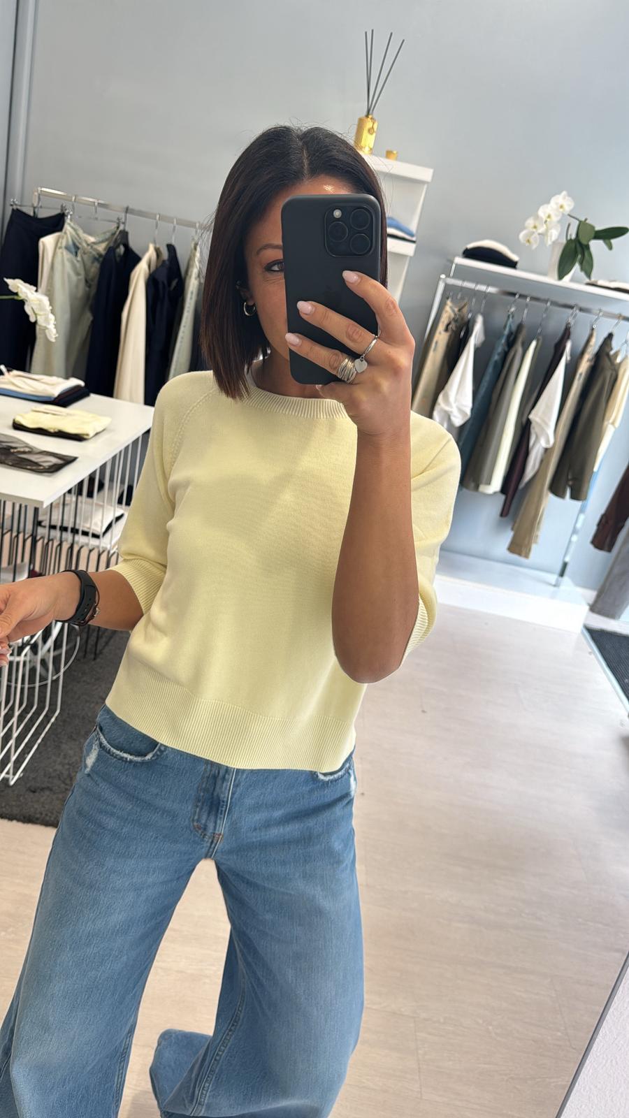 Maglia Kontatto, modello girocollo effetto morbido, manica 3/4 lunghezza regolare • vestibilità regolare taglia unica • colore giallo pastello• 87%...