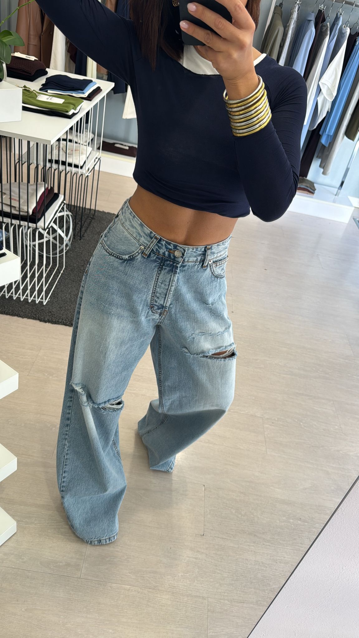 Jeans modello palazzo, vita altezza ombelico, tasche alte sul retro e doppia cucitura, effetto largo su tutta la gamba, strappi su entrambe le gambe