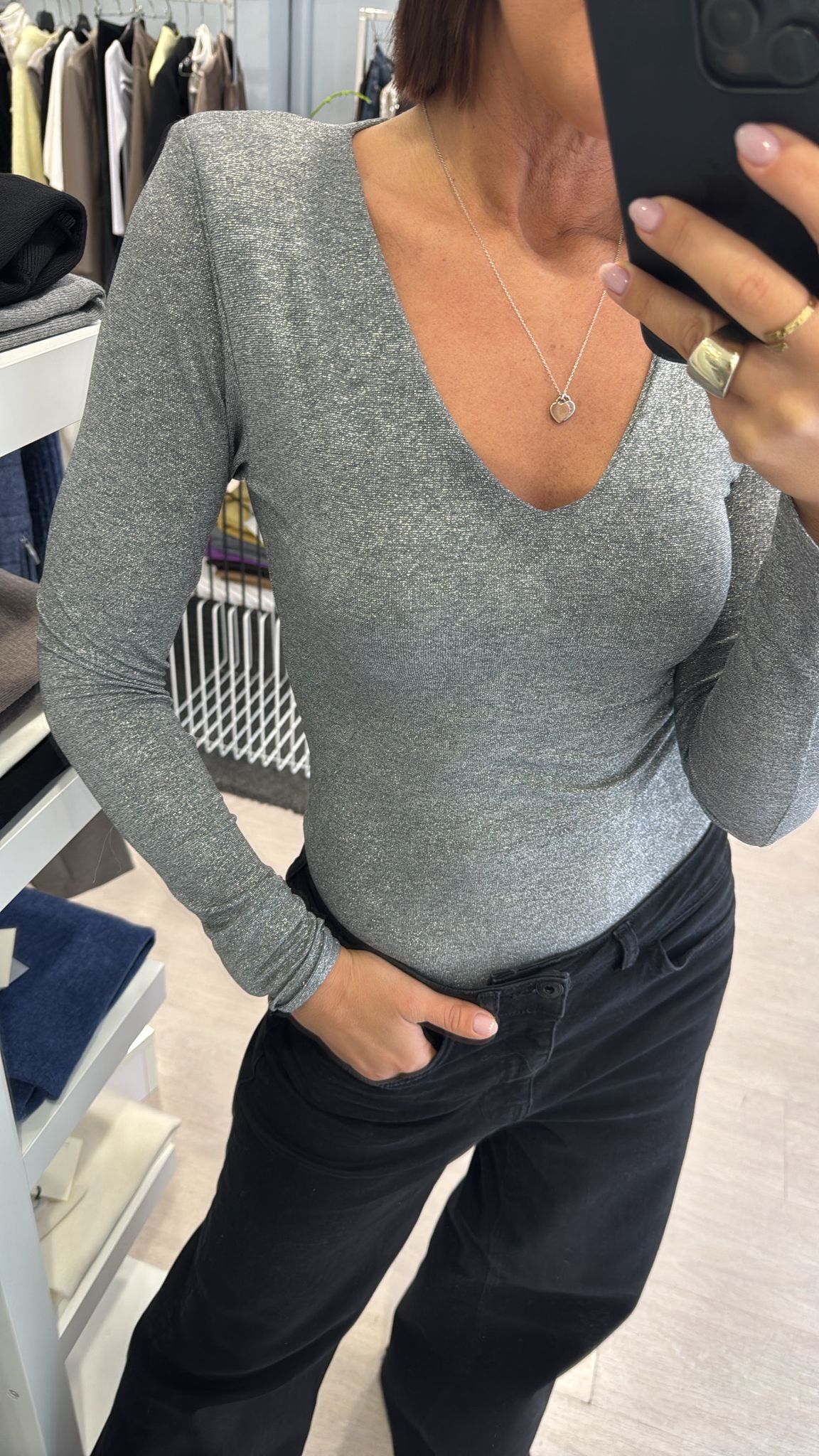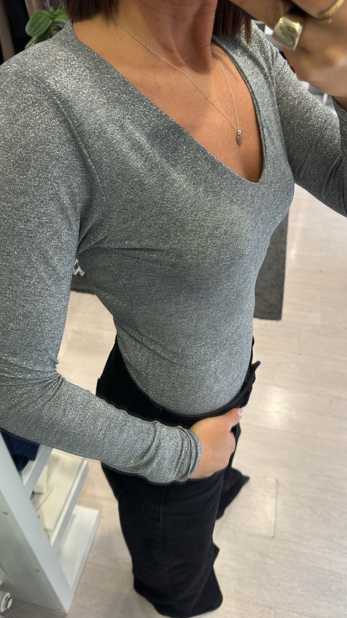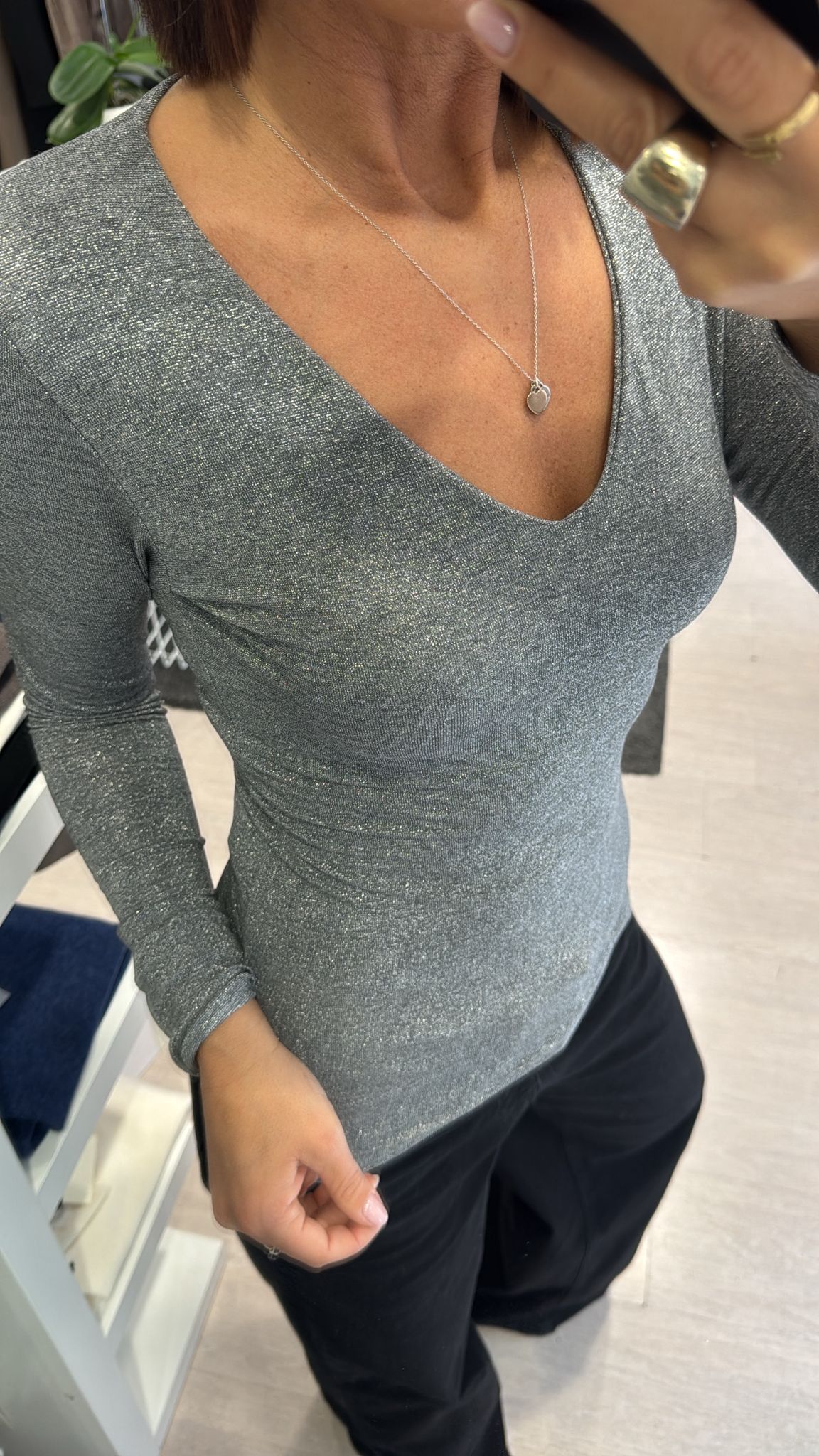 Maglia manica lunga in filo di lurex argentato, scollatura a V, lunghezza regolare, modello sfiancato, spalline imbottite che possono essere tranquillamente tolte