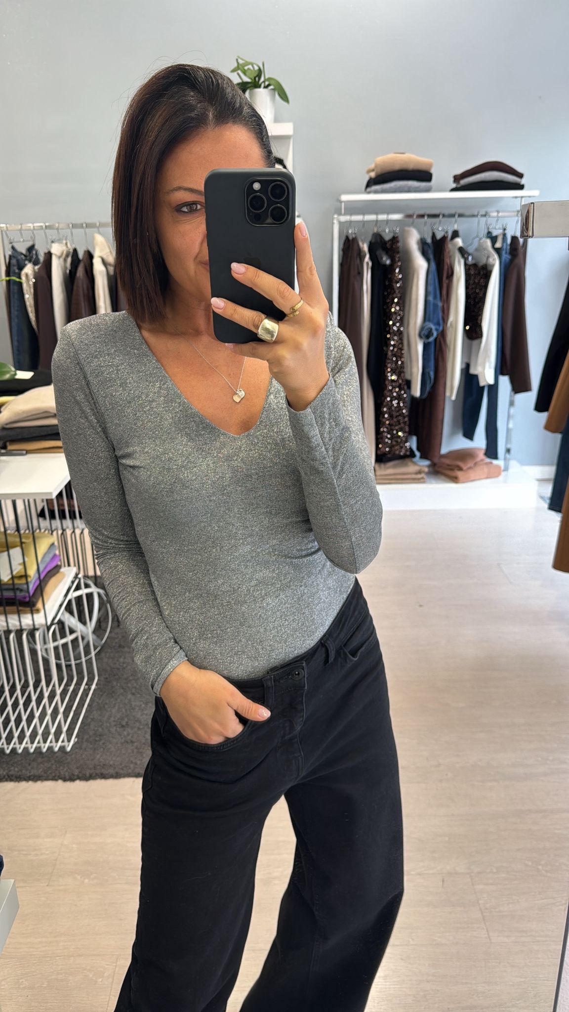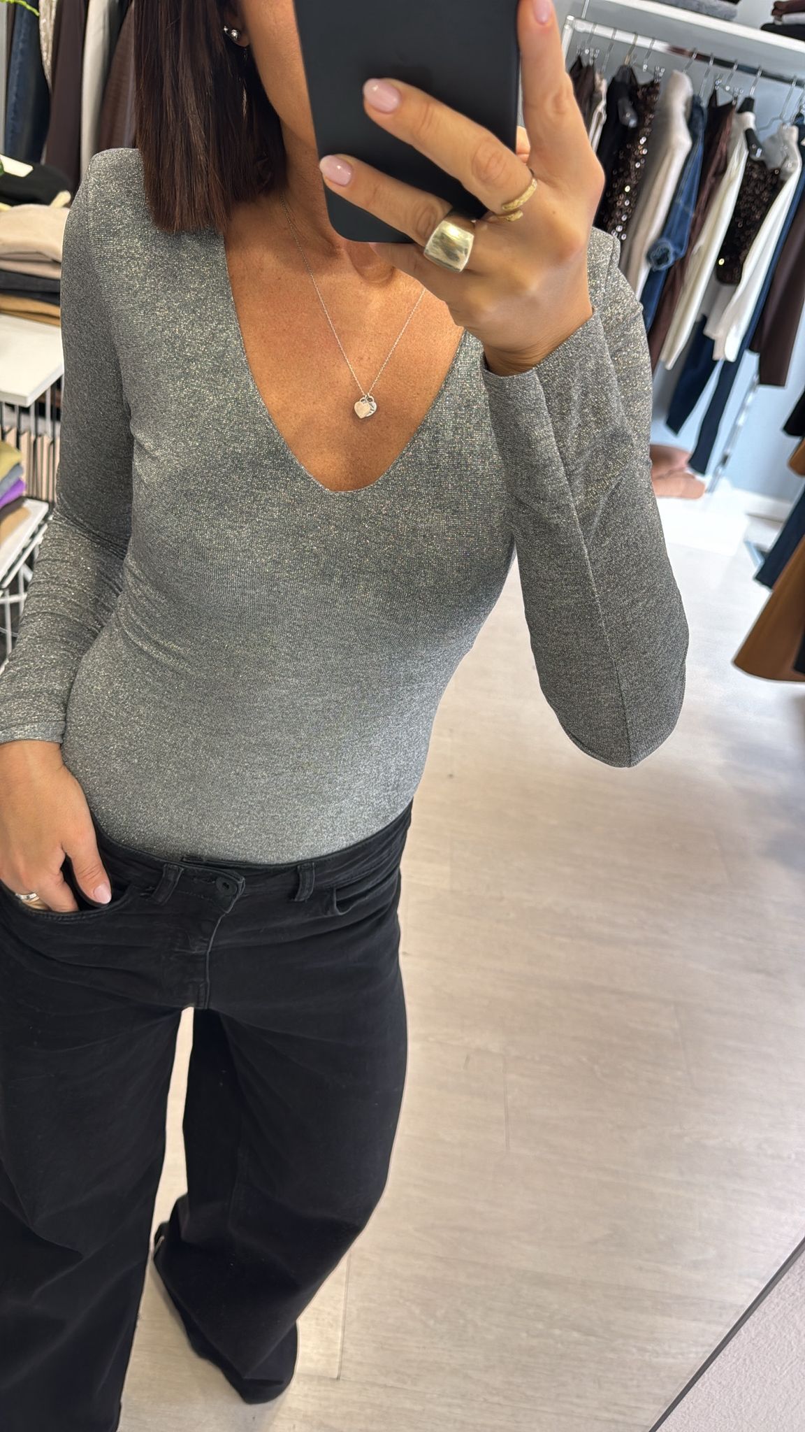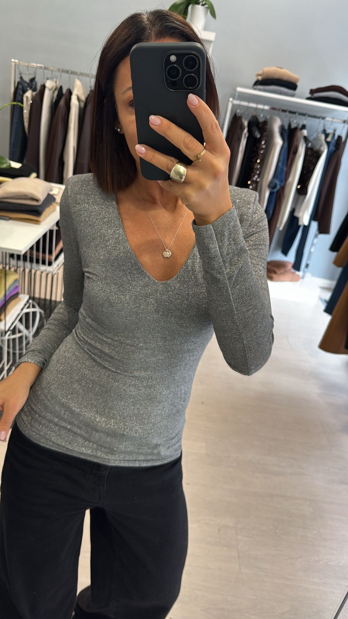 Maglia manica lunga in filo di lurex argentato, scollatura a V, lunghezza regolare, modello sfiancato, spalline imbottite che possono essere tranquillamente tolte