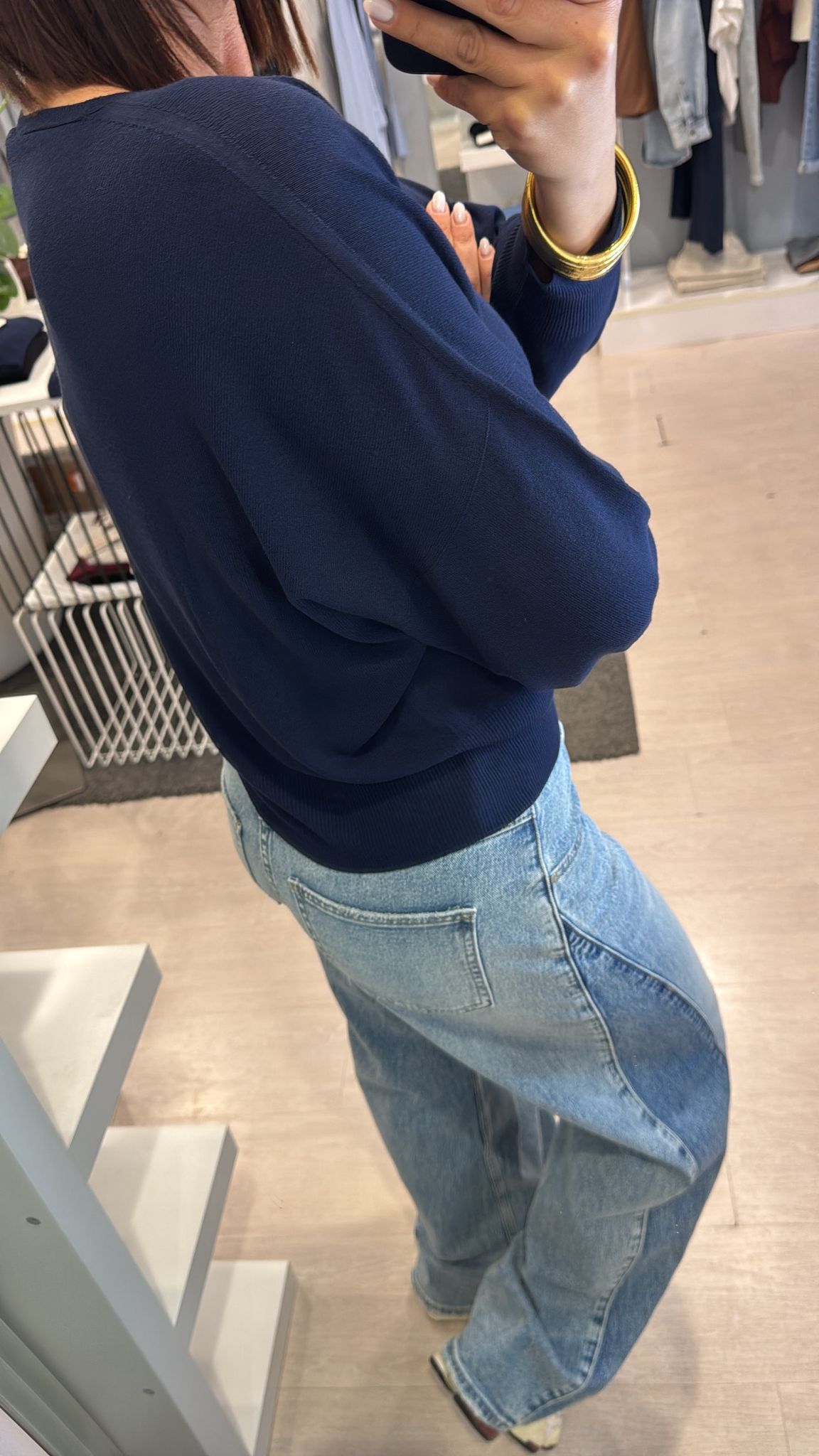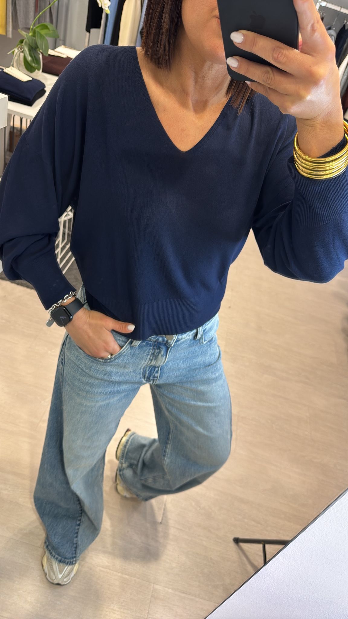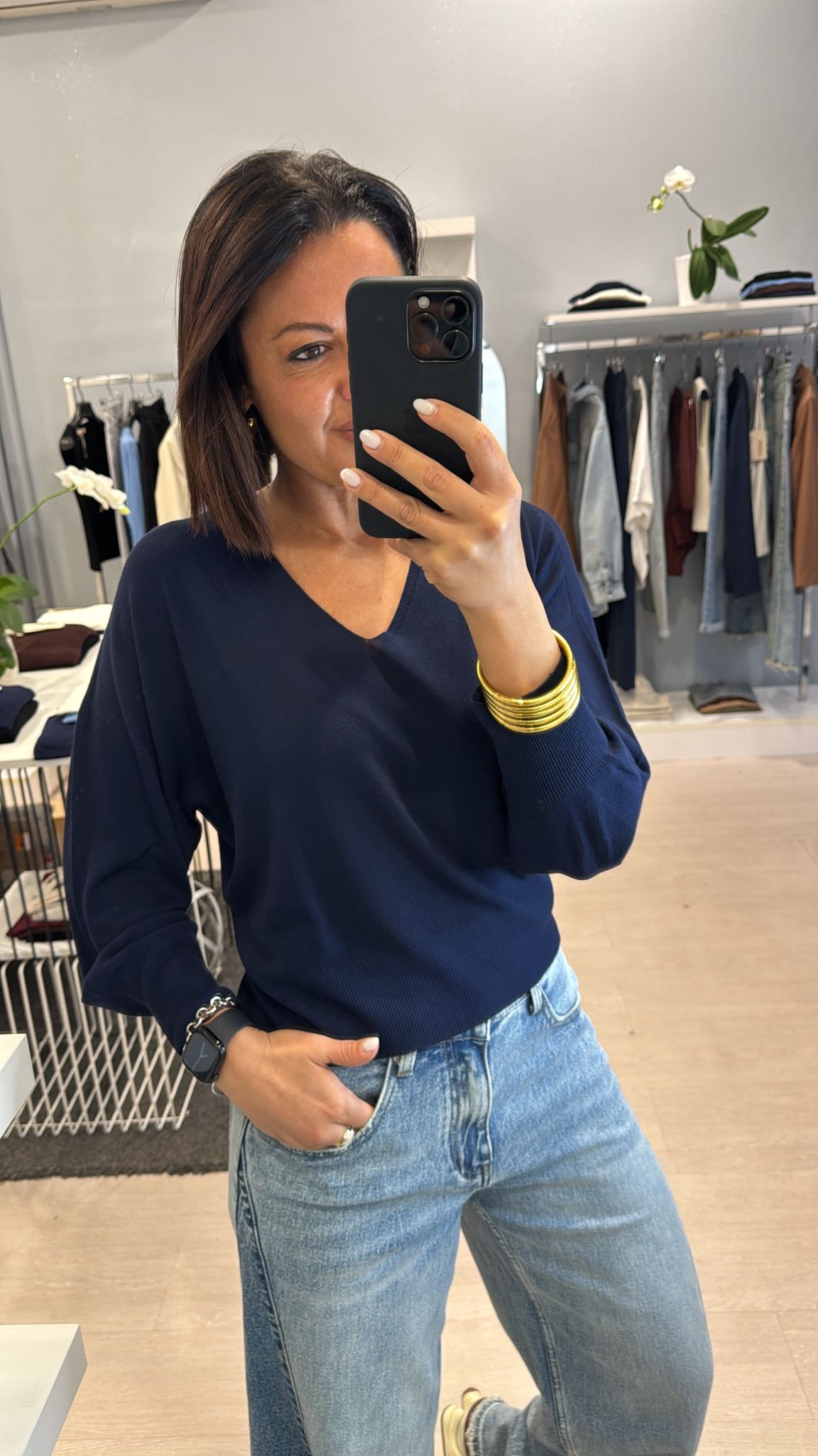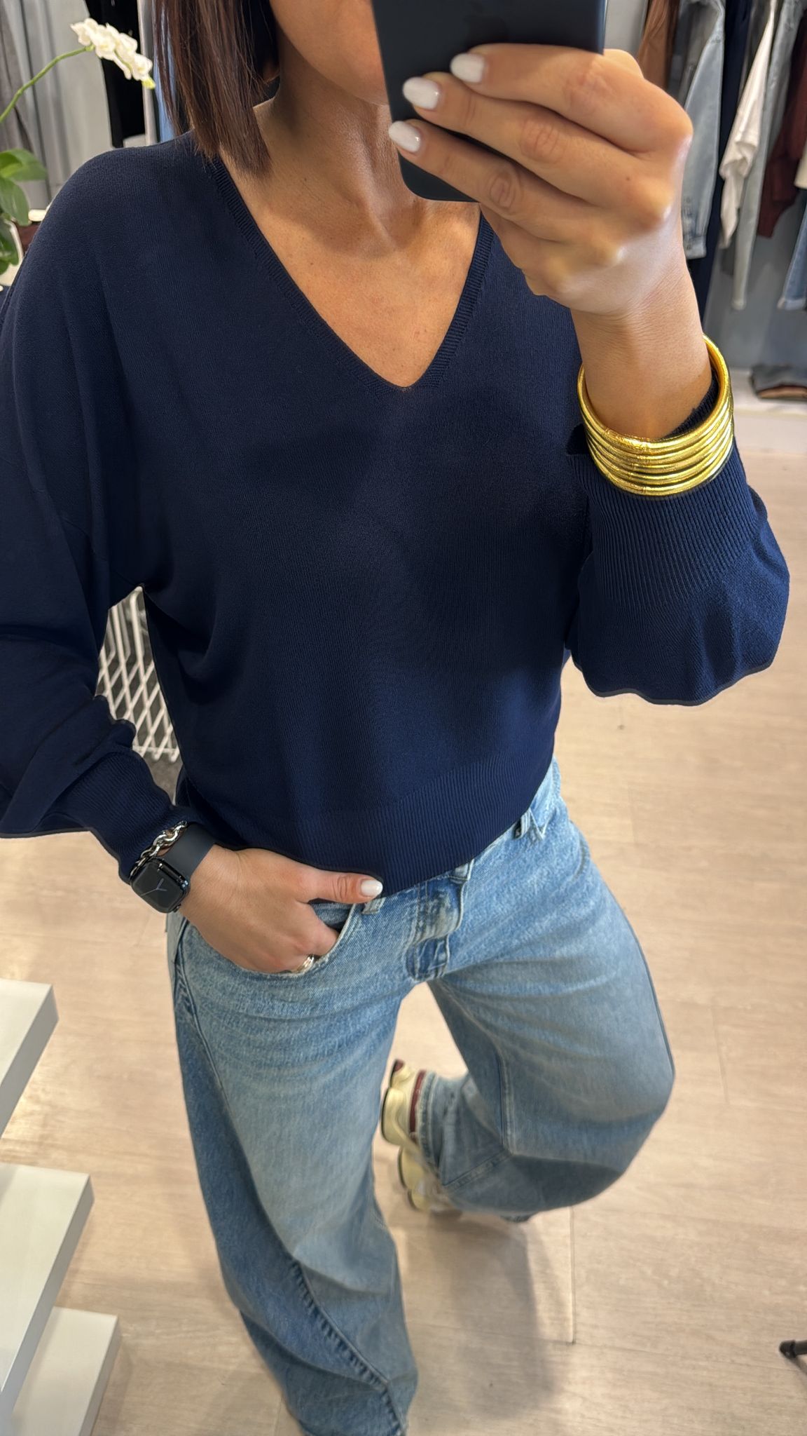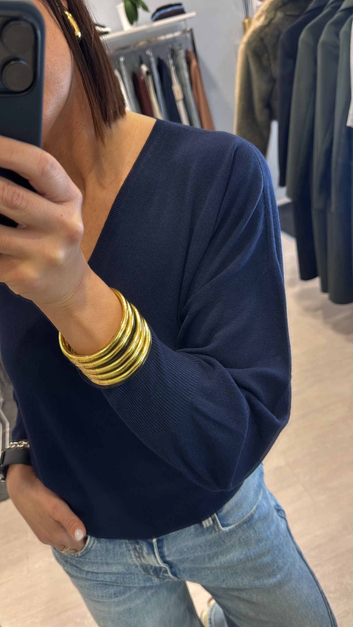 Maglia Kontatto, modello scollato a V, lunghezza regolare, effetto leggermente mosso, manica con un leggero effetto palloncino fluido fermato dal polsino