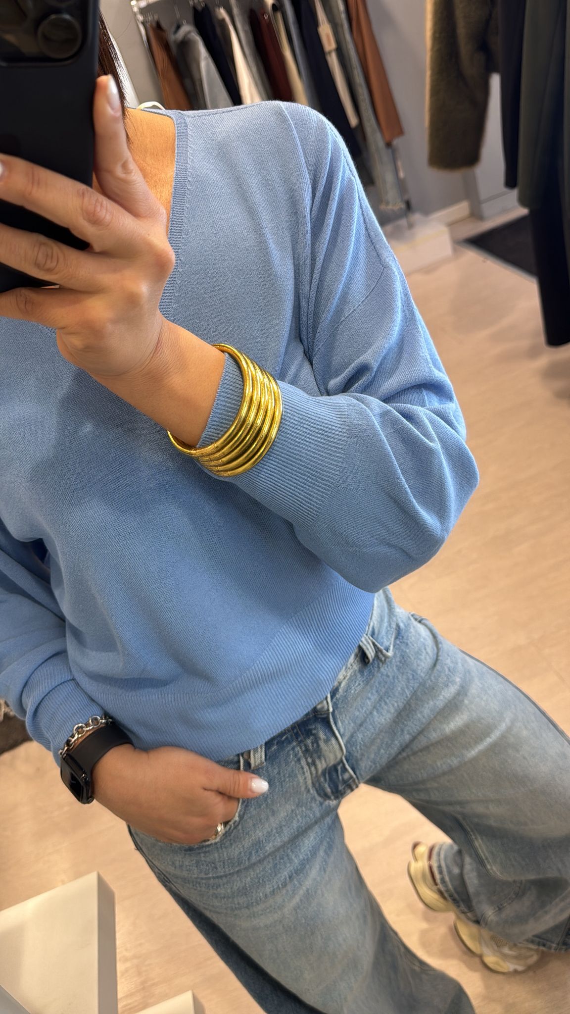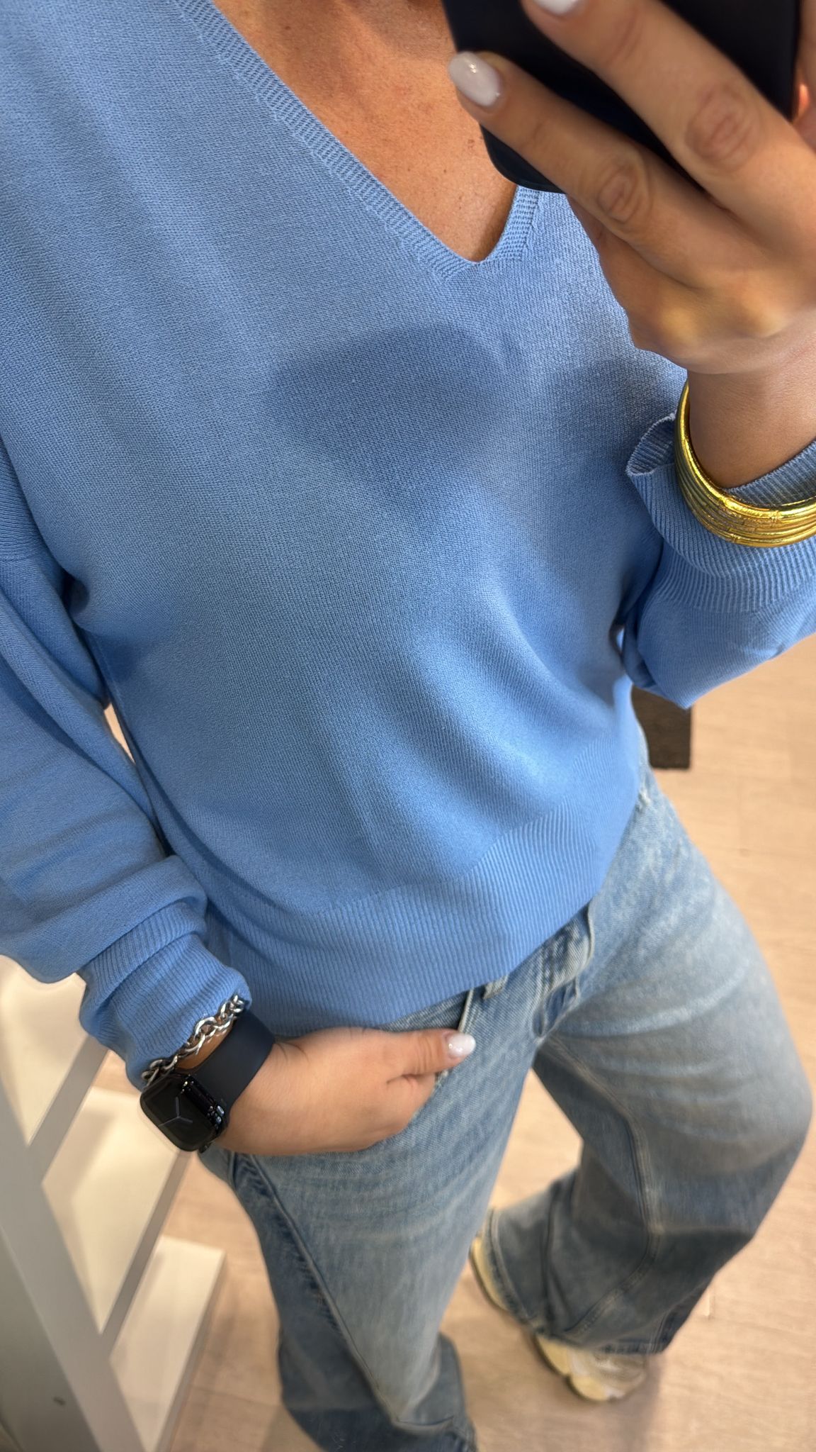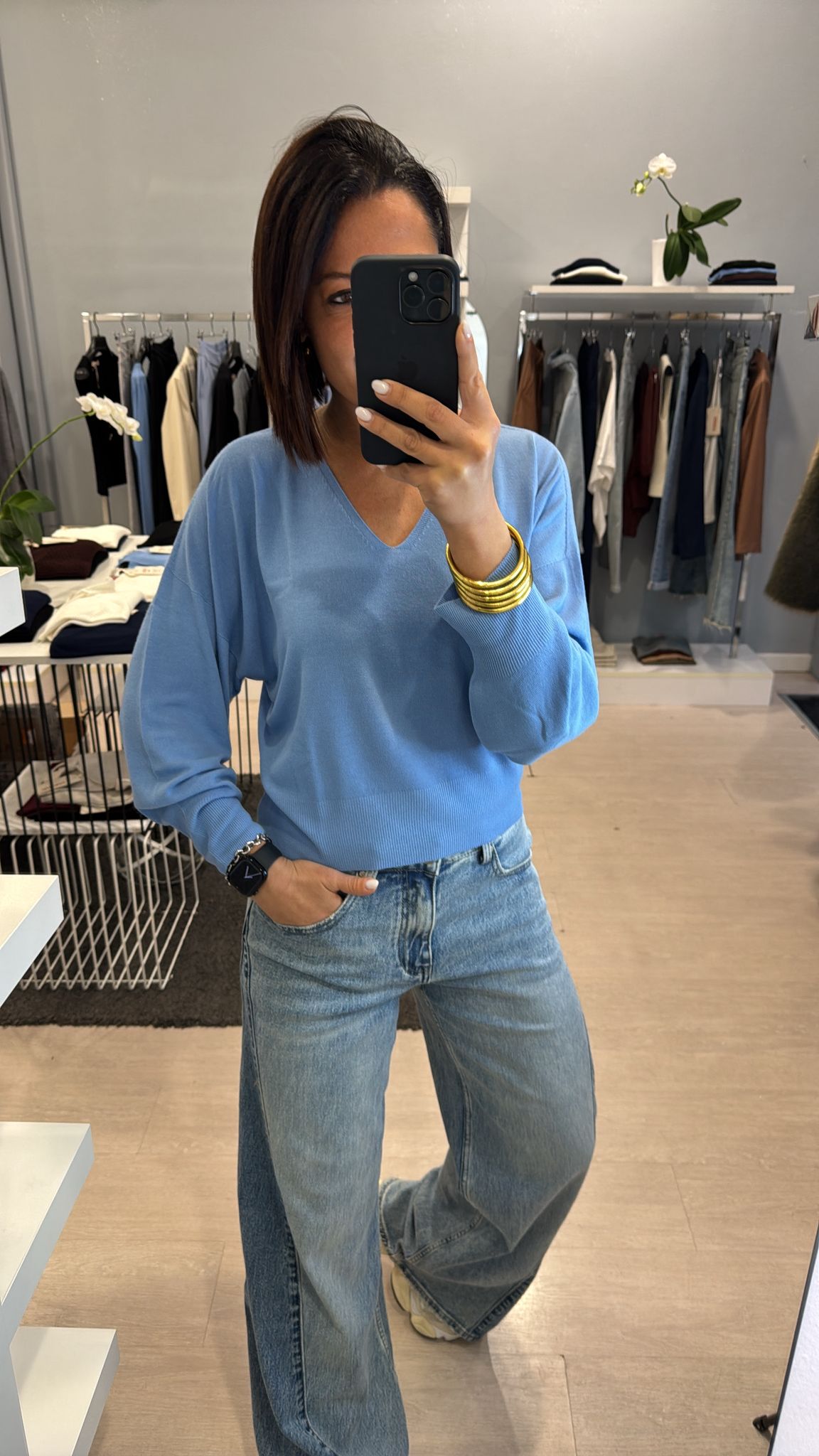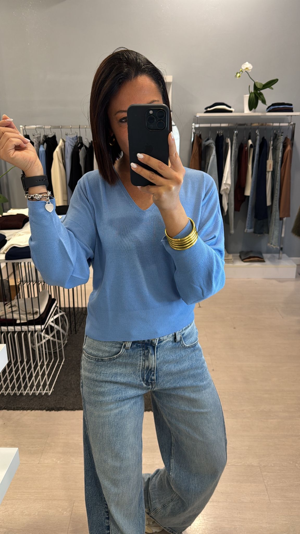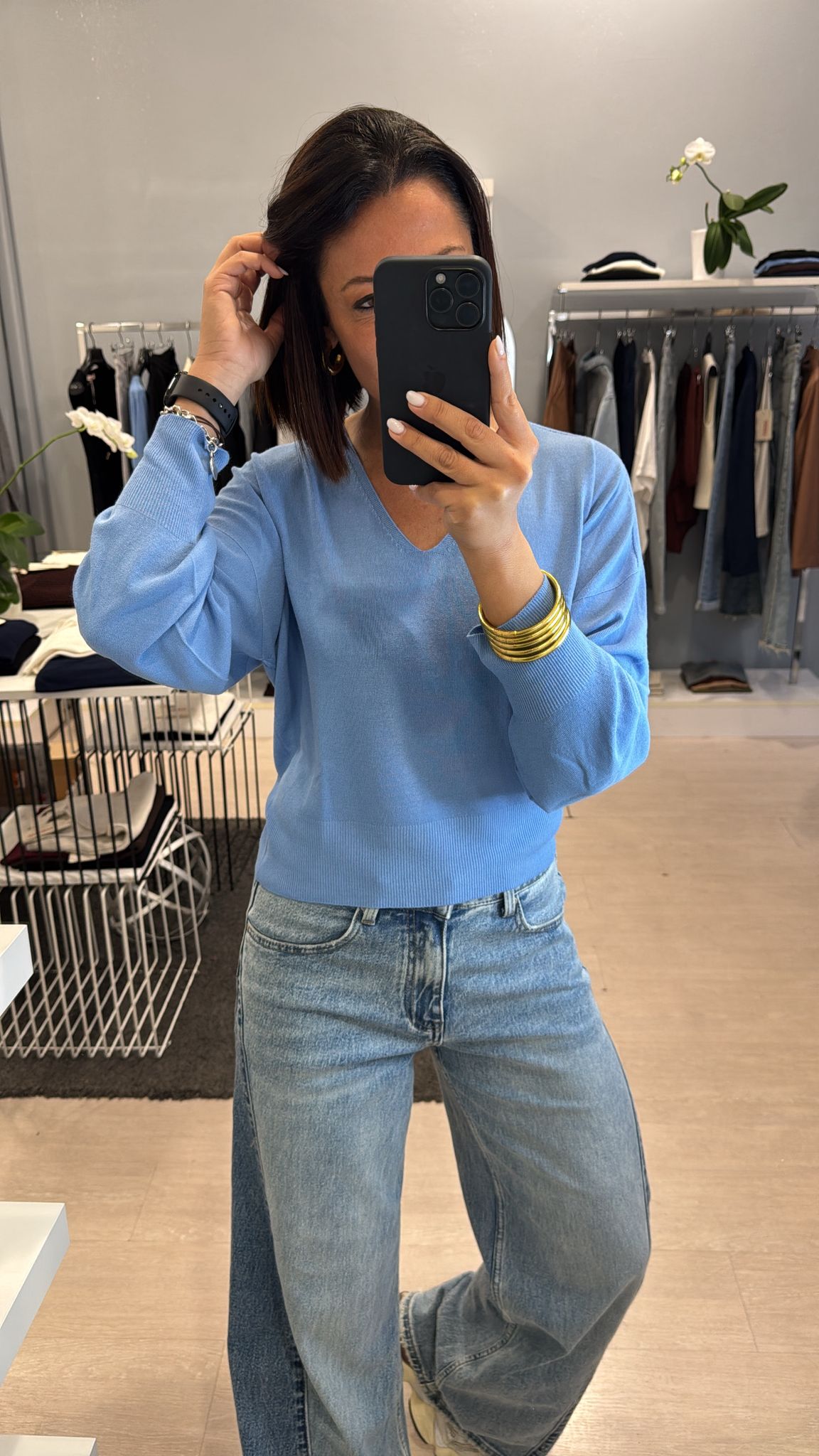 Maglia Kontatto, modello scollato a V, lunghezza regolare, effetto leggermente mosso, manica con un leggero effetto palloncino fluido fermato dal polsino