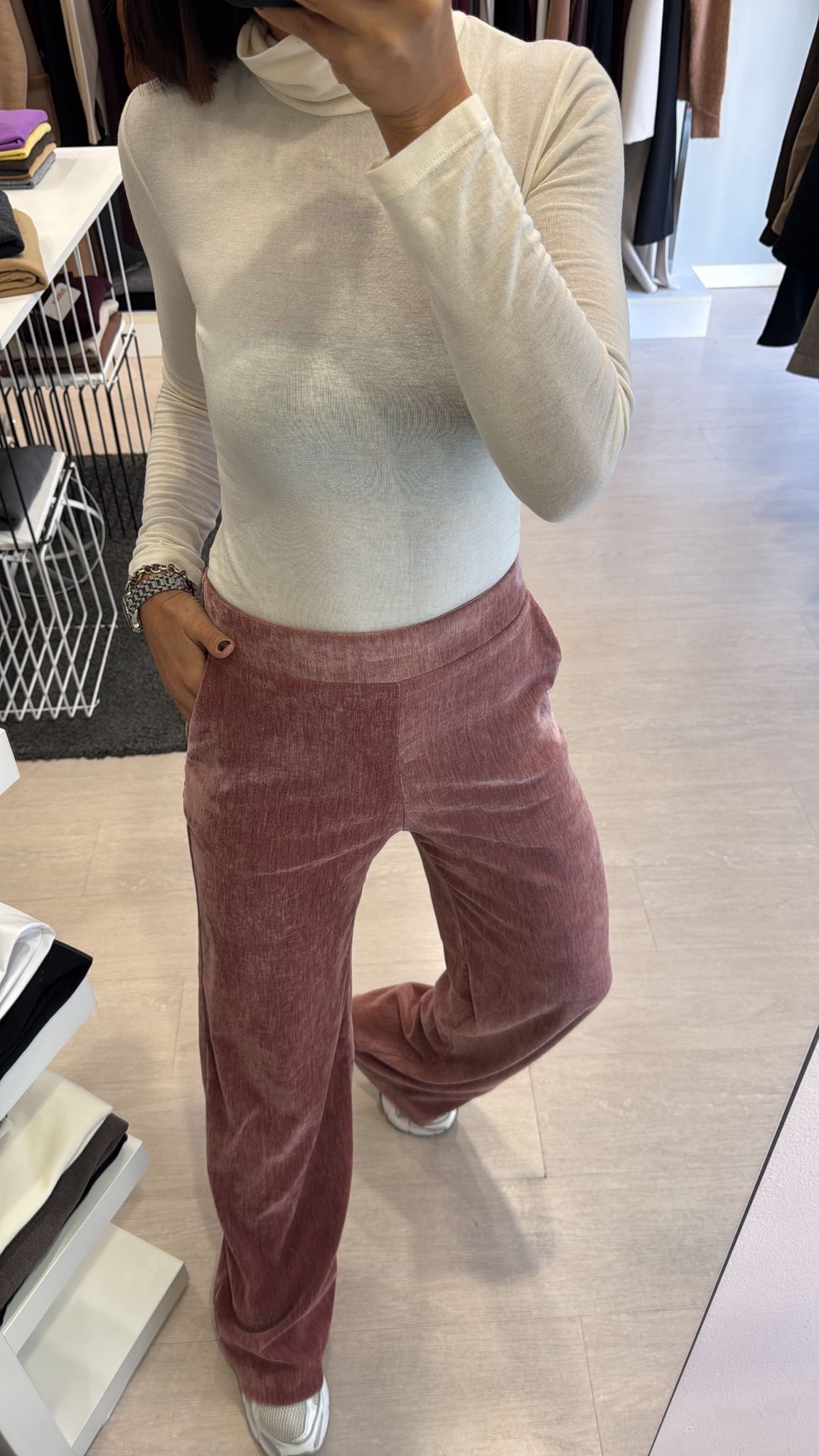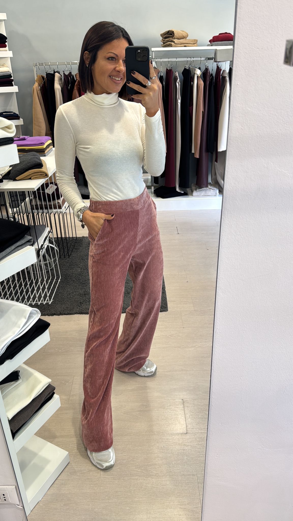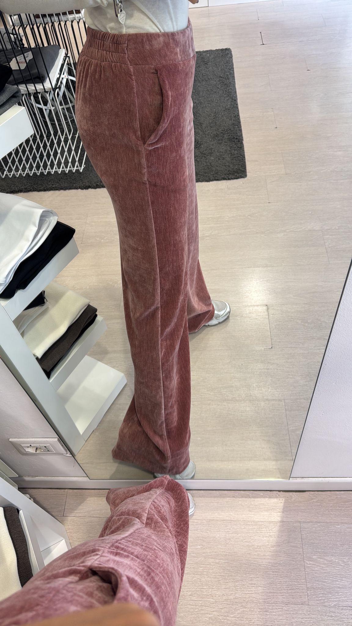 Pantalone modello flare, elastico sul retro della vita, tasche laterali, sfiancato in vita e fianco, gamba dritta vestibilità regolare IN...
