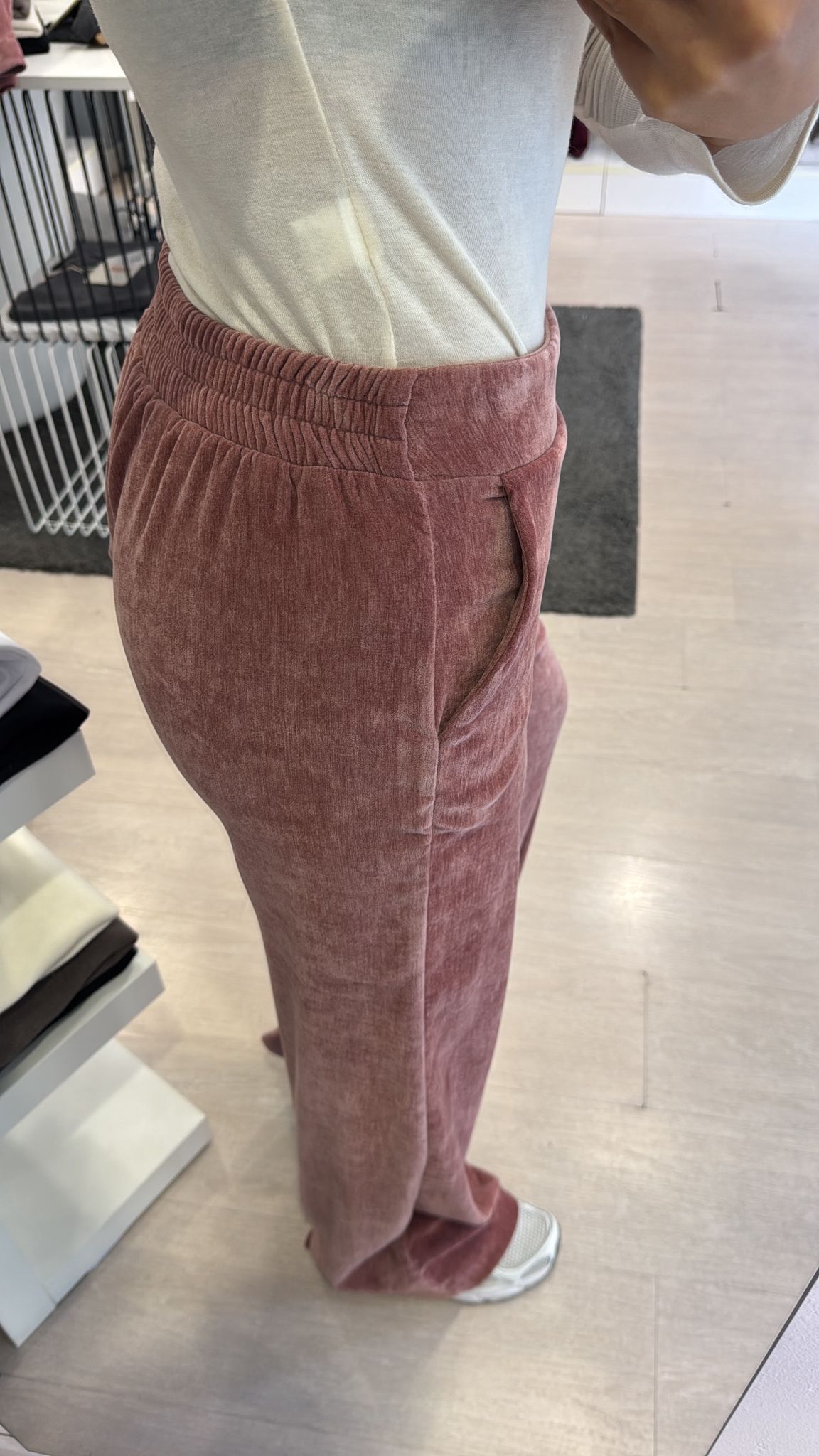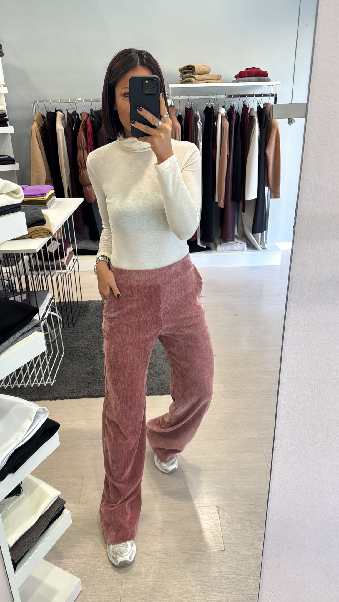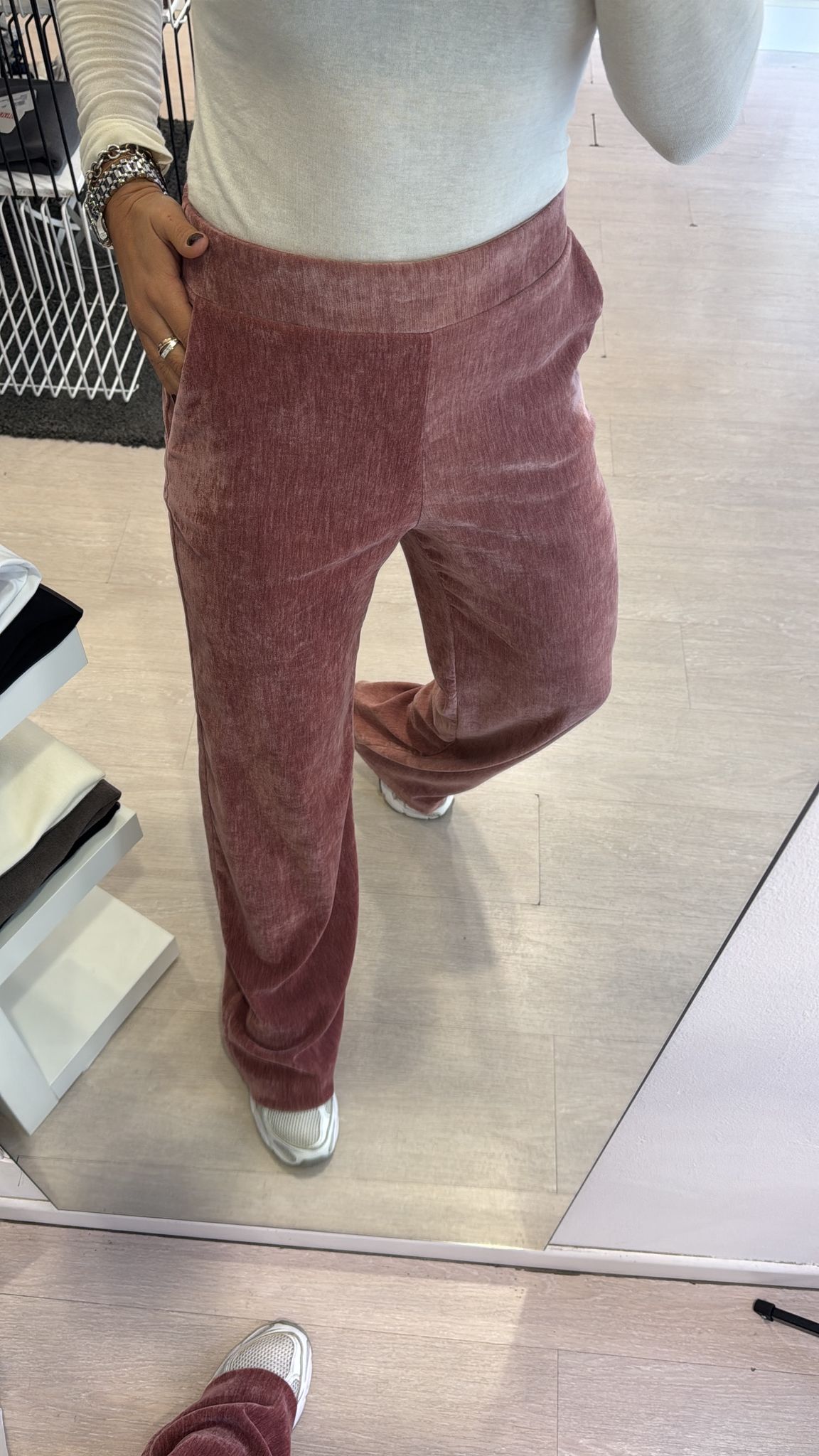 Pantalone modello flare, elastico sul retro della vita, tasche laterali, sfiancato in vita e fianco, gamba dritta vestibilità regolare IN...