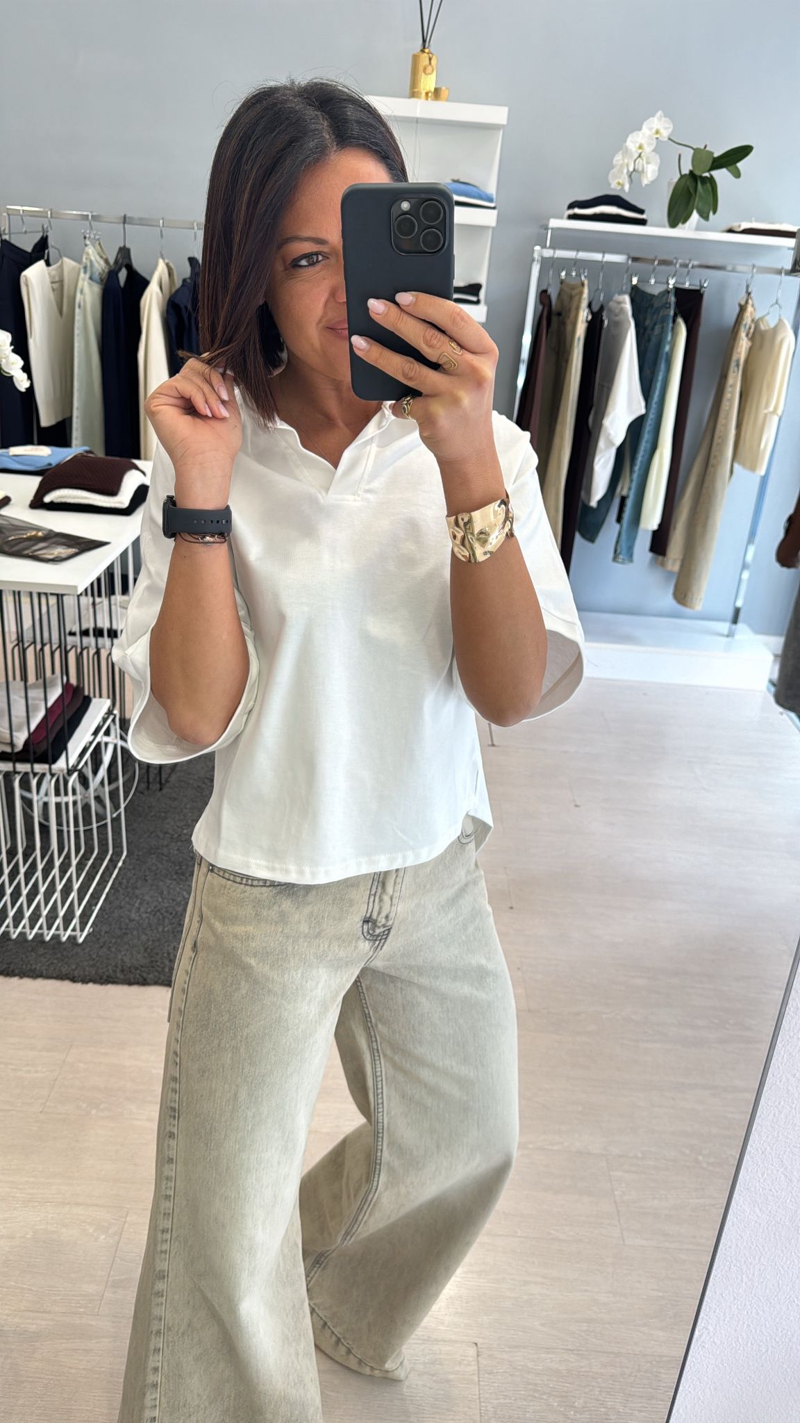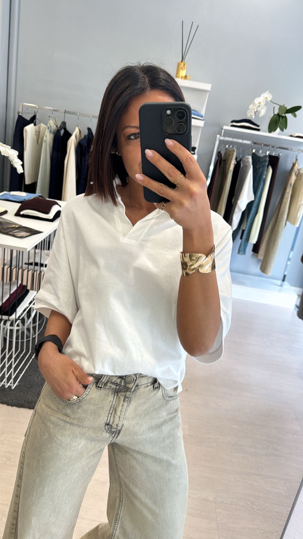 Polo dal taglio moderno per uno stile più urbano e rilassato, silhouette ampia e spalle scese, scollo a V , caratterizzata da una cucitura orizzontale sul retro che ne definisce la struttura e garantisce l'ottima vestibilità, maniche ampie al gomito e piccoli spacchetti sul fondo che permettono al tessuto di cadere perfettamente