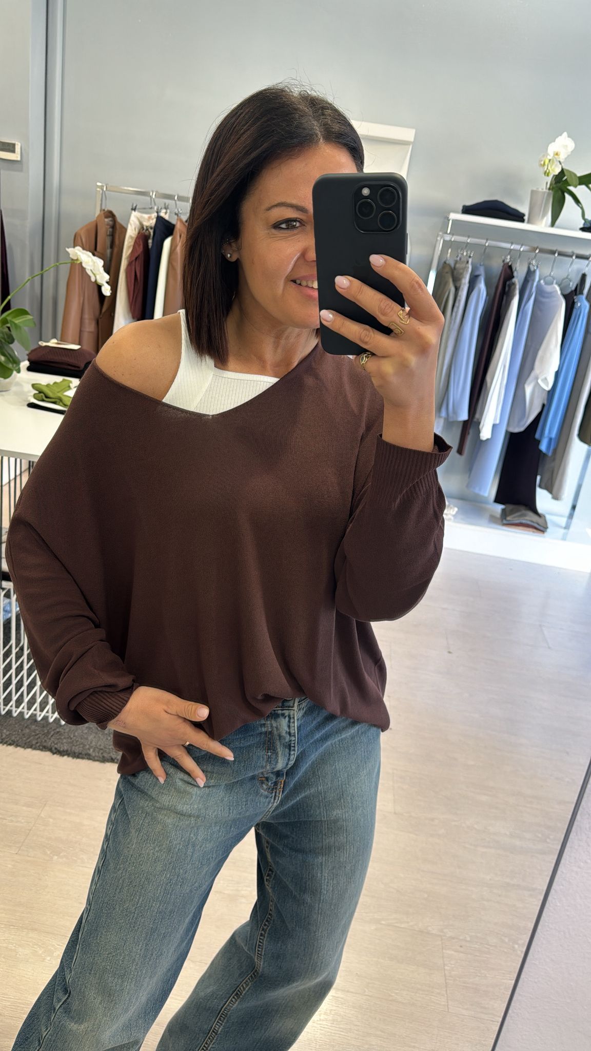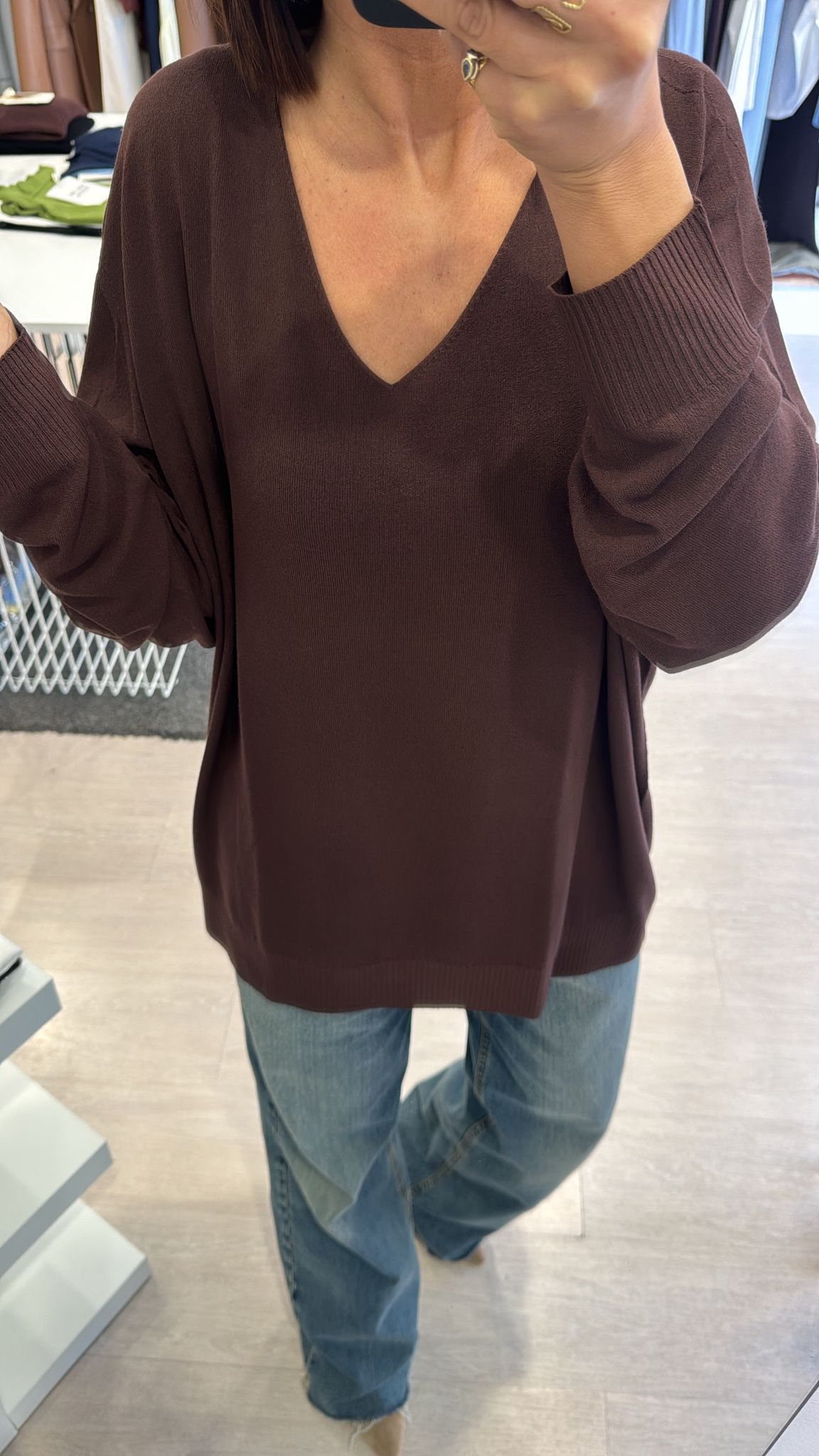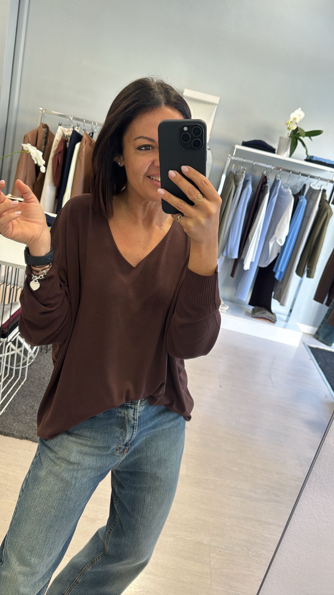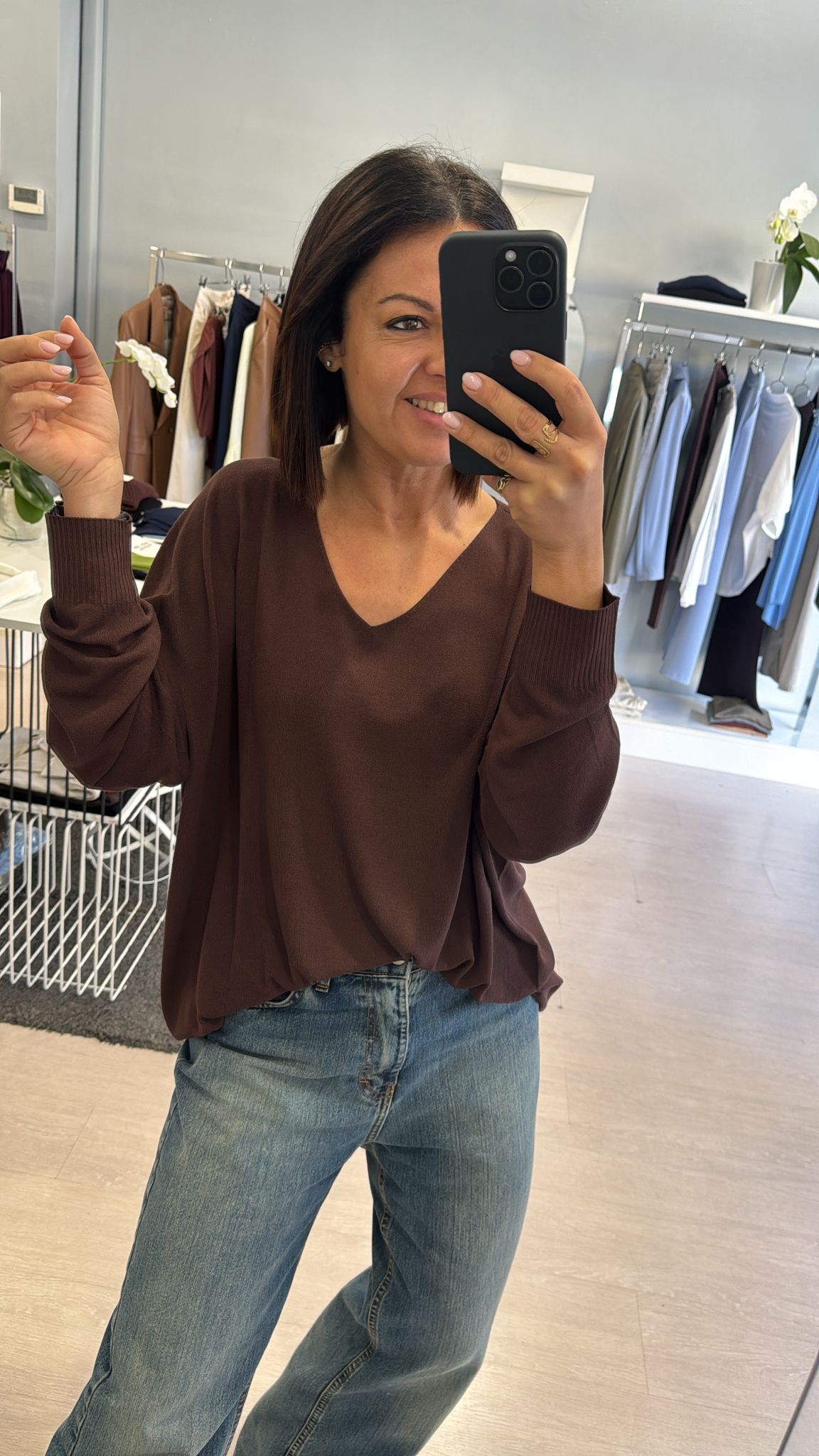 Maglia Kontatto, modello over con scollatura a V, lunghezza sotto il fianco, modello dall'effetto stondato
