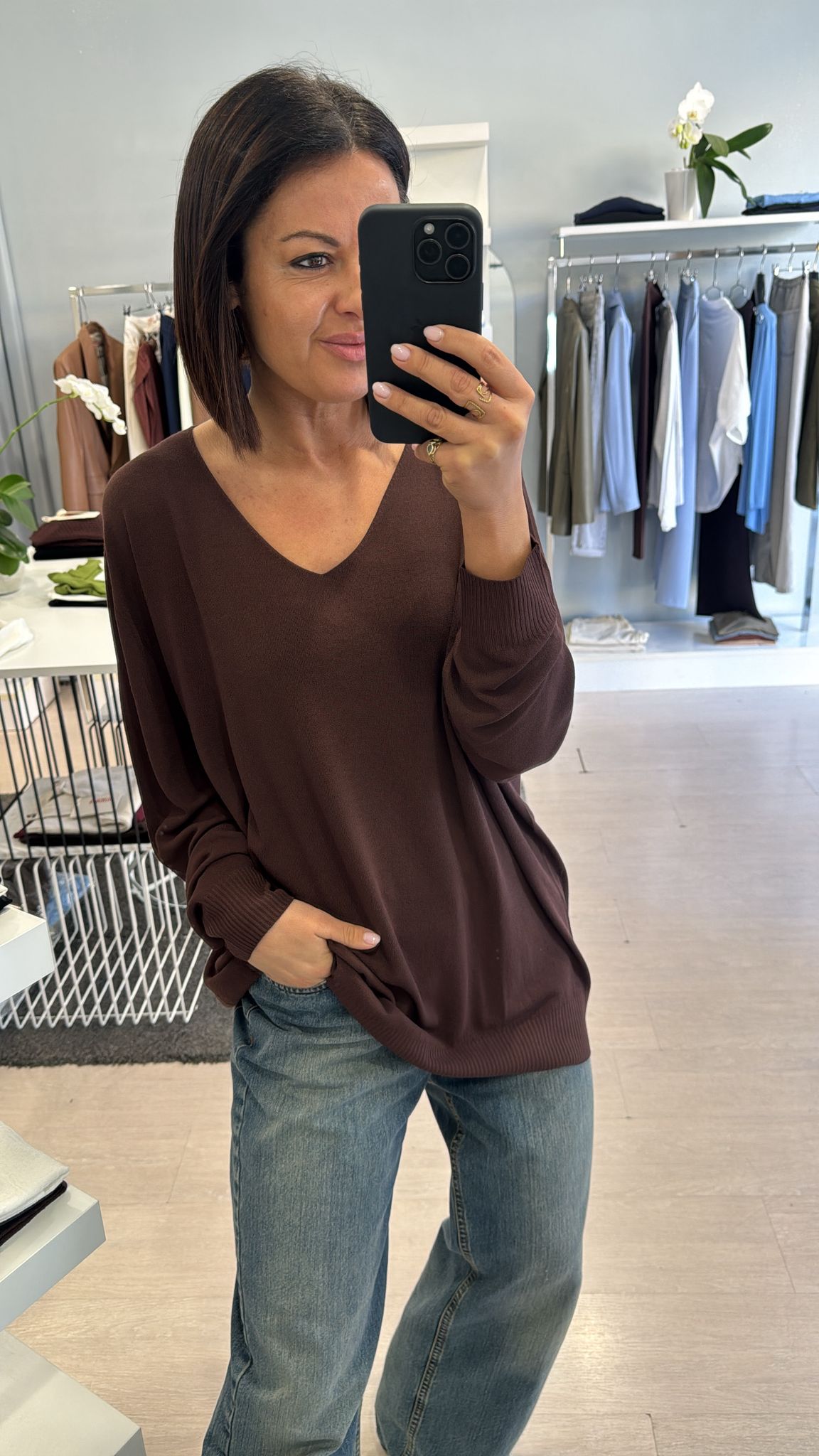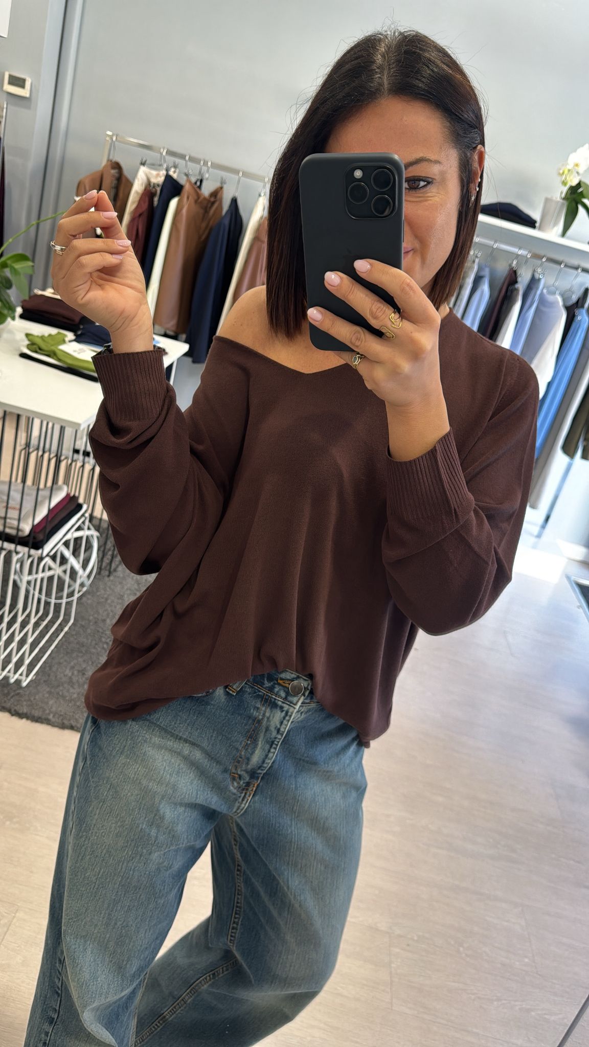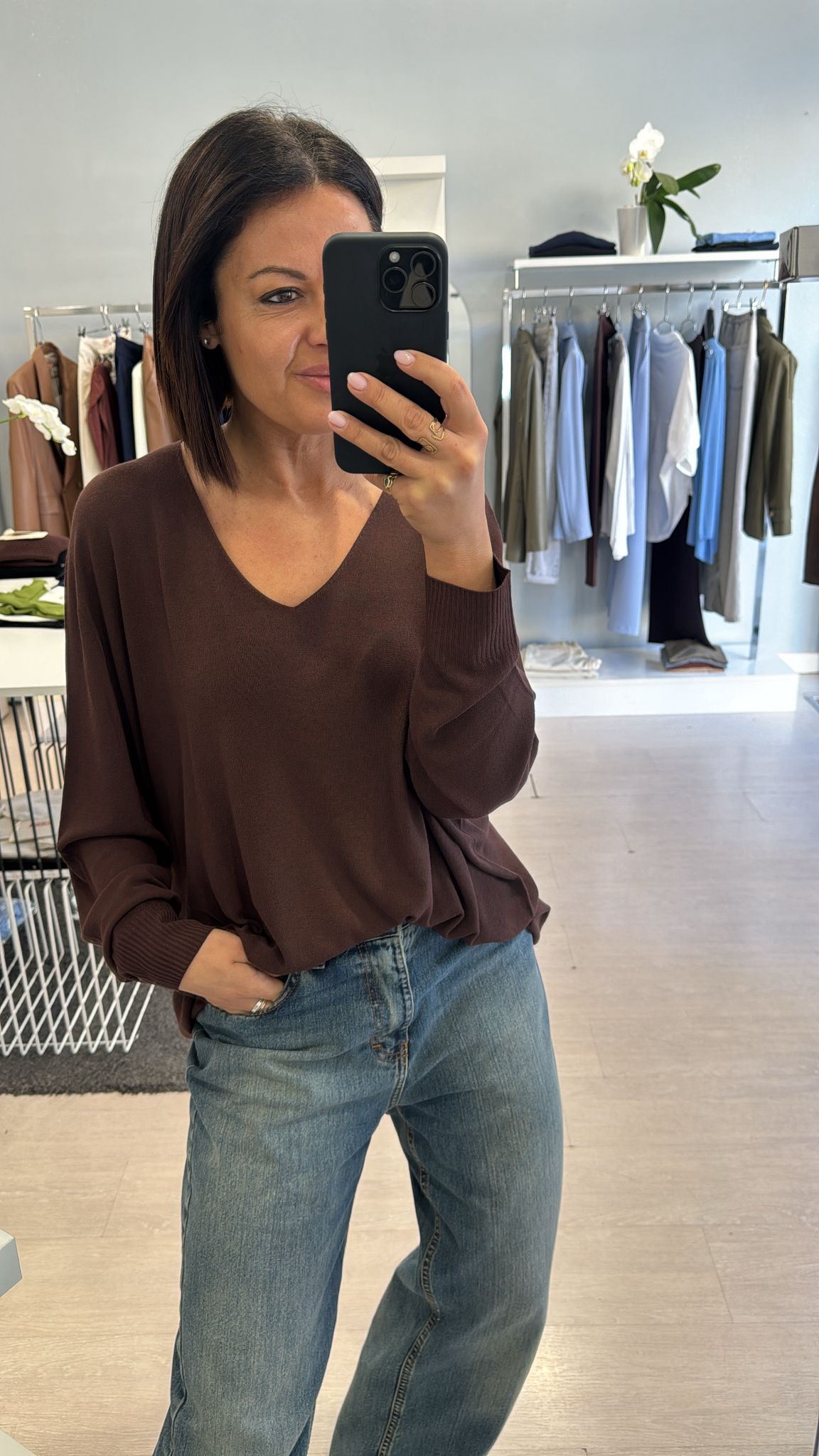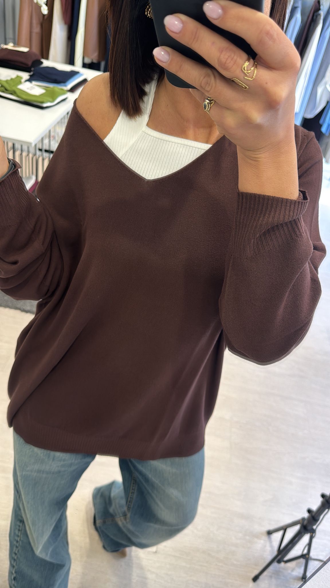 Maglia Kontatto, modello over con scollatura a V, lunghezza sotto il fianco, modello dall'effetto stondato