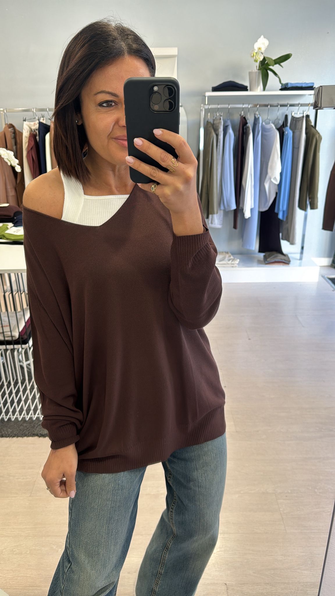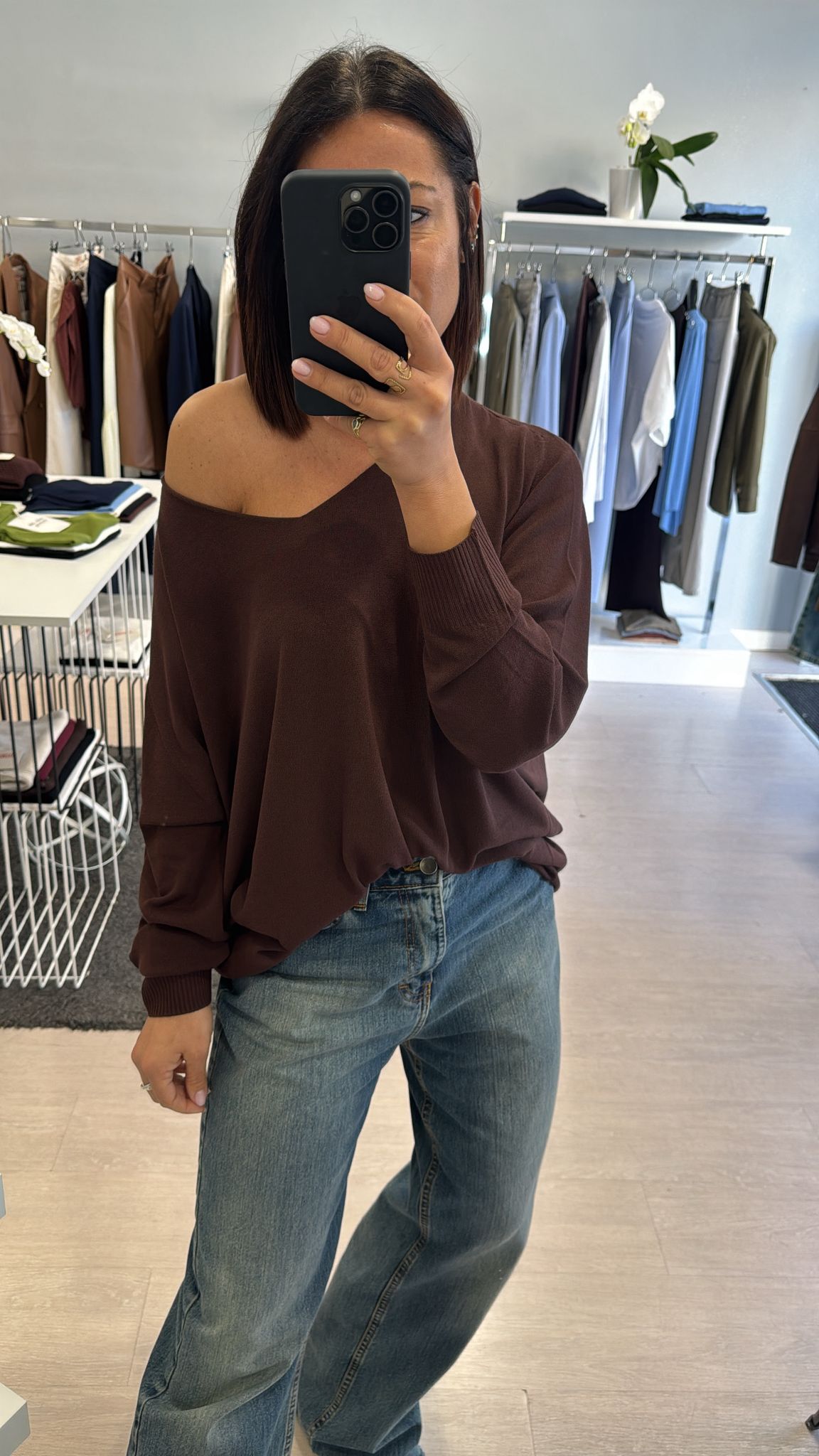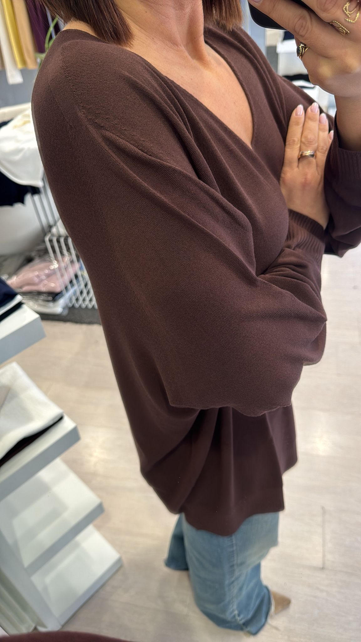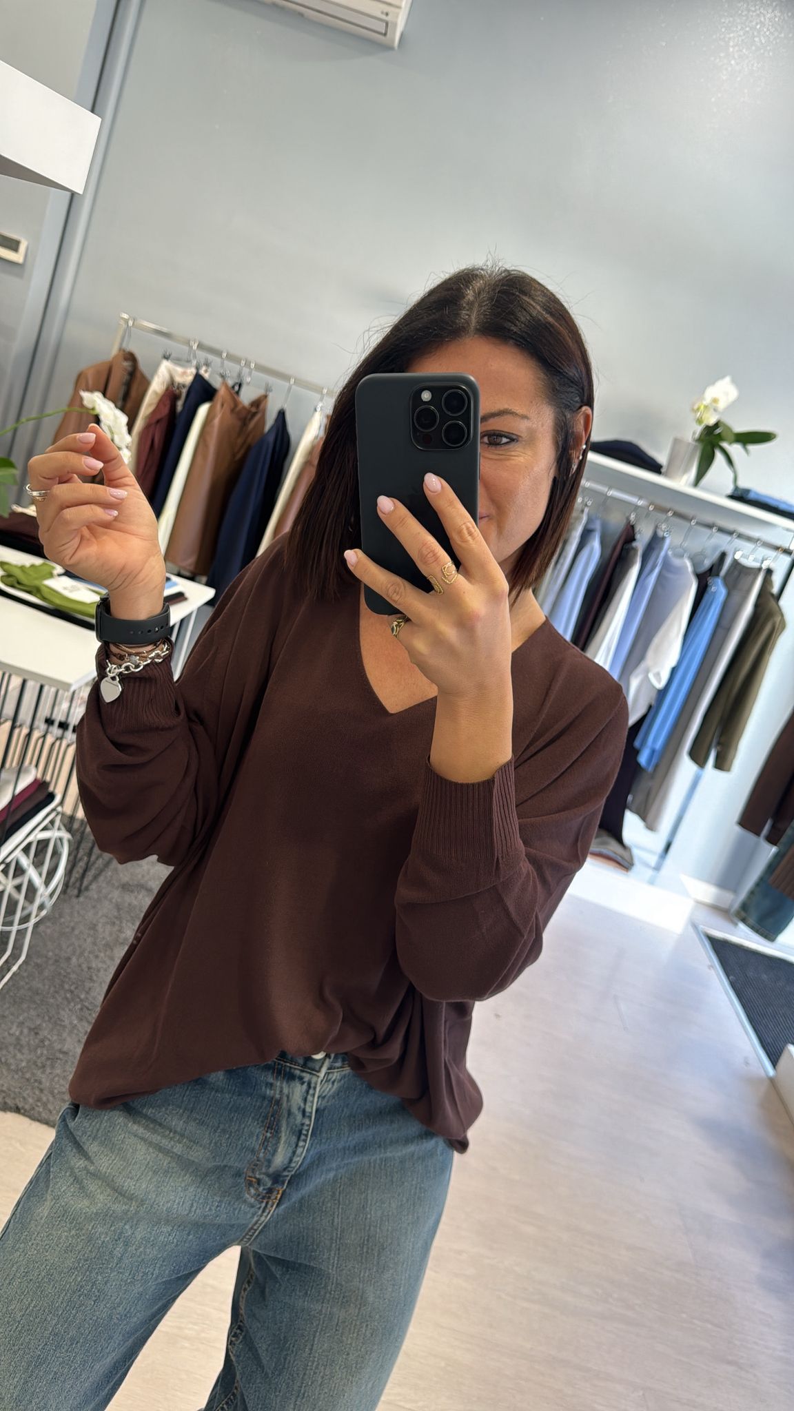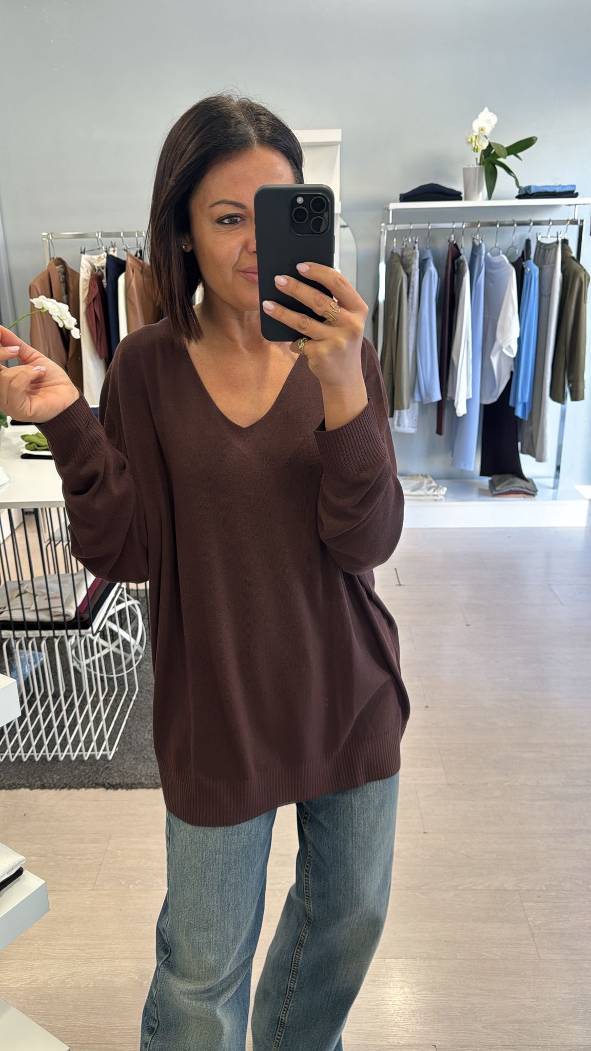 Maglia Kontatto, modello over con scollatura a V, lunghezza sotto il fianco, modello dall'effetto stondato