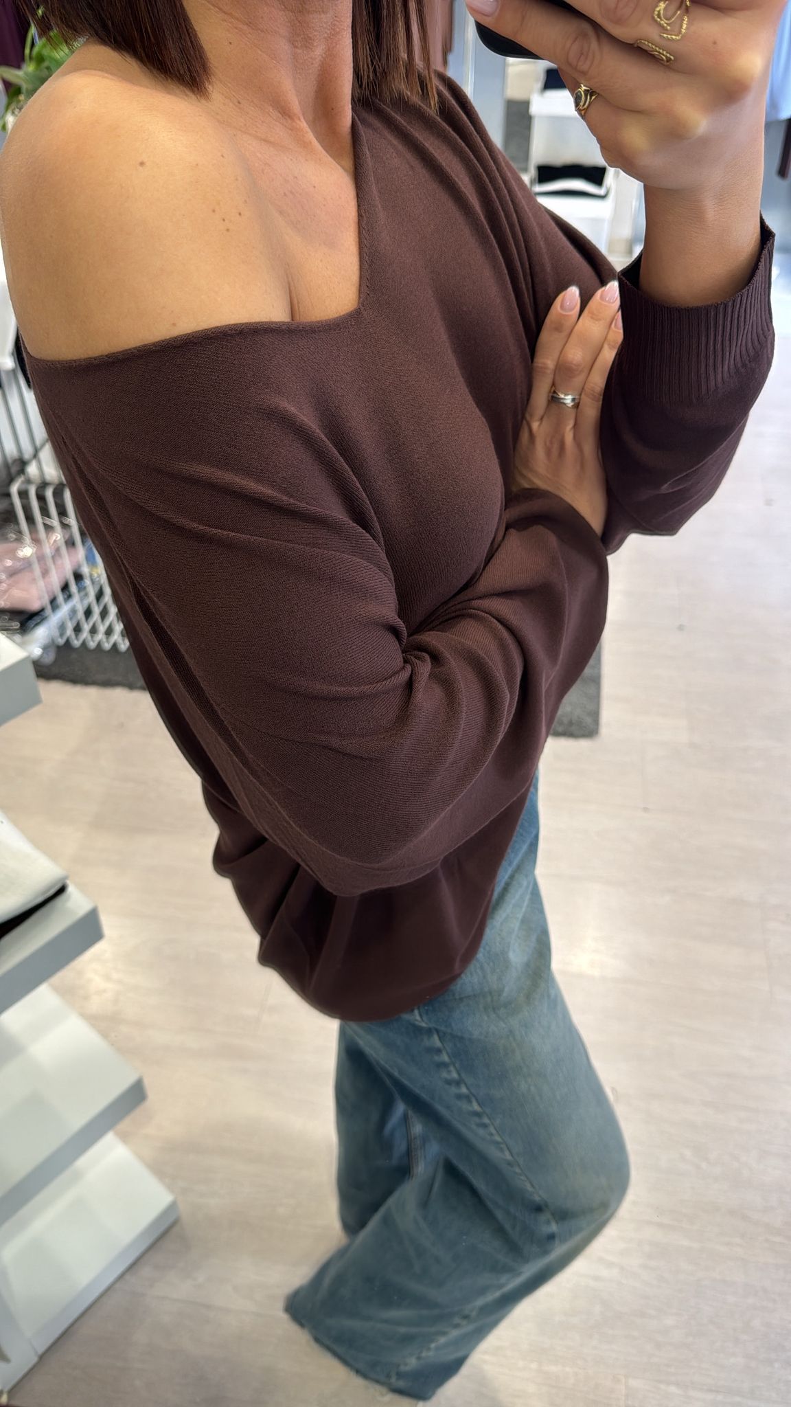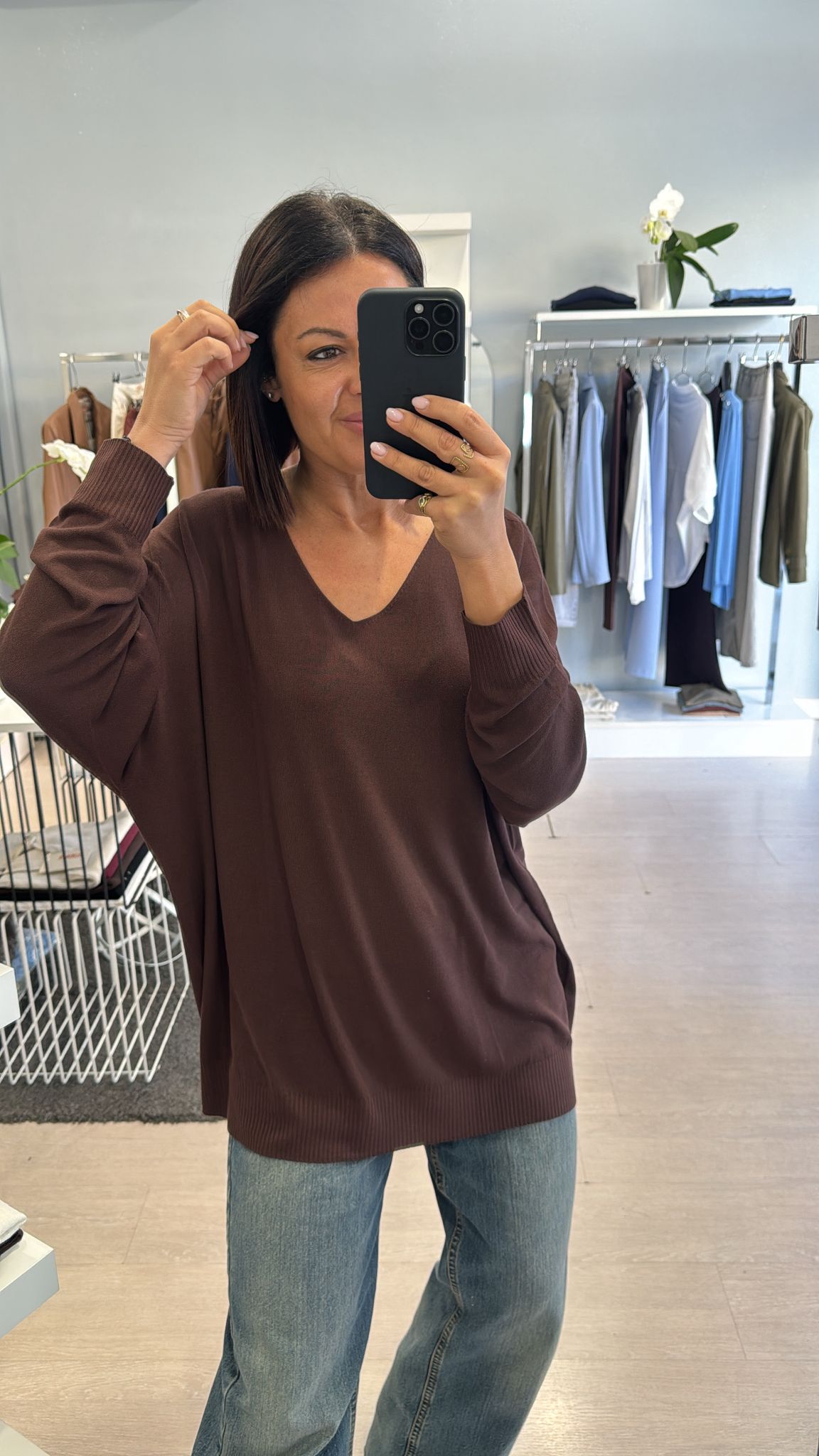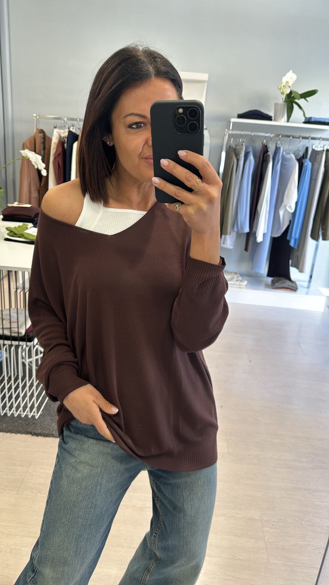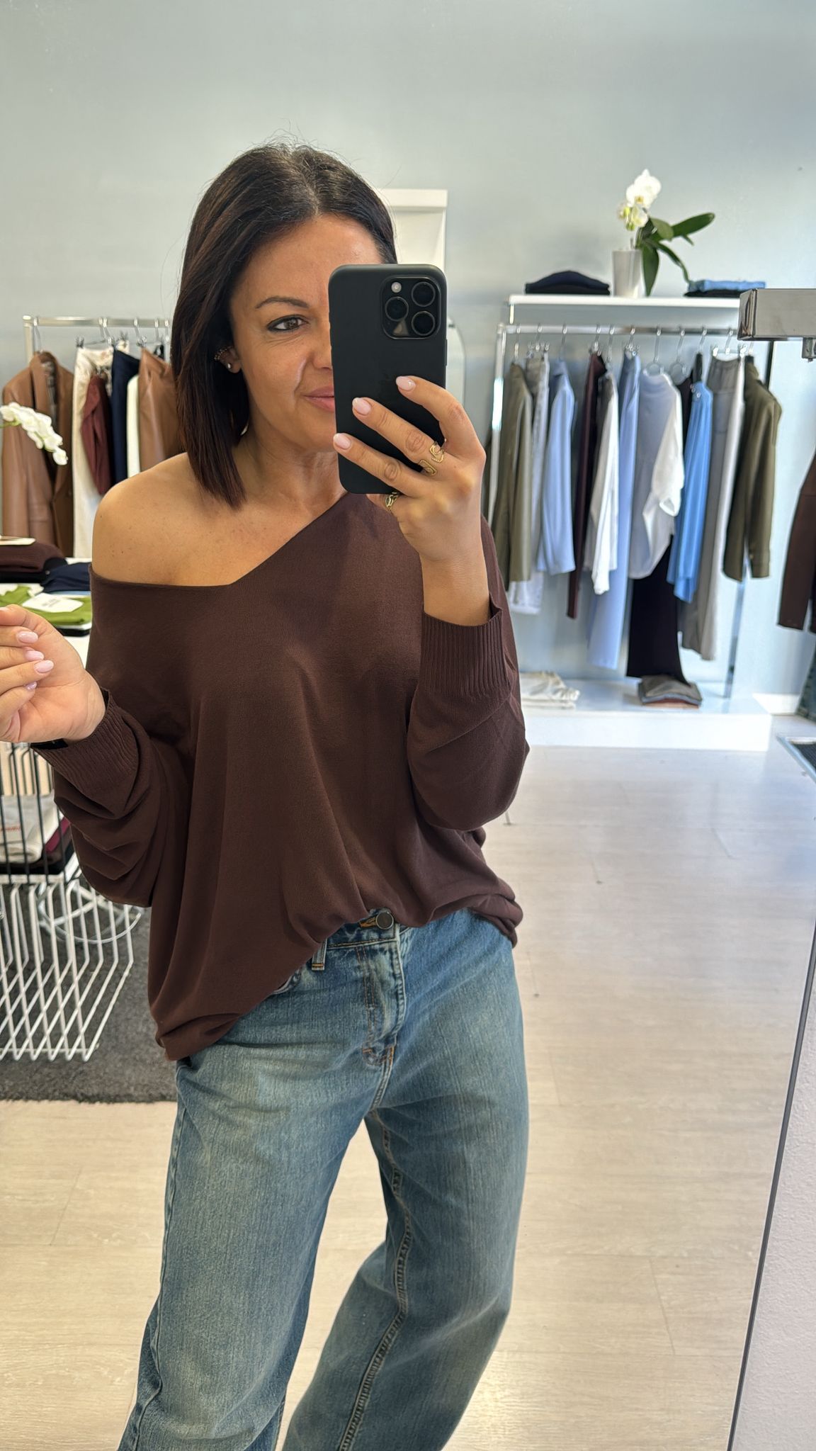 Maglia Kontatto, modello over con scollatura a V, lunghezza sotto il fianco, modello dall'effetto stondato
